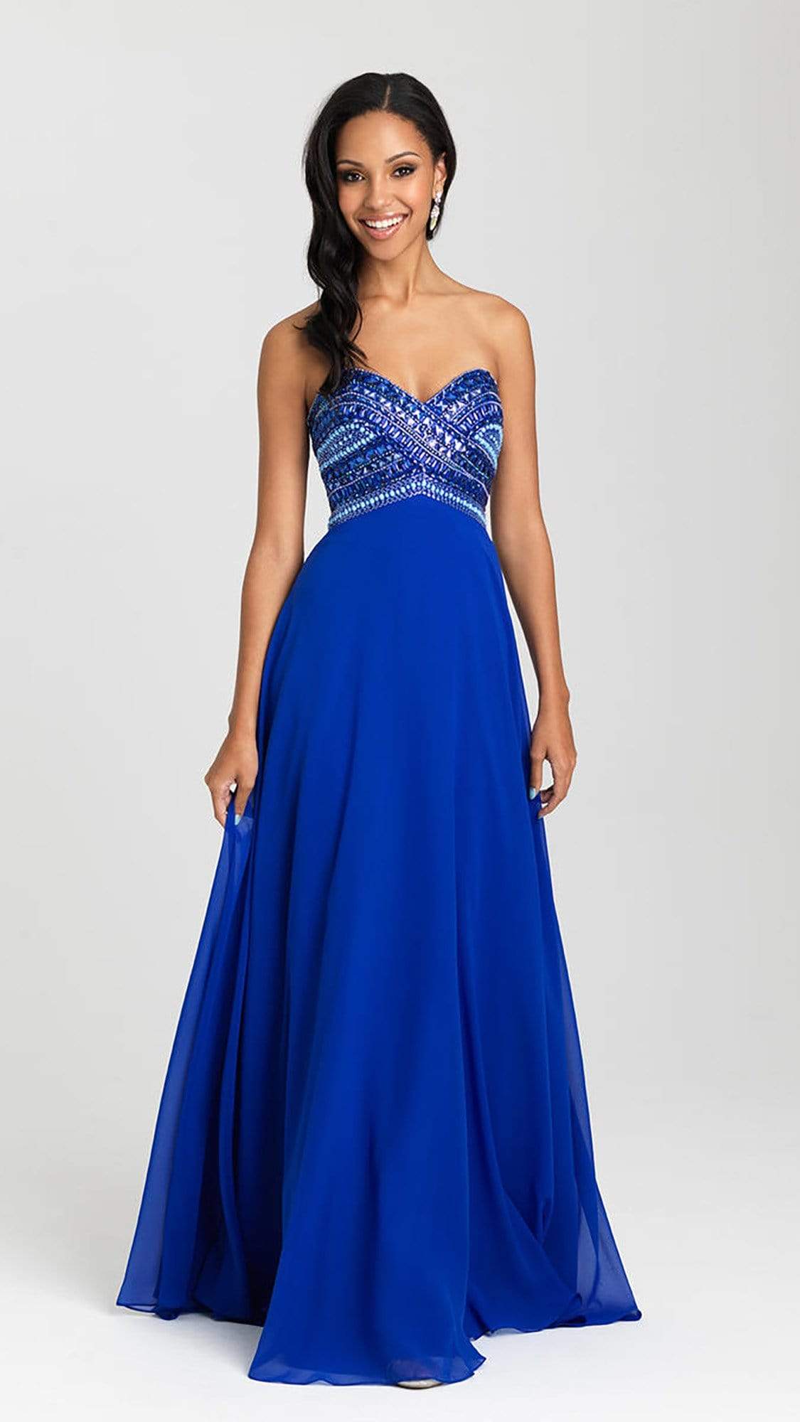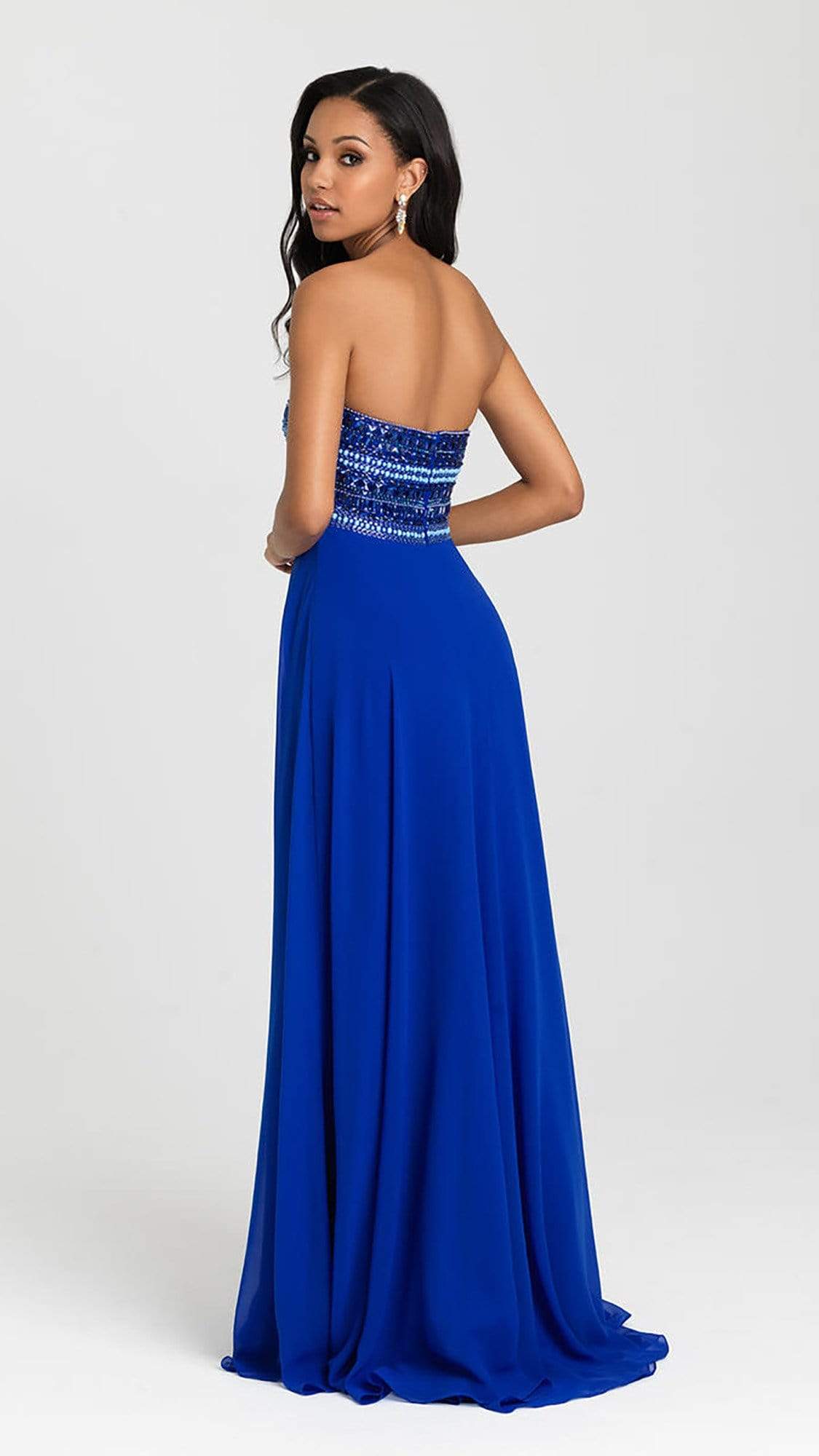 The dress flourishes a sweetheart neckline with a crust of jewels ornamenting the bodice. A zipper closure accents the open back. The inverted basque waist gives way to the fluttering chiffon skirt with a train.