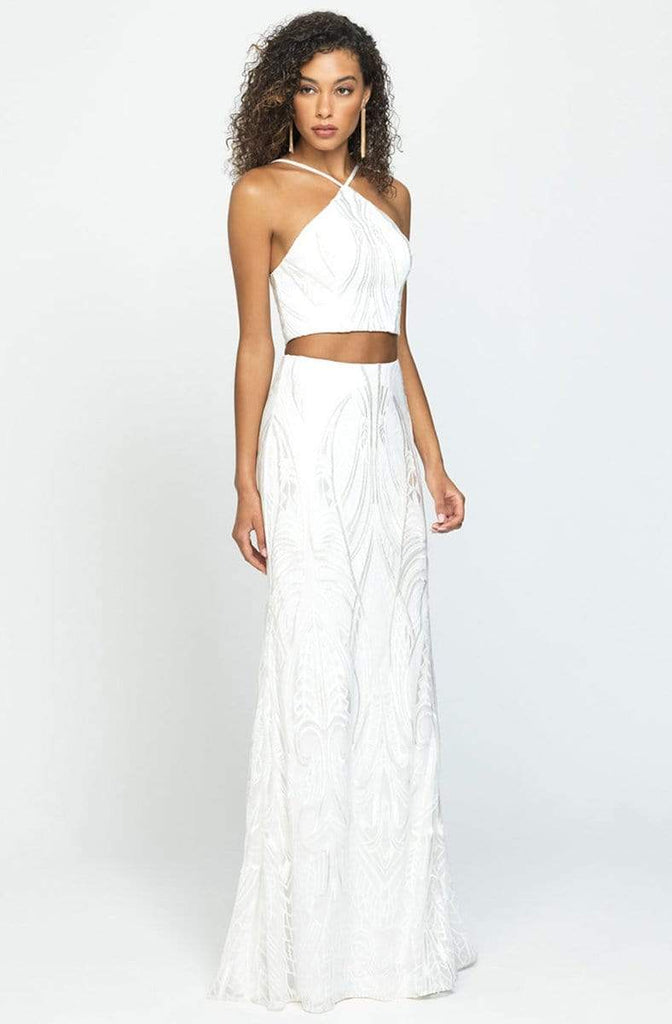 Enticingly embroidered in a spectacular motif accented with shimmering sequins, this chic piece reveals an inverted halter neckline on a cut-in cropped top bodice. Framed with spaghetti straps connecting to a mid-open back, the elaborately ornate sheath skirt flows down to the floor with a sweep of train. Model is wearing the White color.