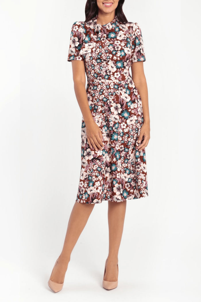 Bloom with loveliness in this floral gorgeous dress from Maggy London G4764M. This dress is cut in knee-length and has an A-line silhouette with a mock neck tie detail and side pockets. It is made with scuba crepe fabric all over and features short sleeves and a jewel neckline. Look sophisticated and mature in this simple yet chic Maggy London. At Couture Candy, looking gorgeous and making head turns have been made easy by our discount dresses on sale from hottest and trendiest evening gowns, special occasions, prom dresses, formal gowns, mother of the bride, sweet 16, and cocktail dresses. Model is wearing rusett tea