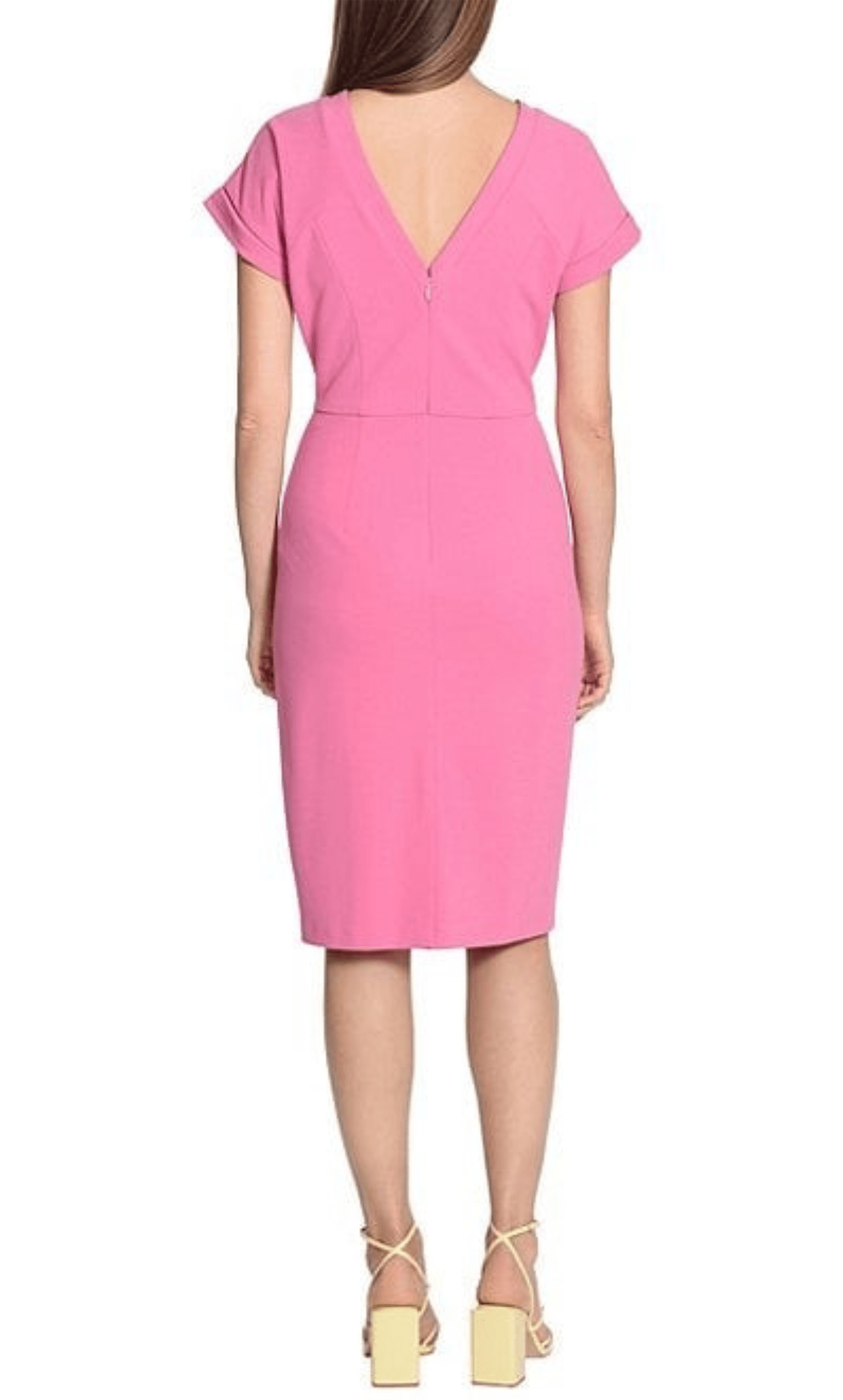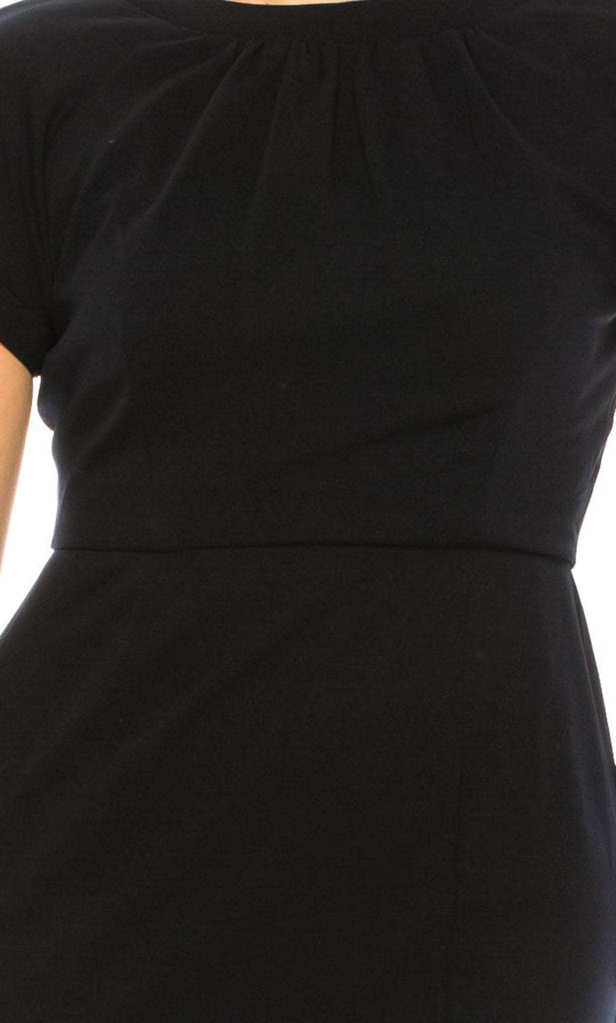 Stand out on every occasion with this classic creation by Maggy London G5309M. The dress is crafted from scuba crepe with princess seams detailing, featuring short sleeves and a shirred jewel neckline. The back displays a deep v-shaped cut closed by a center zipper and vent slit. A fitted sheath skirt cascades to the knee length hem. Simplicity and grace as defined by Maggy London G5309M dress. Models are wearing the Rose and Twilight colors.
