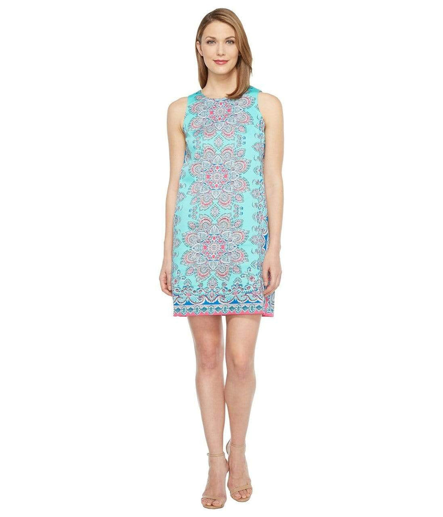 Feel the warmth of the compliments navigating your way when you don this stylish Maggy London T2648MNR creation. Elaborately printed with a floral-like medallion scarf design on a cotton fabric, this refined piece shows a jewel neckline and a full back on a sleeveless bodice. Sculpting with grace along the female form, the sheath skirt molds down to a short hemline. Feel like a chic maven in this captivating Maggy London masterpiece.