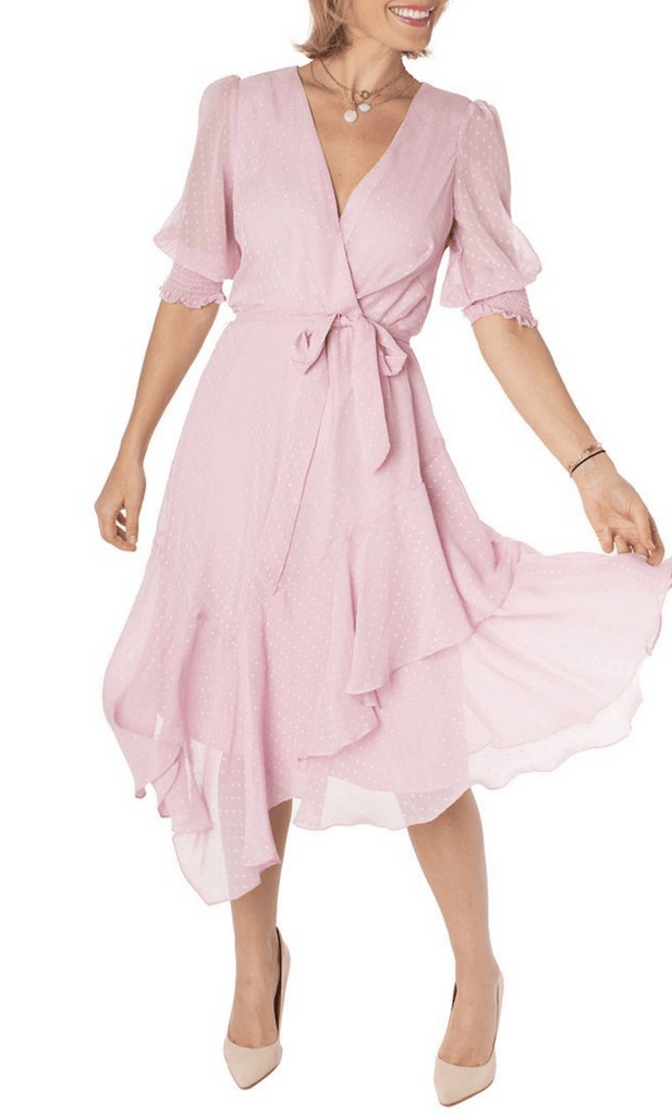 | Details: | Polka-Dot Print, Elbow-Length Puff Sleeve, Faux Wrap Bodice, Layered, Full Back, Back Zipper, Removable Sash Belt |