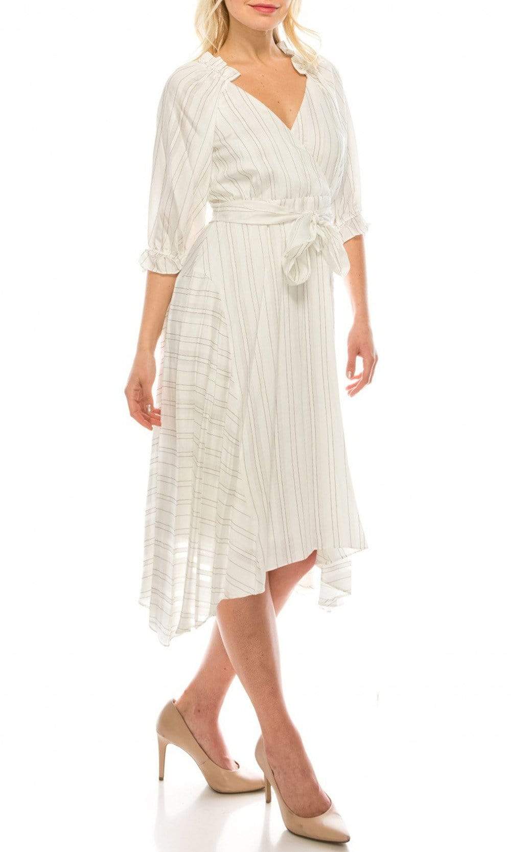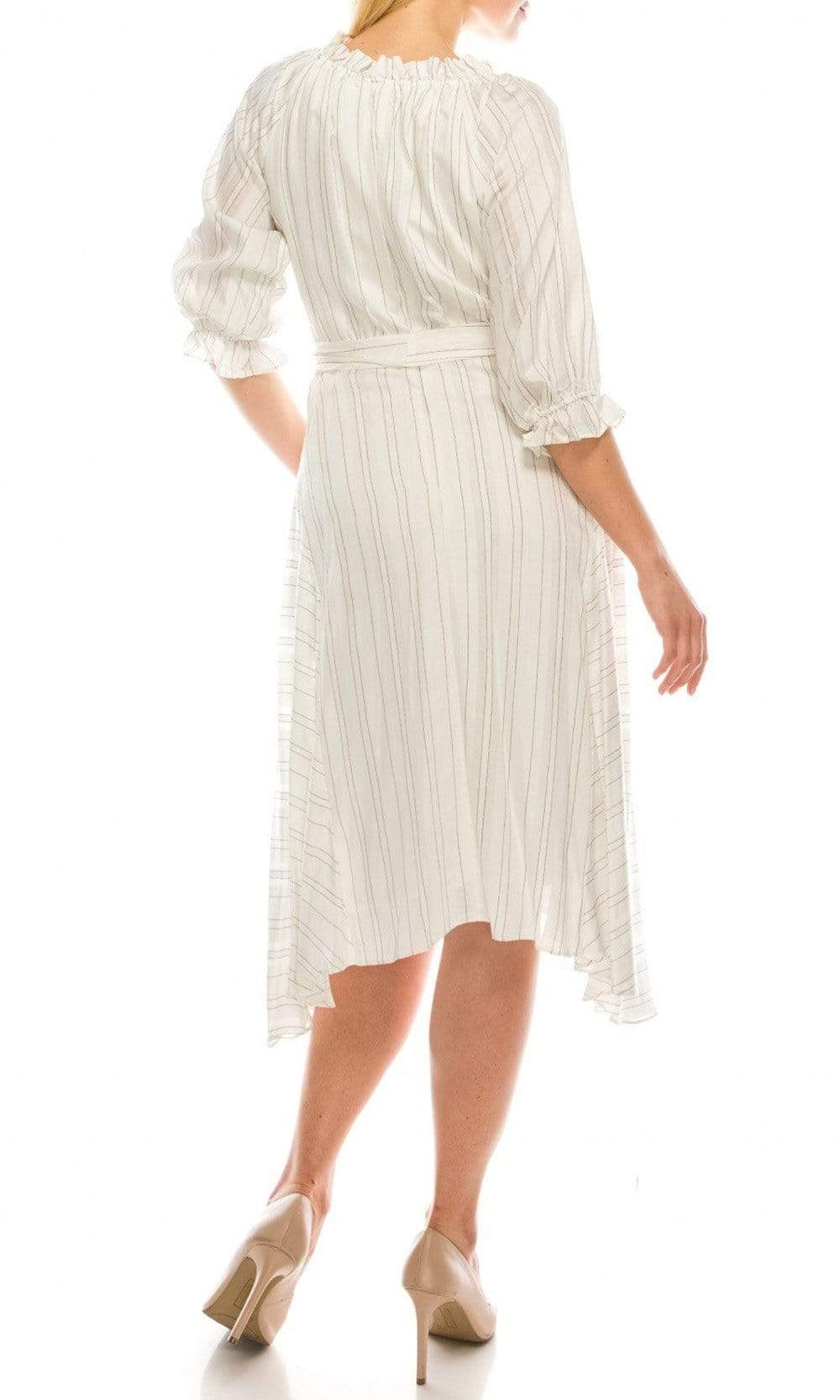 | Details: | Pinstripe Print, Ruffled Trims, Quarter Sleeves, Self-Tie Waist, Full Back, Collar Cinched Detail, Handkerchief Hem, Tea Length |