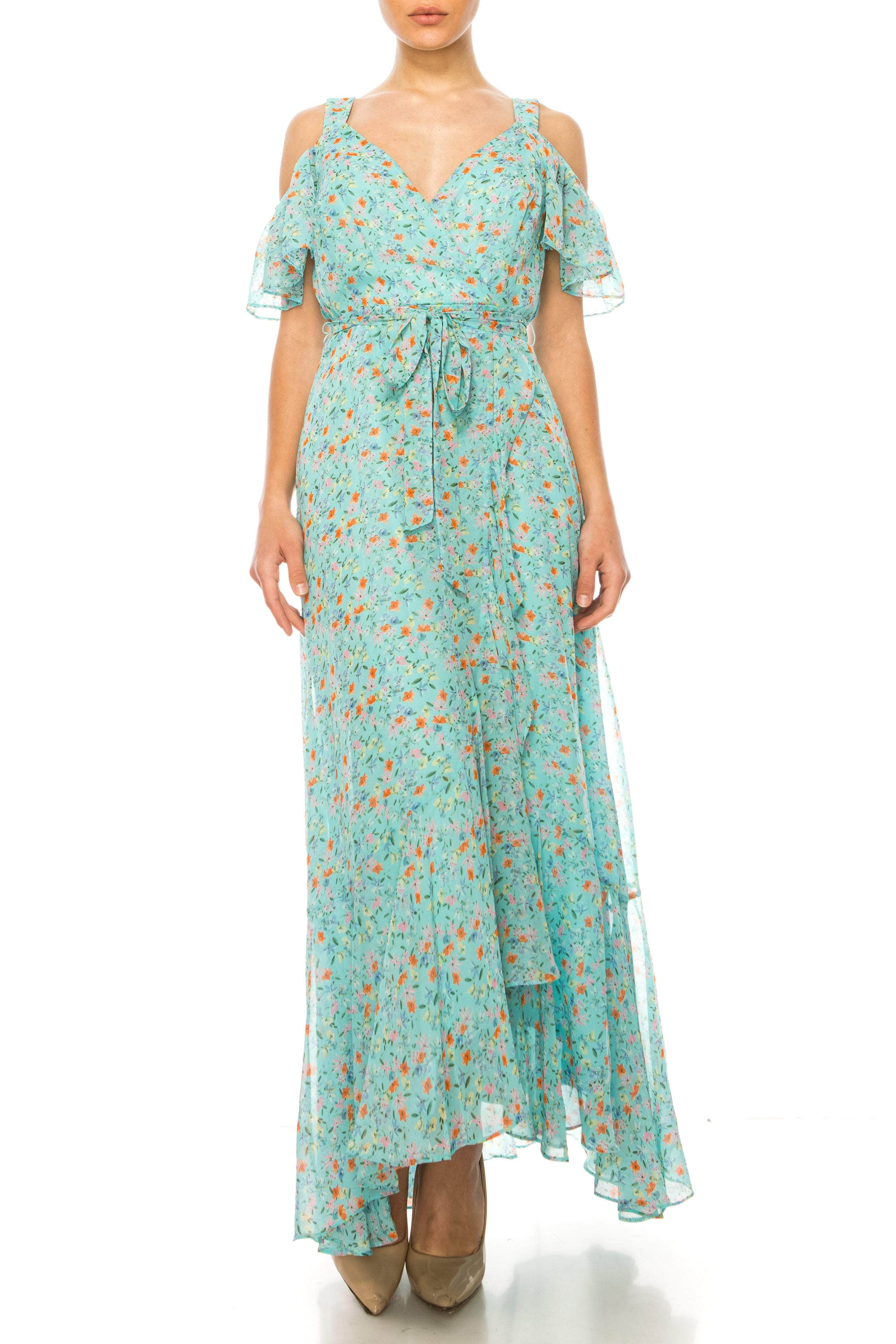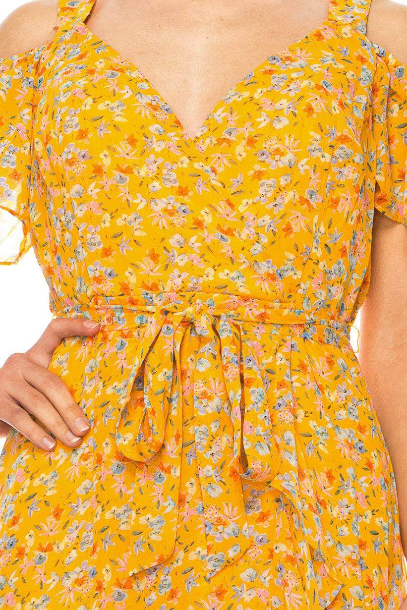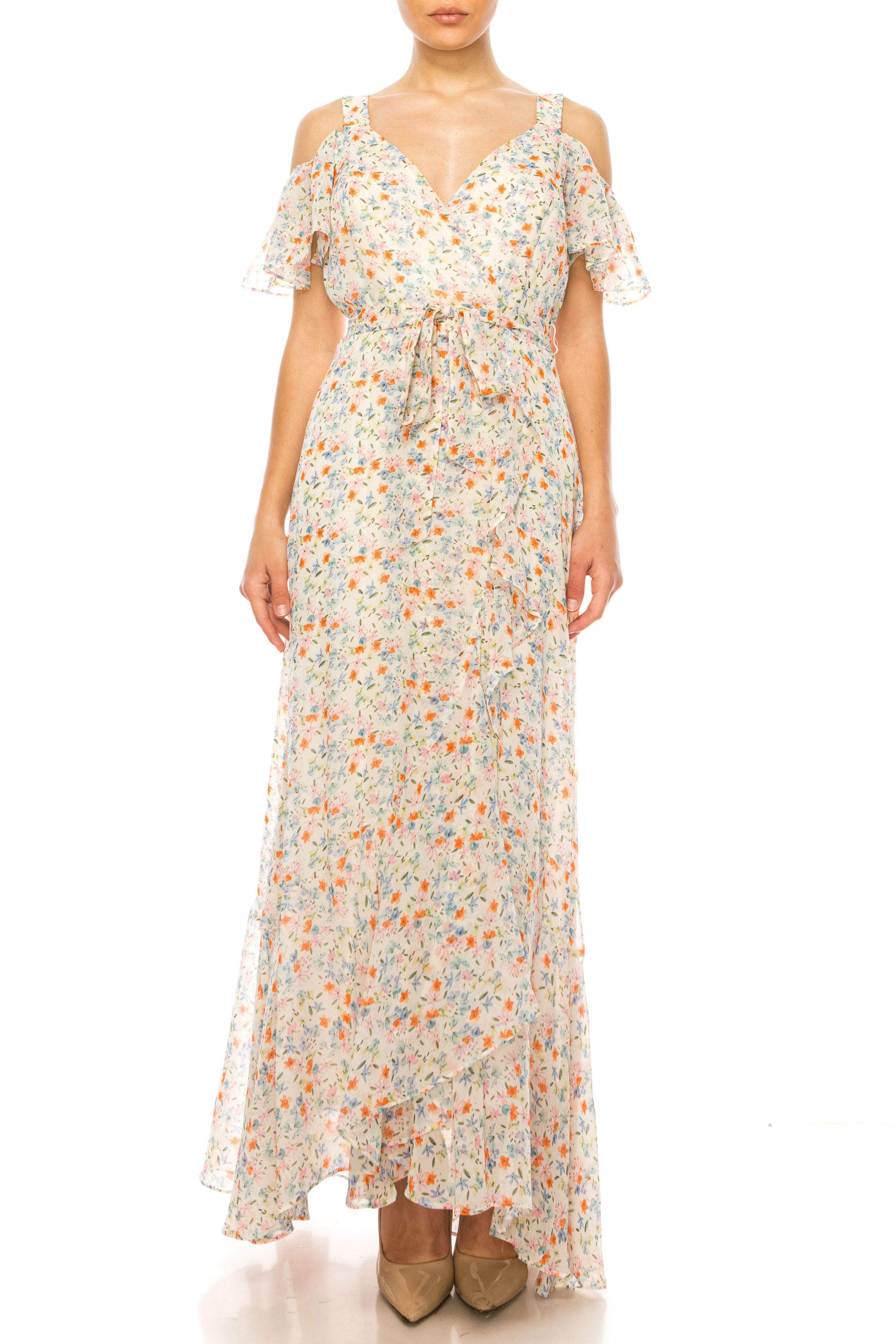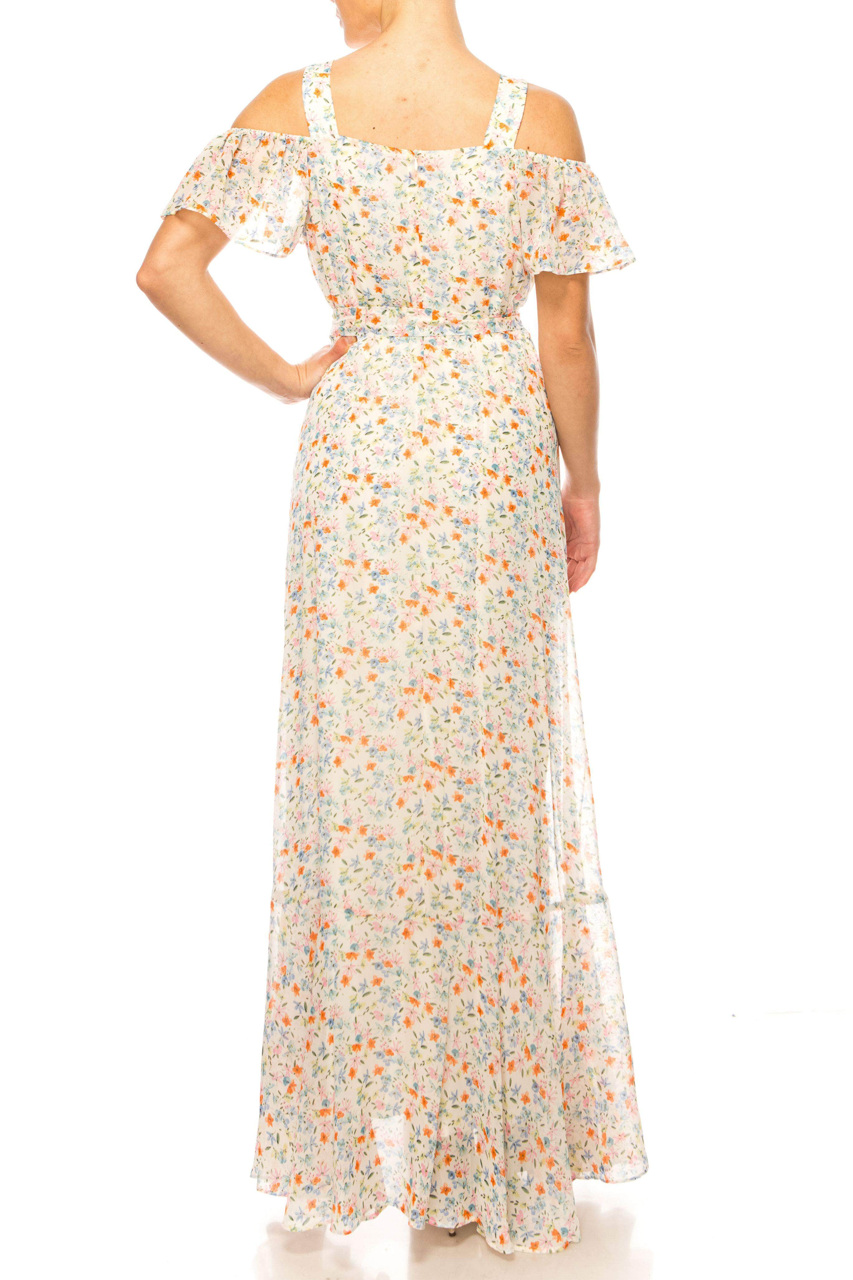 | Details: | Flutter Sleeves, Floral Print, Cold Shoulder Detail, Tie Waist, Faux Wrap Bodice, Square Back, Concealed Zipper Closure, High Low Hem |