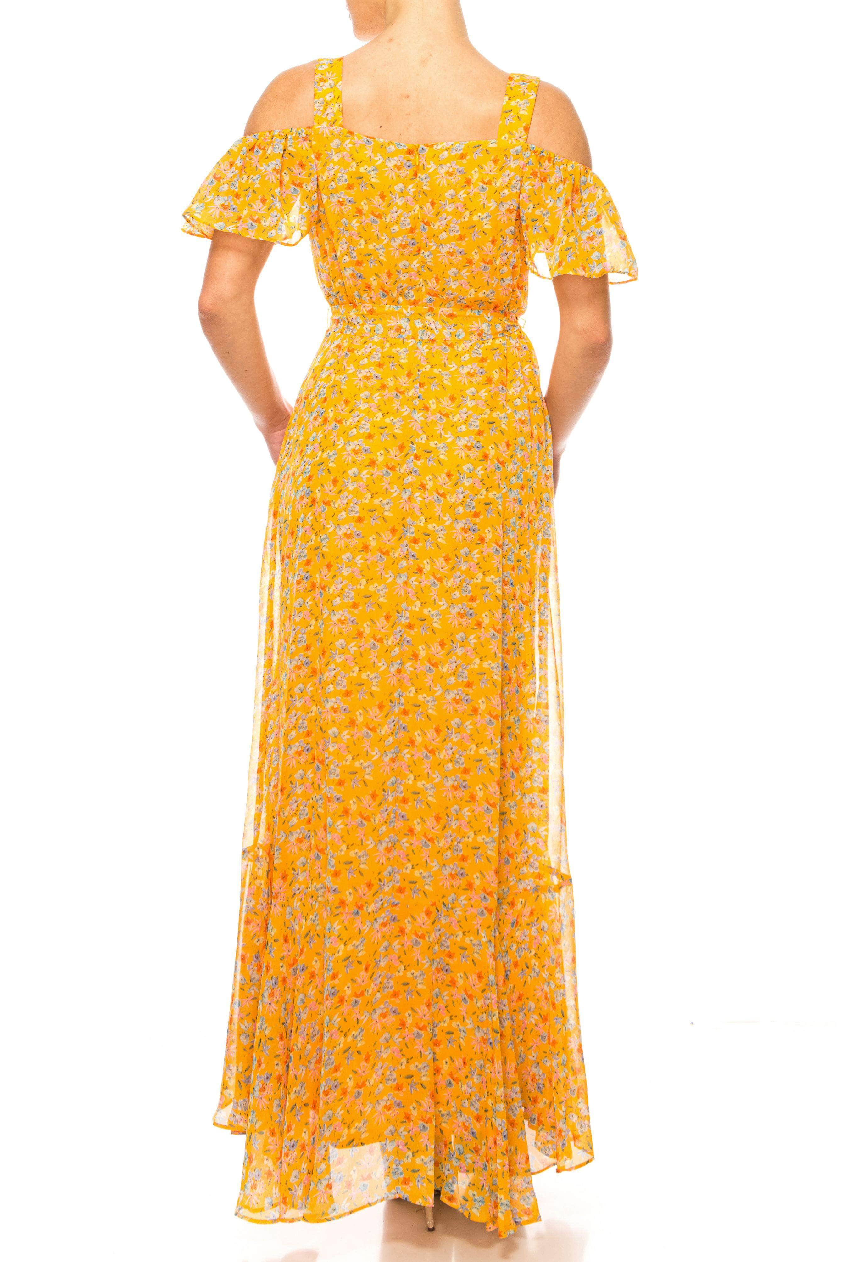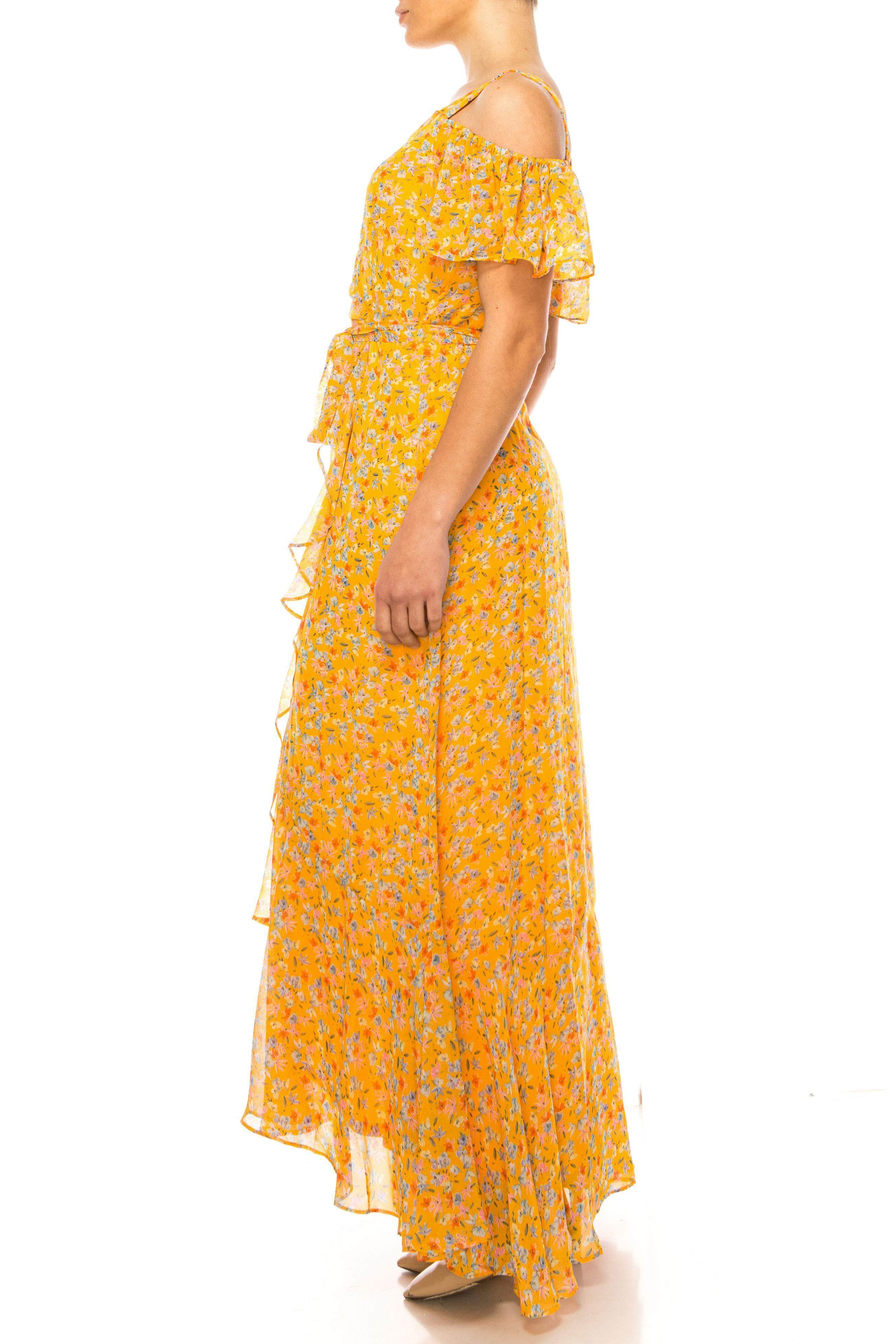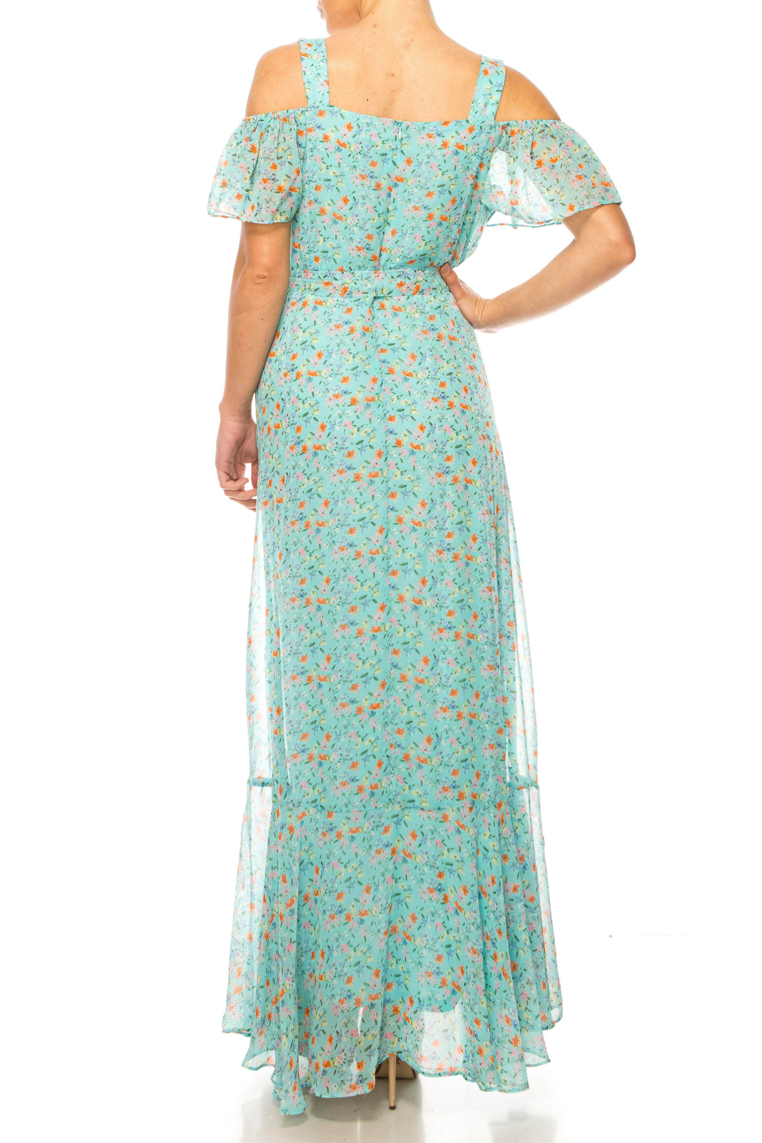 | Details: | Flutter Sleeves, Floral Print, Cold Shoulder Detail, Tie Waist, Faux Wrap Bodice, Square Back, Concealed Zipper Closure, High Low Hem |