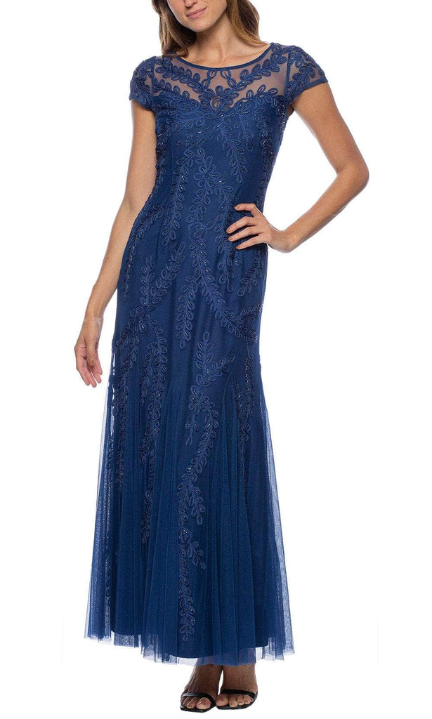 Marina 267853 - Cap Sleeve Embellished Evening Gown Leave everyone mesmerized with the regal beauty of this ethereally Marina 267853 creation. Flaunting a silhouette with a luxurious mesh fabric adorned with intricate foliage embroidery and shimmering embellishments, this ensemble crafts an illusion scoop neckline. Flaunting an ornate sheer full back with a zipper closure, the tantalizingly made beauty forms a trumpet skirt design that fits and flutters with as it traverse down to a full length hemline. Infuse your special event with stellar style in this Marina 267853 masterpiece. Model is wearing the Navy color.