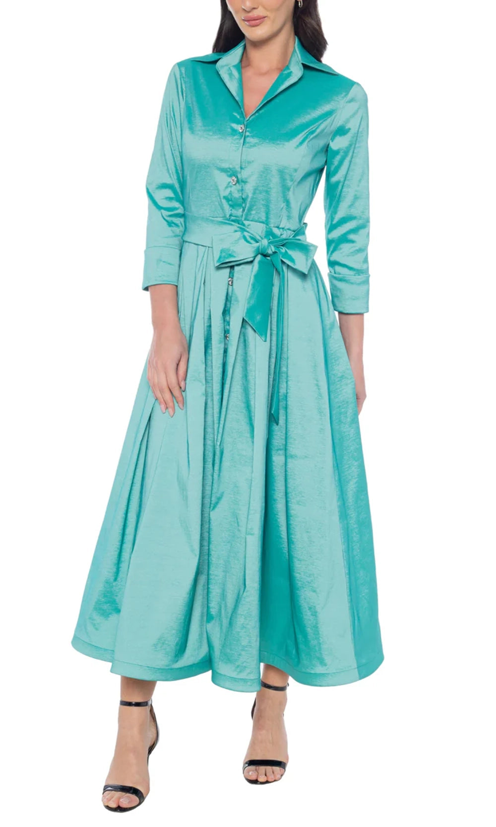 A polished silhouette defines this elegant Marina 268350 midi dress, combining structured tailoring with fluid movement. The collared v-neckline frames the look, while the button-down front creates classic appeal. A self-tie belt at the waist allows customizable shaping, bringing focus to the natural waistline. The three-quarter sleeves add a timeless detail, balancing the pleated A-line skirt that moves gracefully. Marina 268350 embodies effortless elegance and versatile wear, making it a reliable wardrobe piece. Models are wearing Champagne, and Sage colors.