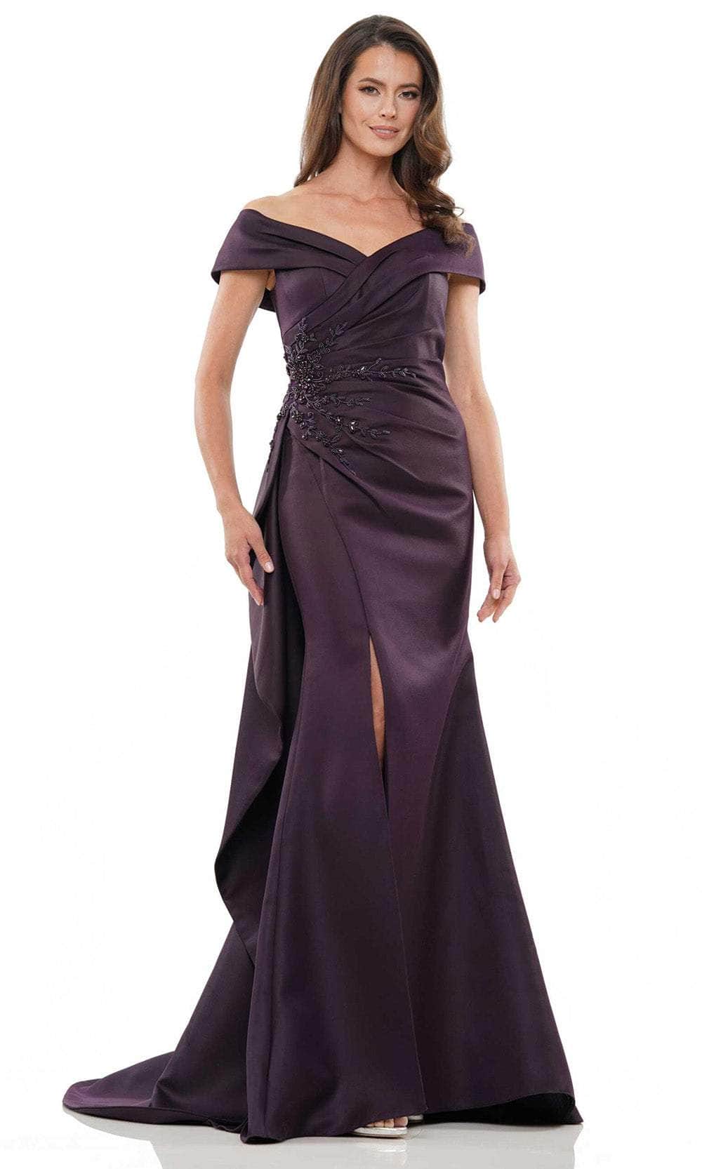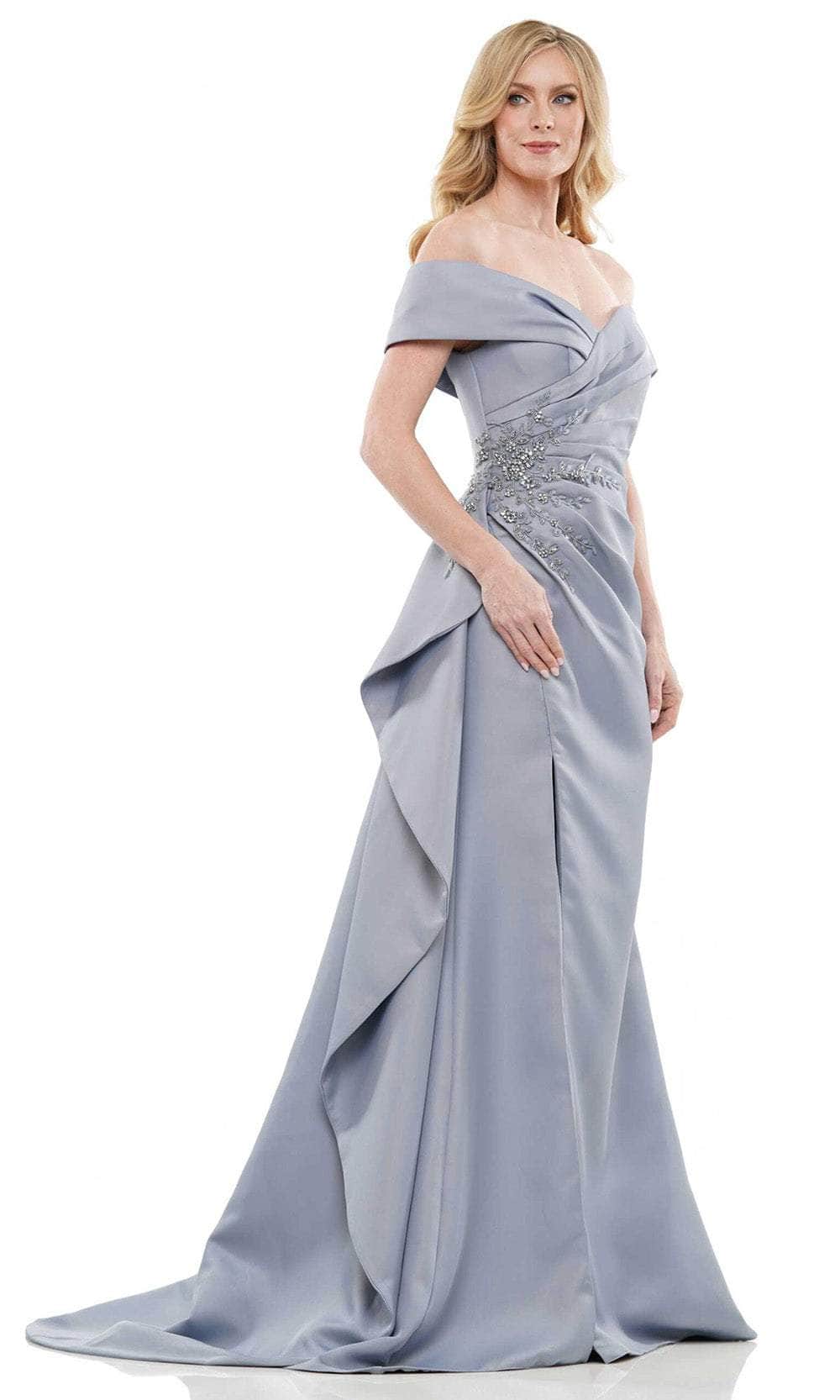 Walk in glamour and let all heads turn on you in this creation by Marsoni by Colors MV1235. Tailored in double-faced satin, this elegant piece exhibits a surplice bodice with a folded off-shoulder sweetheart neckline and short sleeves. The ruching details embrace your curves, while the floral beaded applique on the side waist adds a touch of luxury. Additional features are the side ruffle draping, front high leg slit, and mid-open zippered back. The skirt flawlessly glides to the floor in a magnificent trumpet silhouette and ends with a sweeping train. This Marsoni by Colors MV1235 style is a stunning choice for prom, formal or any occasion. Models are wearing the Deep Green, Wedgewood, Navy, and Eggplant colors.