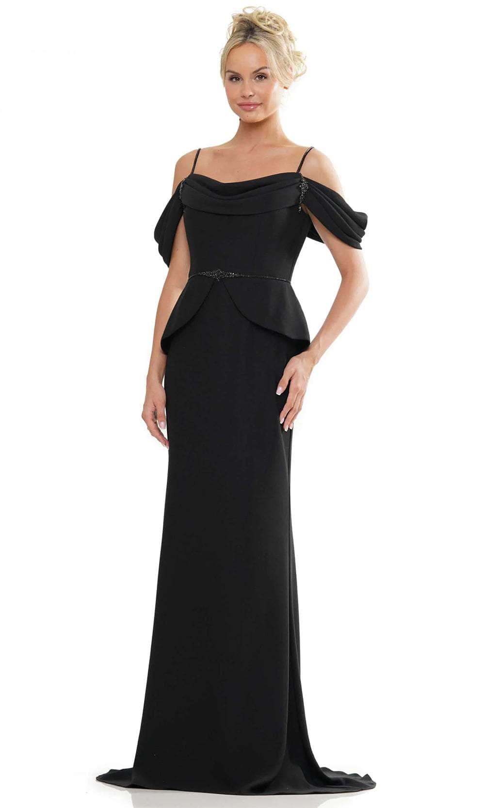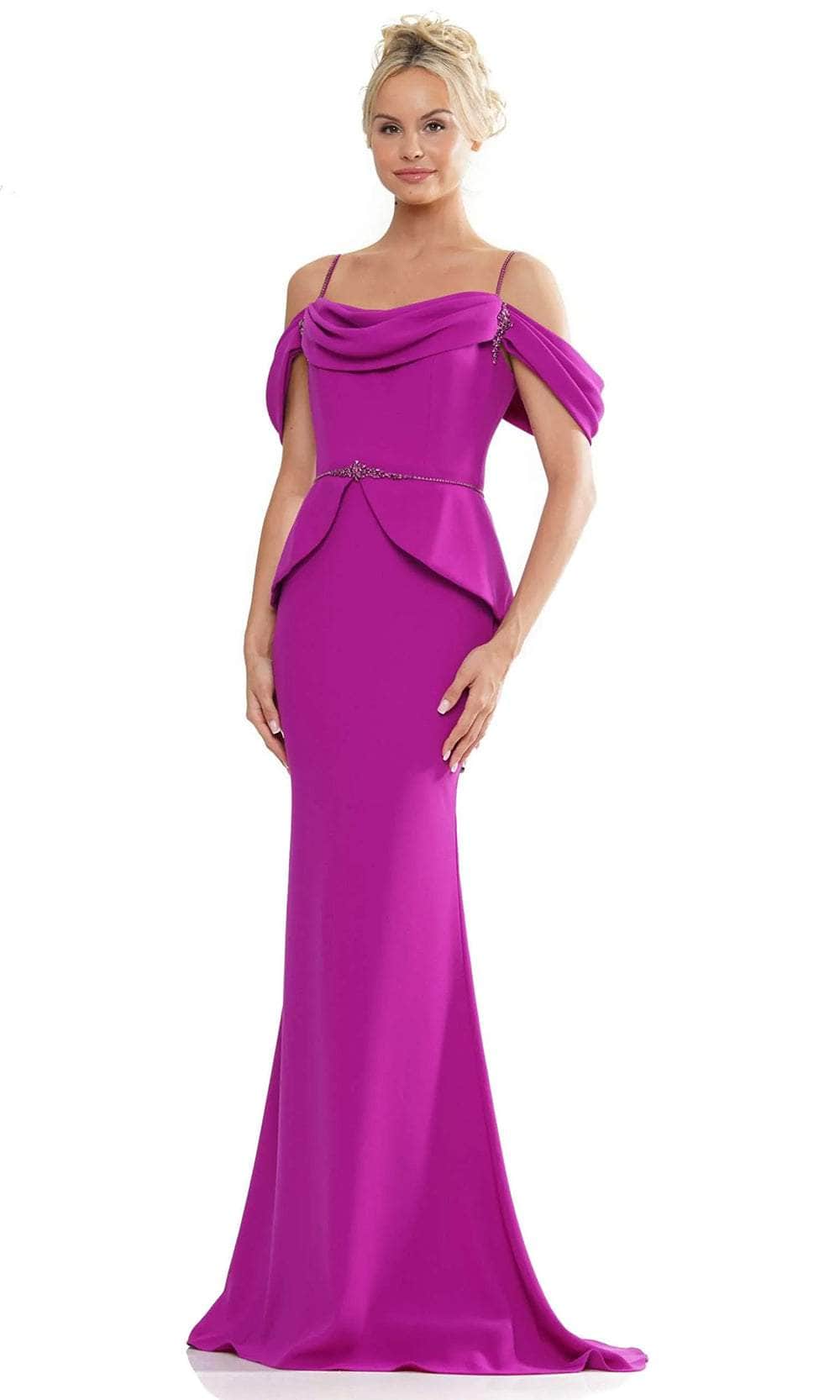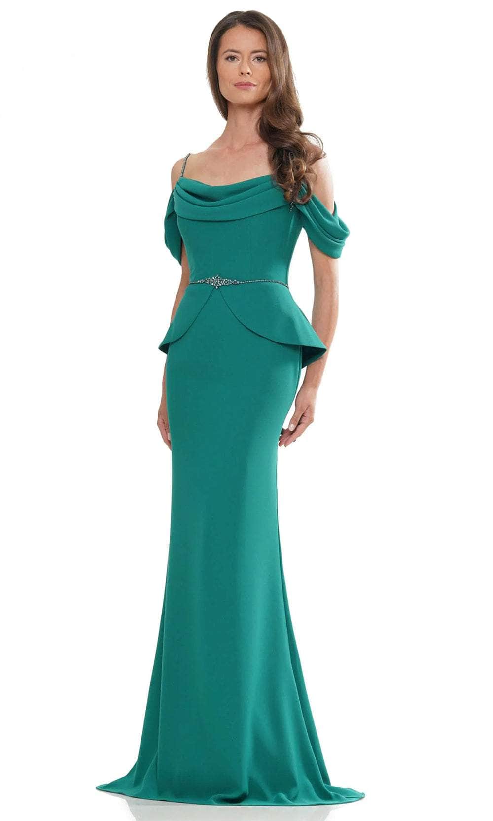 Intricately crafted to accentuate your feminine silhouette with grace and sophistication, the Marsoni by Colors MV1271 evening gown is the way to go. Constructed from lavish crepe fabric, the tailored lining delicately shapes your curves. The gown features a striking foldover accent adorned with embellished spaghetti straps and a chic cold shoulder design. With an off-shoulder neckline showcasing draped shoulder details, it exudes timeless allure. Completing the look is a mid-rise back with a concealed zipper closure. Enhanced by a bejeweled waist and peplum accent at the natural waist, the mermaid silhouette gracefully transitions into a sweep train. Elevate your evening ensemble with the Marsoni by Colors MV1271. Models are wearing the Black, Emerald, Fuchsia, and Deep Royal colors.