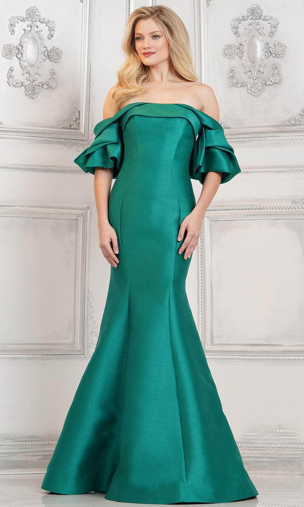 Step into elegance with the Marsoni by Colors MV1290 evening dress, crafted to enhance your feminine allure. Luxurious Dupioni fabric, paired with a tailored lining, gracefully sculpts your curves for a flattering silhouette. The gown features a foldover detail with draped sleeves, adding a touch of sophistication to the ensemble. Showcasing an off-shoulder neckline that exudes timeless charm, the midrise back boasts a concealed zipper closure for a seamless finish. Embrace the allure of the mermaid silhouette, which elegantly cascades into a sweep train, ensuring a captivating entrance at any formal event. Radiate sophistication in the Marsoni by Colors MV1290 evening dress. Models are wearing the Black, Emerald, Fuchsia, and Amethyst colors.