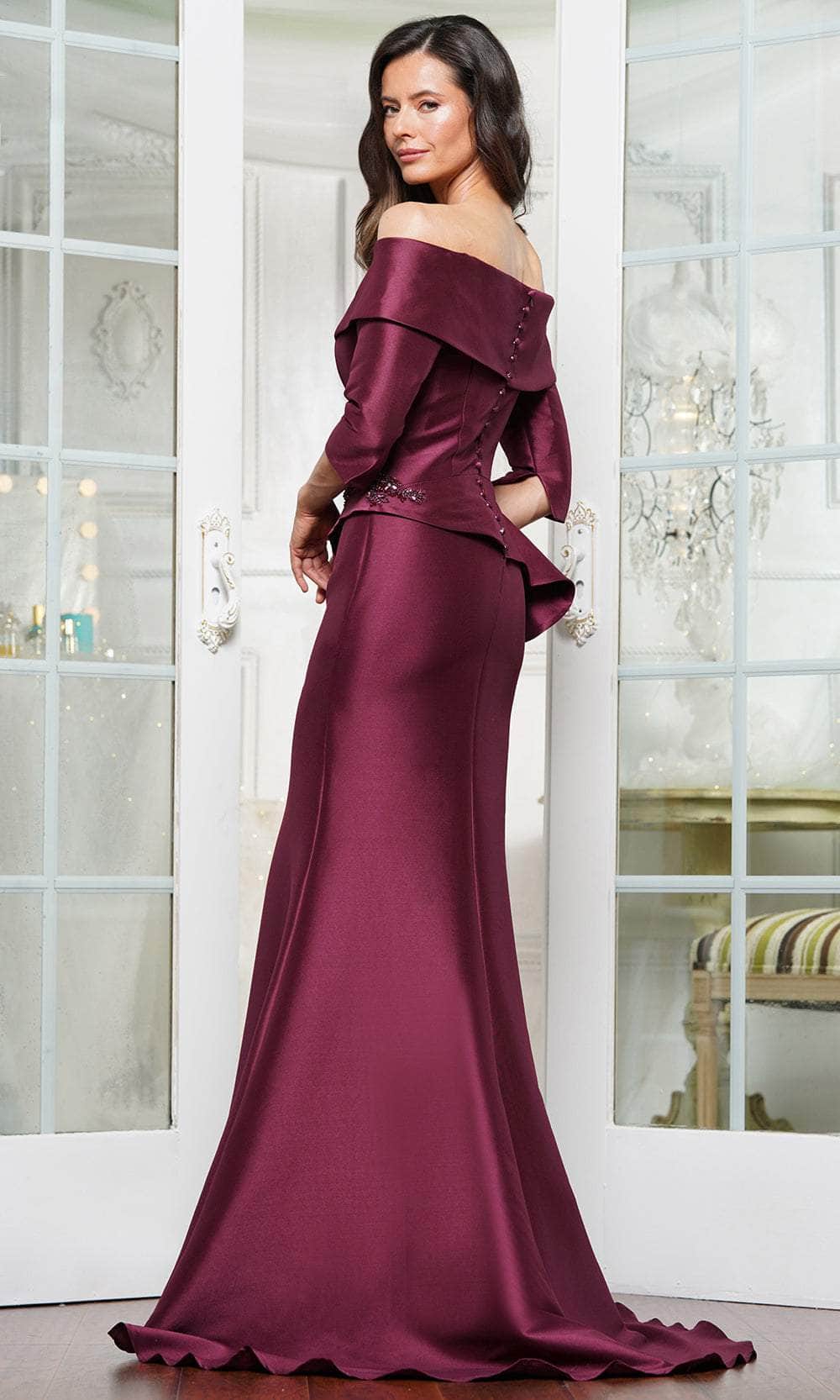 | Details: | Bead Embellished, Off-Shoulder, 3/4 sleeves, Seams, Fitted Bodice, Buttons, Peplum, Train, |