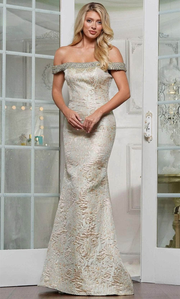 Step into elegance with the stunning Marsoni by Colors MV1346, a gown that turns every moment into a memory. This captivating design features a luxurious jacquard fabric and a stunning off-shoulder neckline adorned with jewels. The embossed silhouette creates a striking figure, while the embellished midrise back adds a touch of allure. The mermaid skirt, with its sweeping train, ensures a grand entrance. This Marsoni by Colors MV1346 creation is perfect for any special occasion, where you'll be the center of attention. Models are wearing the Sage Green and Light Gold colors.