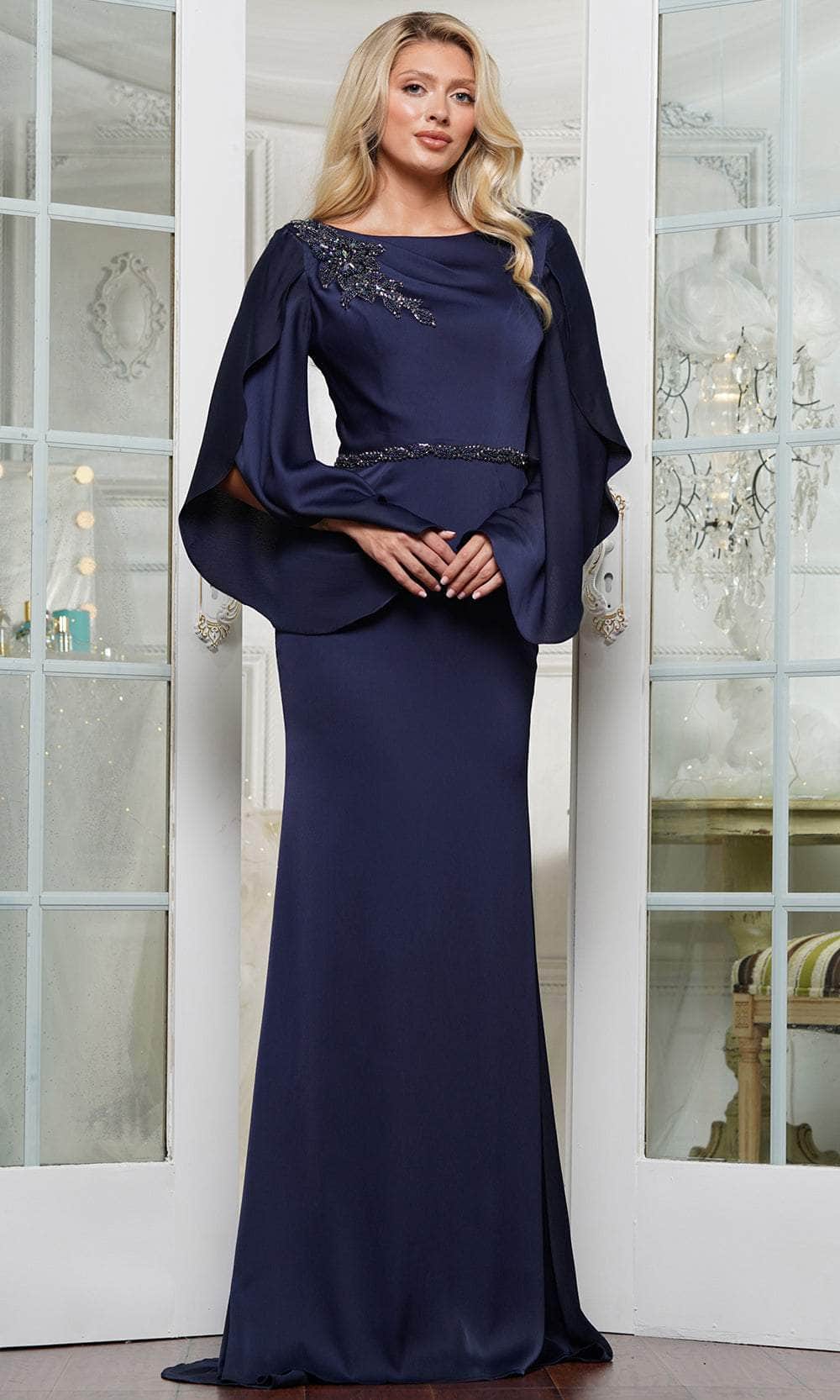 Embrace refined elegance with the Marsoni by Colors MV1348 gown. This sophisticated piece showcases a bateau neckline adorned with crystal beaded embellishments that add a luxurious shimmer. The fitted bodice leads into a sleek, floor-length column skirt, offering a timeless silhouette that concludes with a graceful train. A convenient zipper closure completes the look, making this Marsoni by Colors MV1348 a perfect choice for an evening of unforgettable glamour and poise. Models are wearing Dusty Rose, Navy, and Deep Sage colors.