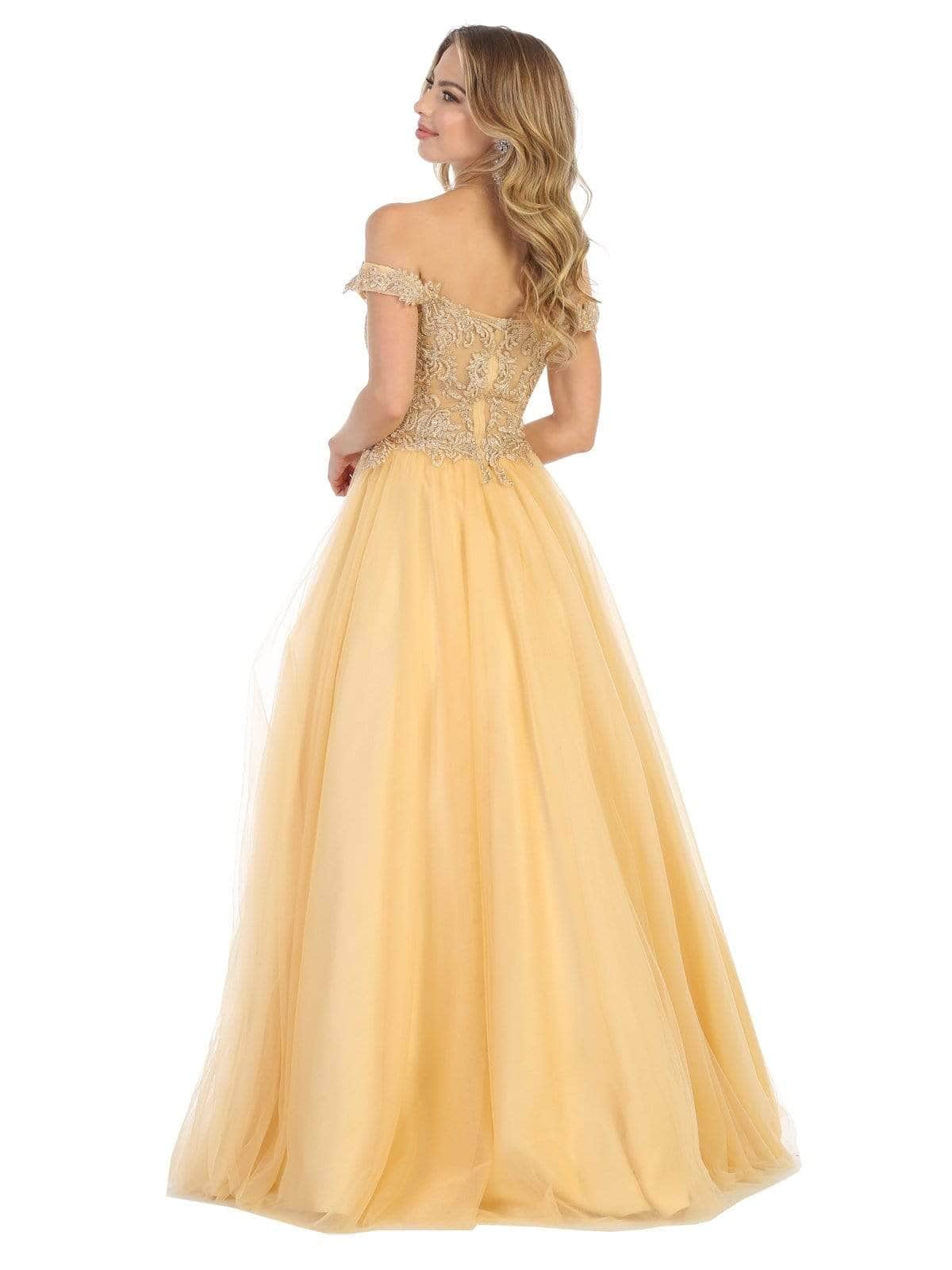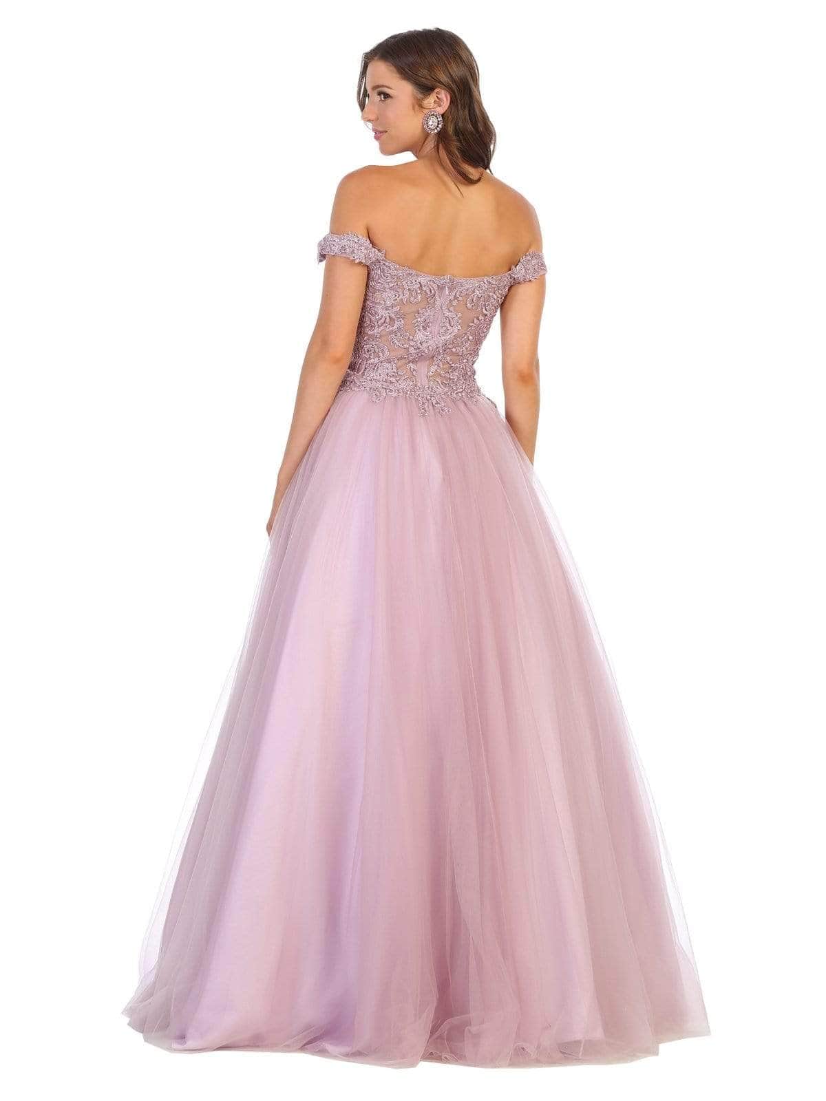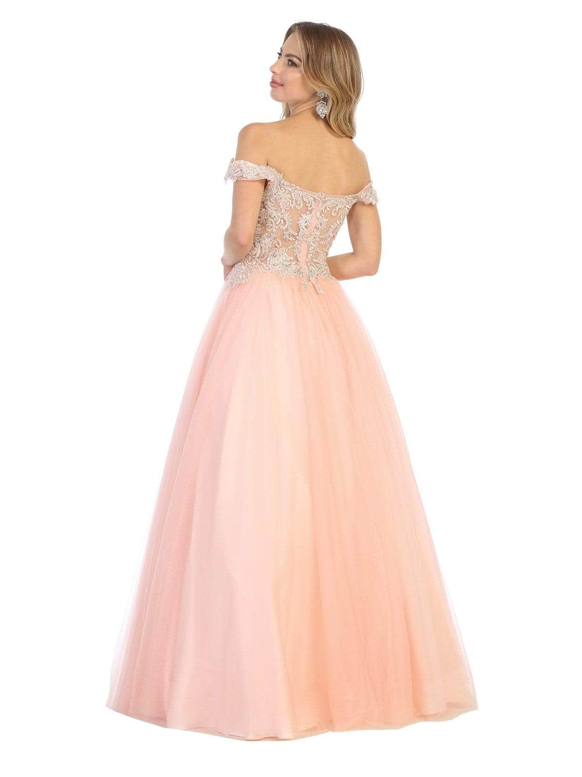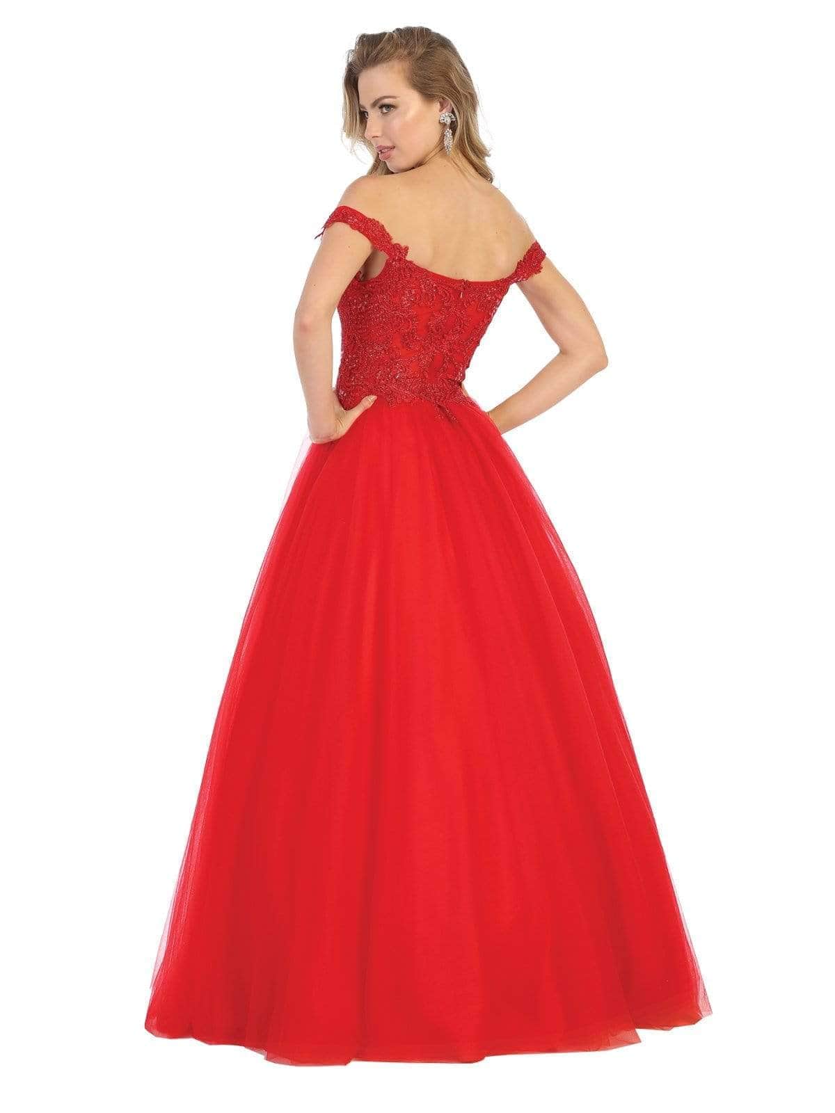 Festooned with embroidered appliques and sprinkled with rhinestones, this dress flourishes an off shoulder neckline with an illusion plunge. Designed with a sheer zipped up back, the tulle skirt cascades to the floor with a brush of train. Models are wearing the Blush, Champagne, Mauve, Red, White and Gold colors.