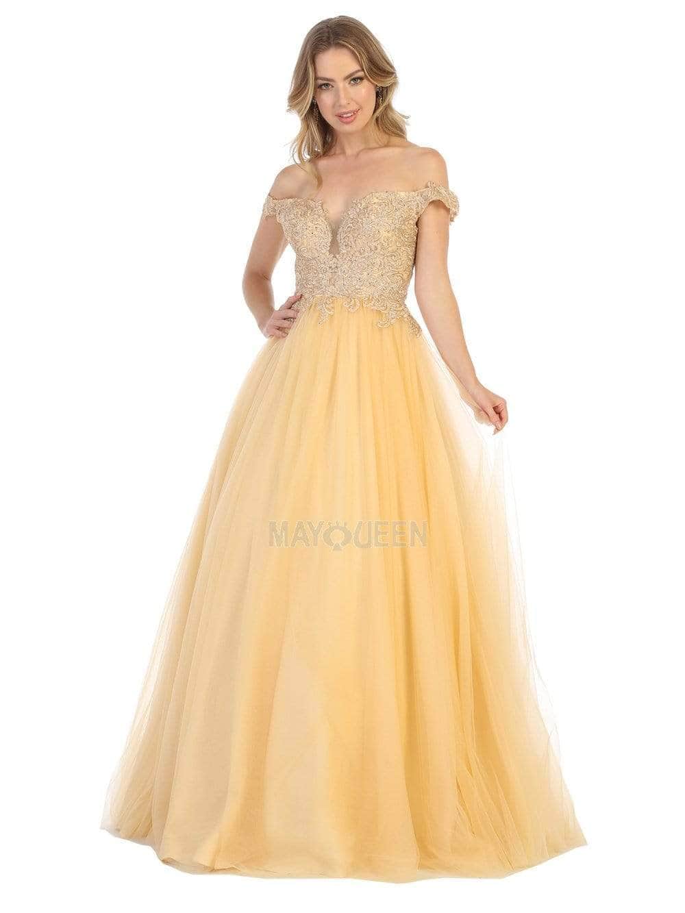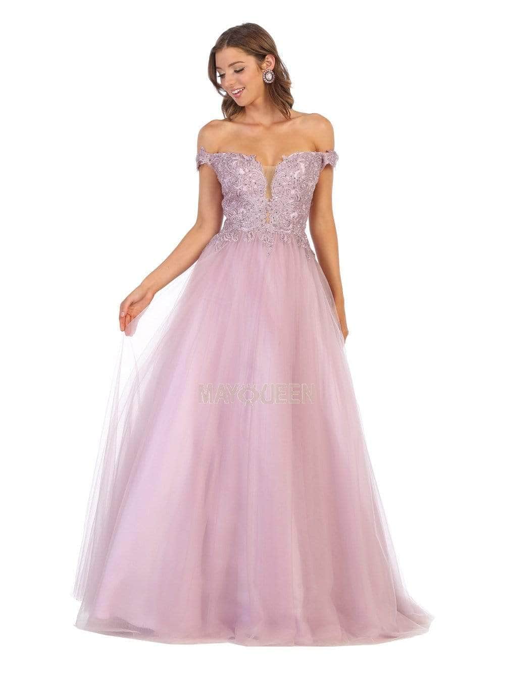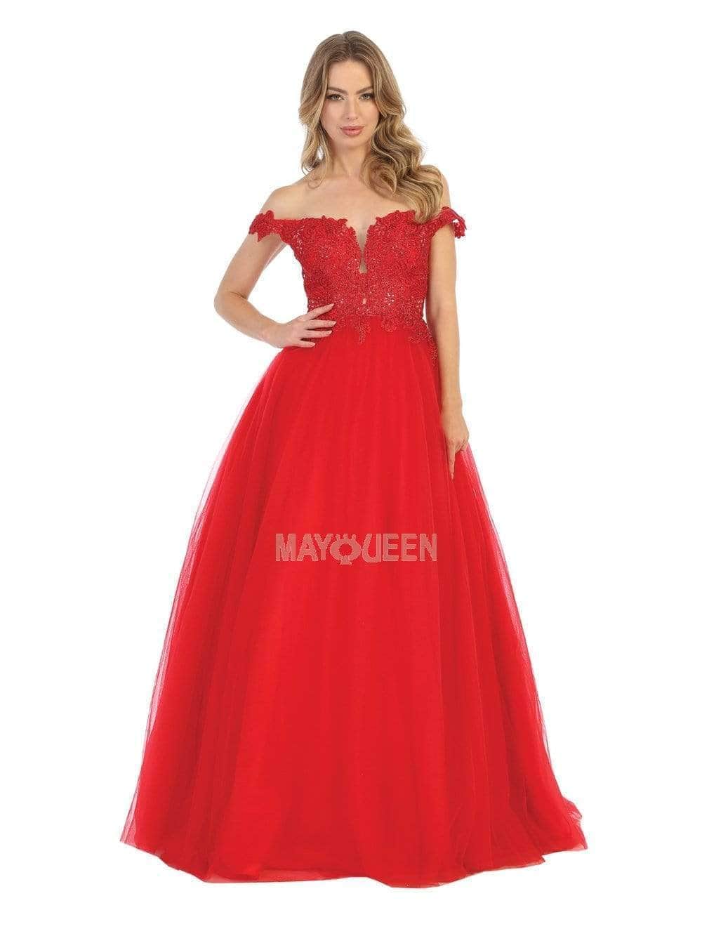 Festooned with embroidered appliques and sprinkled with rhinestones, this dress flourishes an off shoulder neckline with an illusion plunge. Designed with a sheer zipped up back, the tulle skirt cascades to the floor with a brush of train. Models are wearing the Blush, Champagne, Mauve, Red, White and Gold colors.