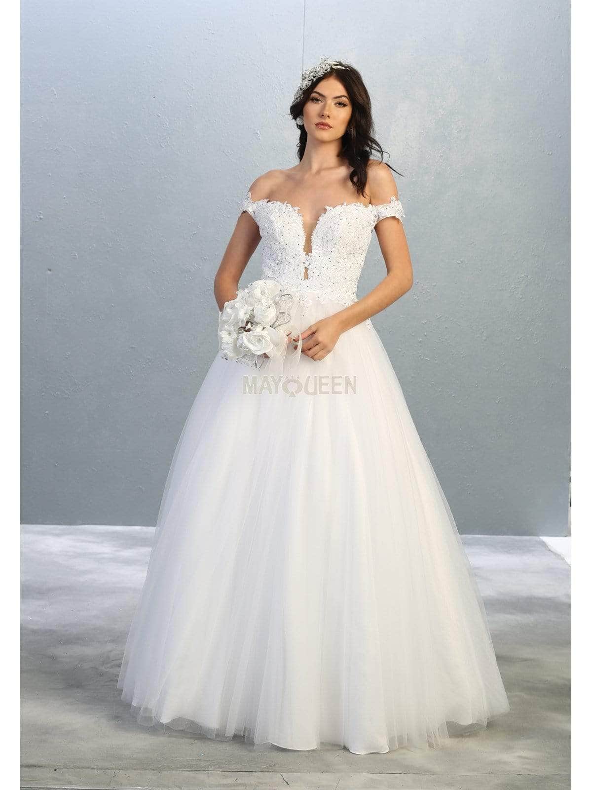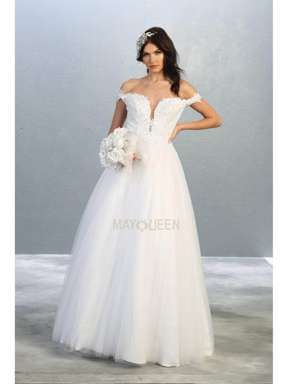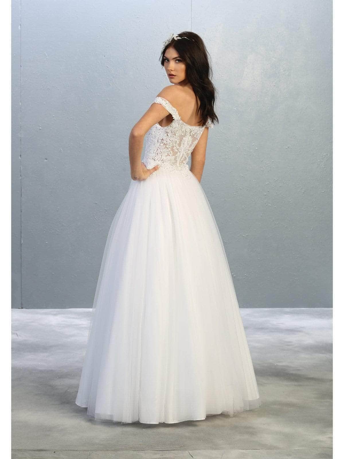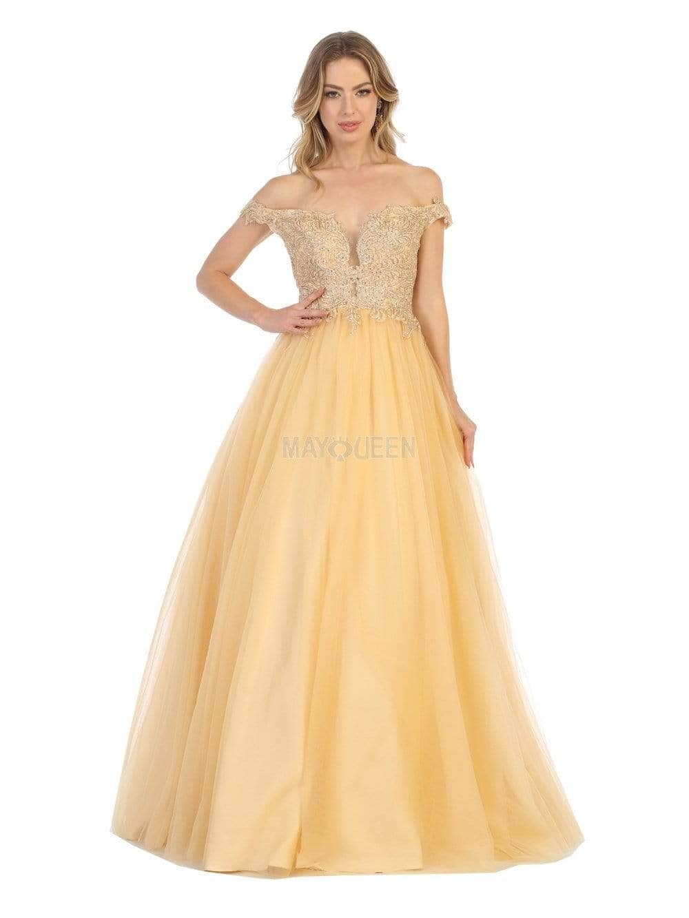 Festooned with embroidered appliques and sprinkled with rhinestones, this dress flourishes an off shoulder neckline with an illusion plunge. Designed with a sheer zipped up back, the tulle skirt cascades to the floor with a brush of train. Models are wearing the Blush, Champagne, Mauve, Red, White and Gold colors.