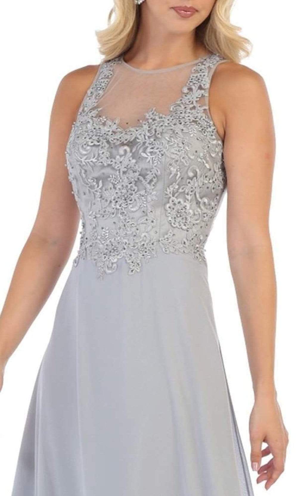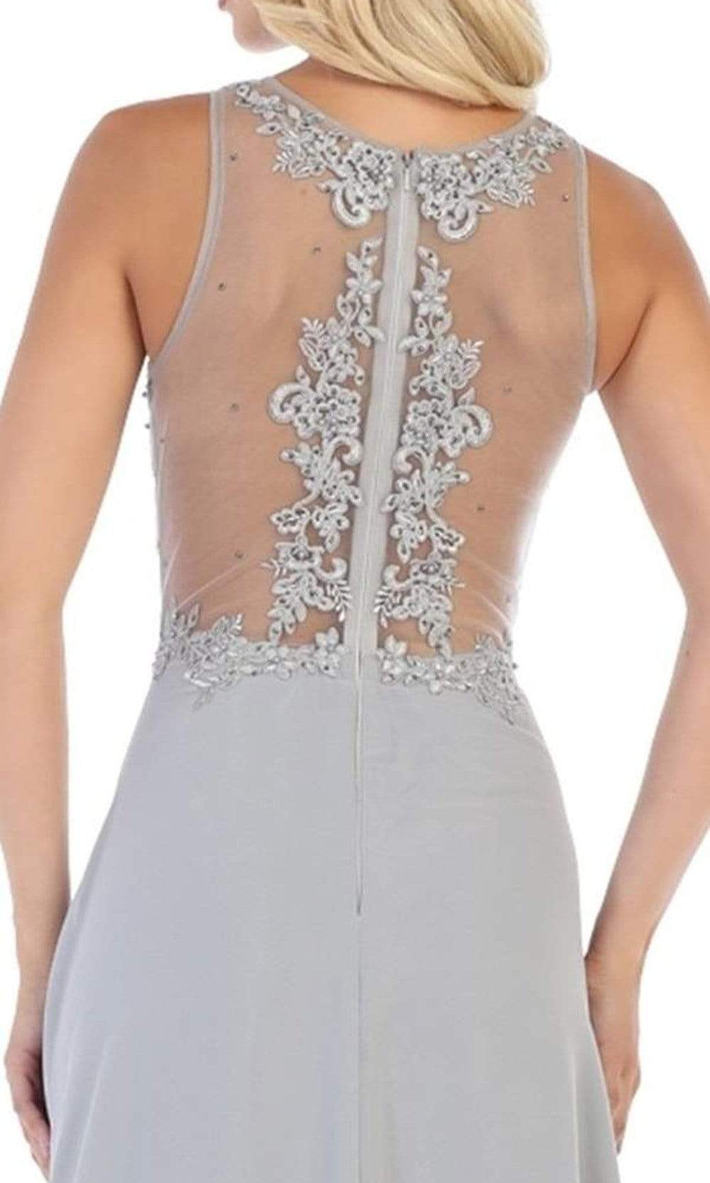 This dress features a sleeveless, illusion jewel neckline with fitted bodice richly ornate with embroidery and stone embellishments. The sheer back has a zipper closure while the A-line skirt runs at full length hem. Model is wearing gray color.