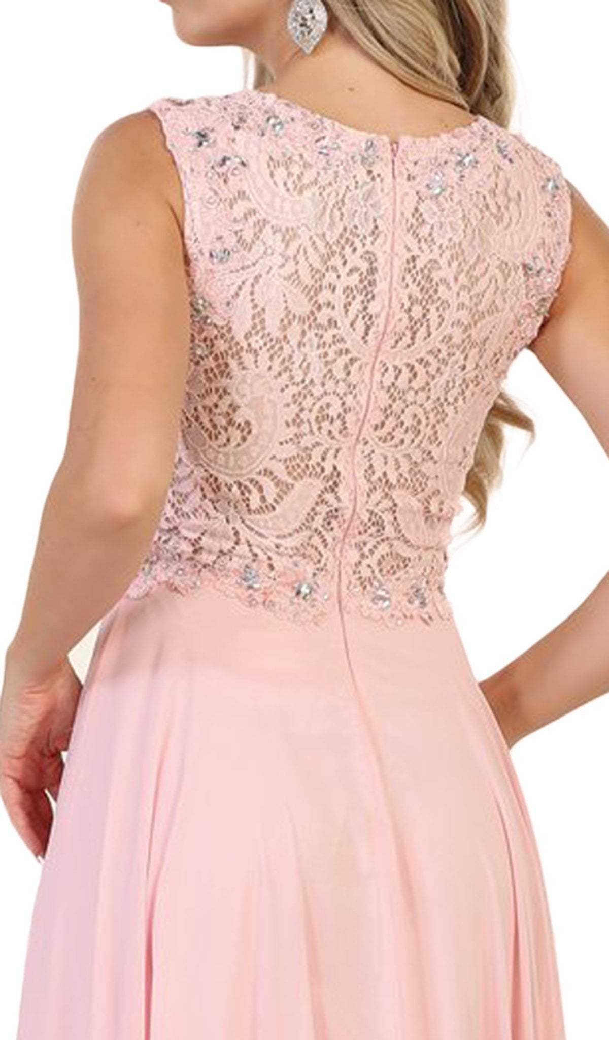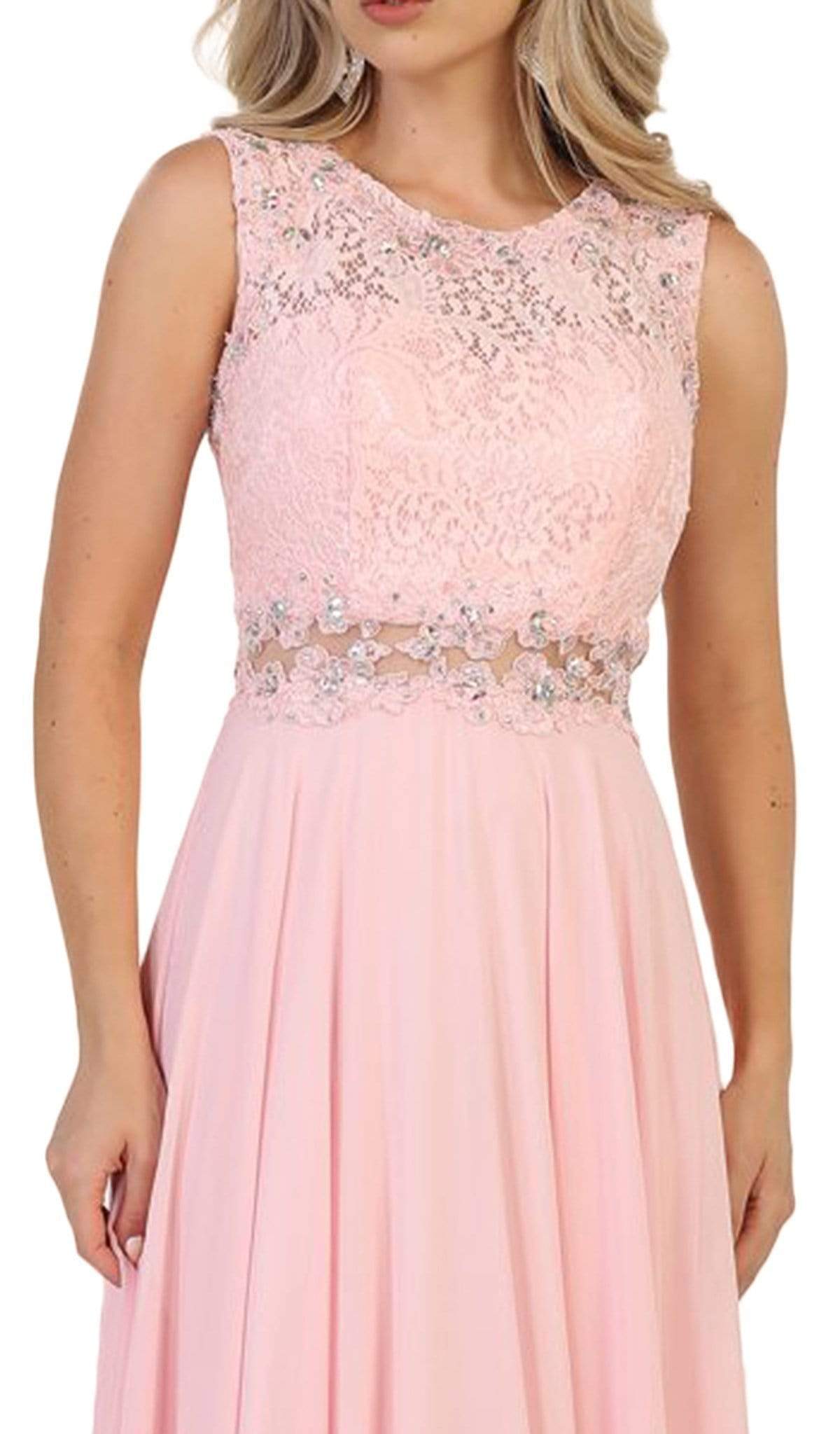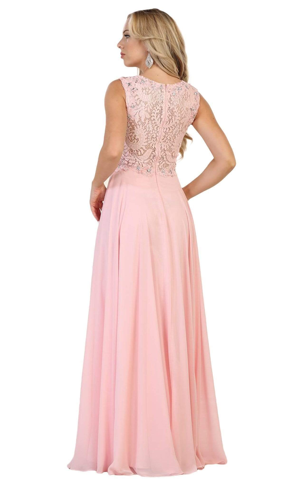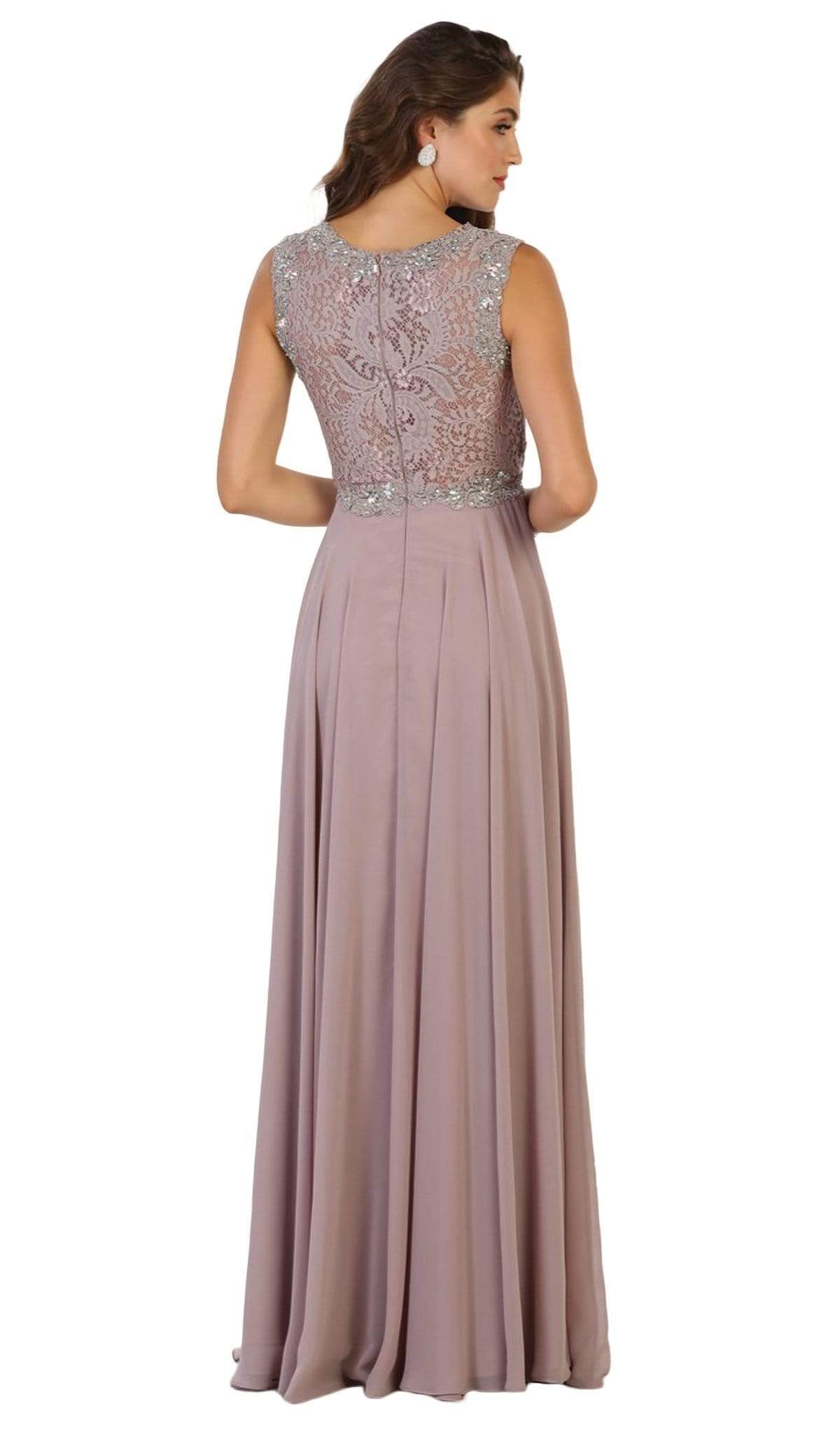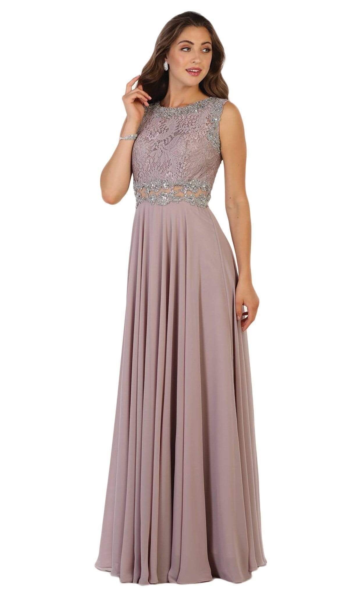 Display your natural beauty and grace in this elegant May Queen MQ1520 evening dress. The sleeveless bodice crafted in lace fabric with floral design features a jewel neckline framed with crystal embellishments. The natural waist is highlighted by a sheer panel detail embellished with dazzling crystals. The skirt is pleated and moves softly to the floor. The full back has center zipper closure. There is no better way to pair sophistication with glamour than with this classy May Queen style. Model is wearing Mauve color.