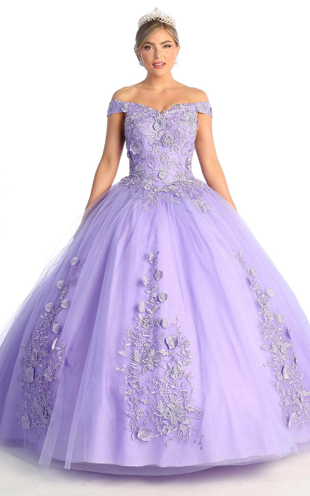Embellished with a rose bouquet of embroidered lace appliques, this gown features a foldover panel over an off shoulder bodice. Cinched at the back with a corset styled design, the dreamy ballgown skirt boasts of intricate floral appliques as it cascades to create a full-length hem and lush train. Model is wearing the Burgundy color.