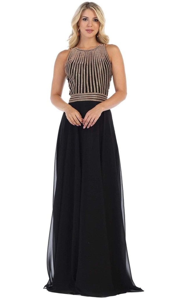 Adorned with metallic beaded stripes on a sleeveless bodice, this beauty shows an illusion jewel over a sweetheart neckline. Coupled with a sheer full back and a beaded stripe waistband, the chiffon skirt flutters fascinatingly to a full-length hem. Model is wearing the Black/Gold color.