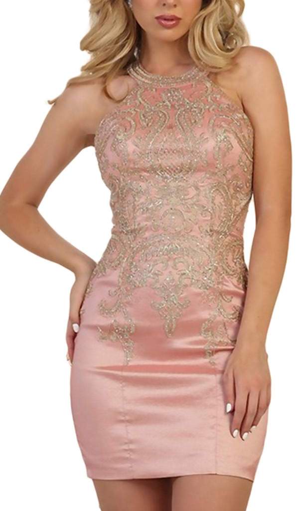 This sleeveless dress stuns in a halter neckline with fitted bodice richly ornate with gold lace appliques. The back has a racerback style while the sheath skirt highlights your curves and runs at mid-thigh hem.