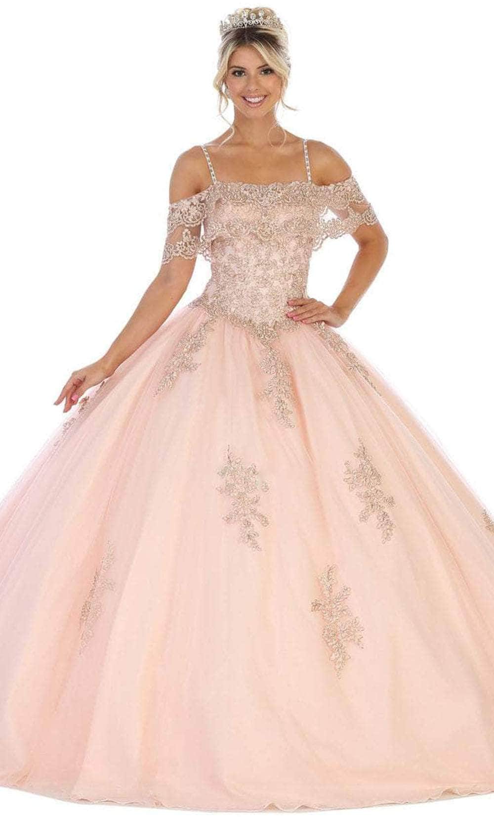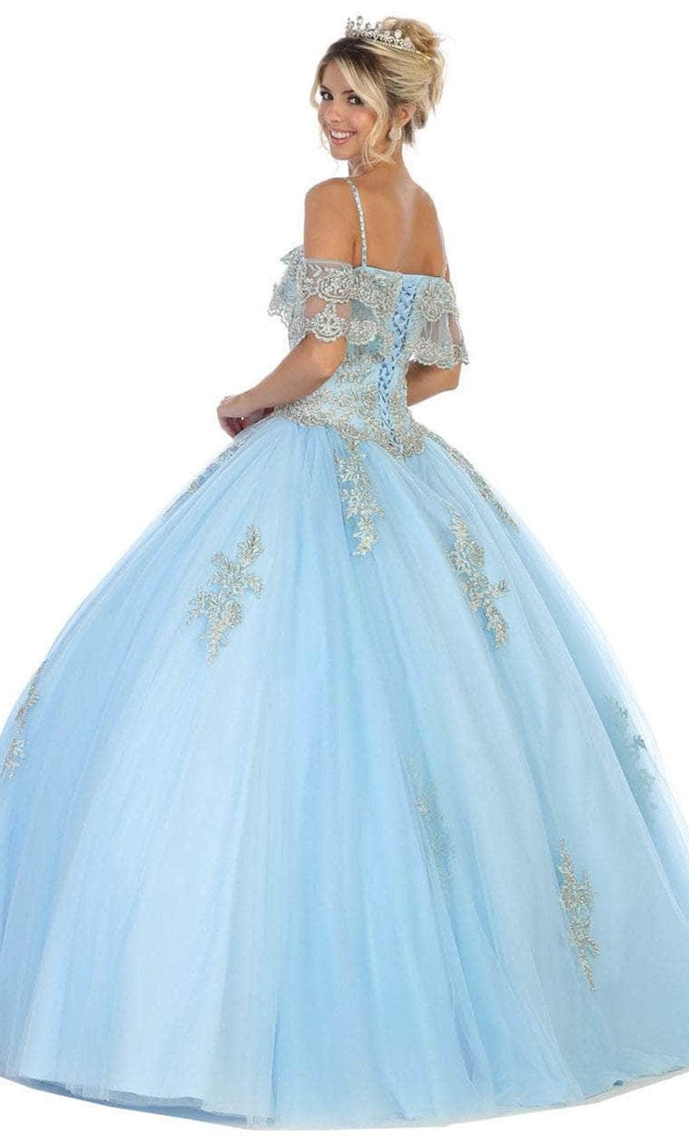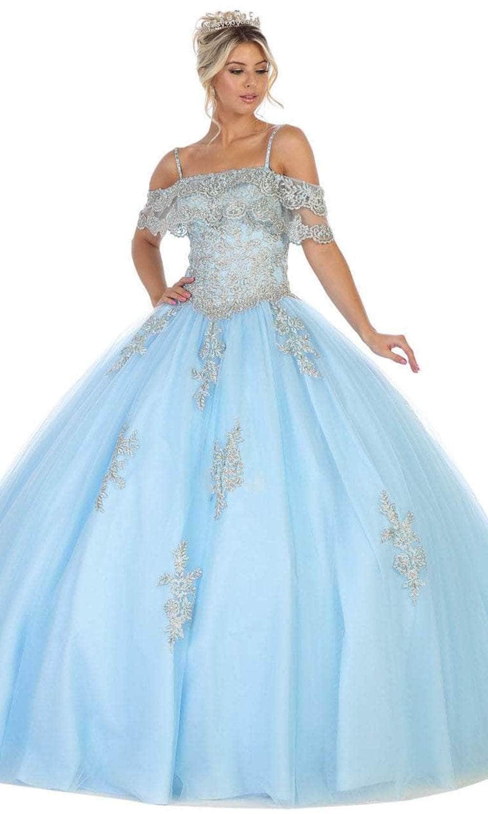 Showcase your brilliant esprit in this Bellissima by May Queen LK113. Show off your sweet side in this creation. The bodice is detailed with floral appliques, perfectly matched with the off-shoulder sleeves that make it even more appealing with a touch of a fitted bodice that is held together with thin straps and ending with an elegant back lace-up tie closure. The skirt parades dramatically in a ballgown silhouette. This May Queen creation is undeniably a sure winner! Models are wearing Blush, Champagne, Ivory and Sky blue colors.