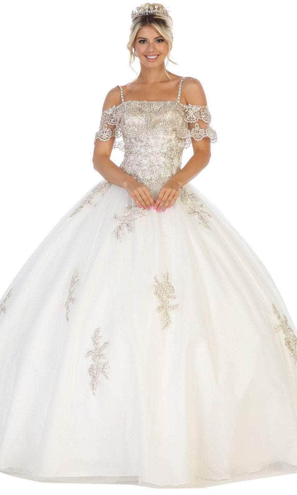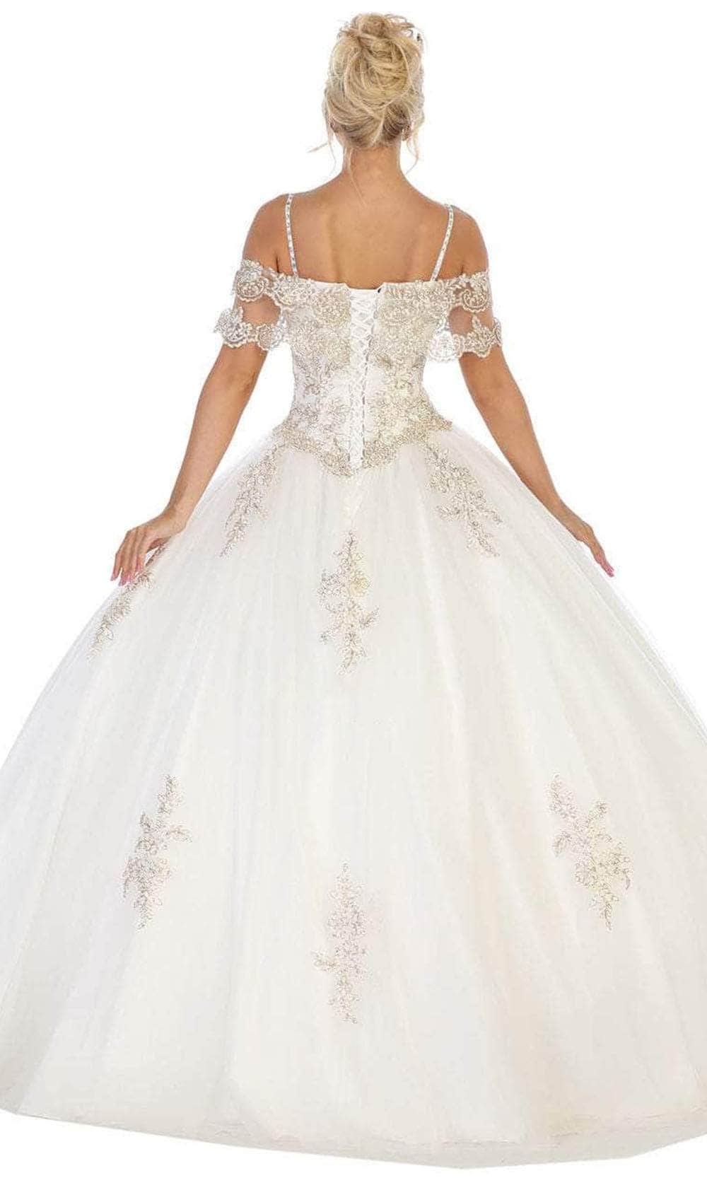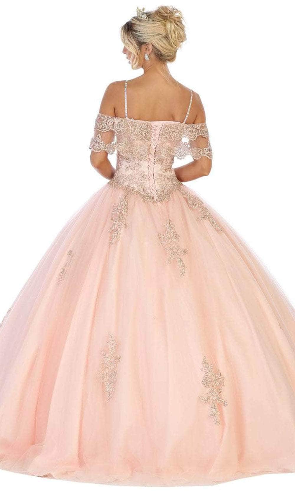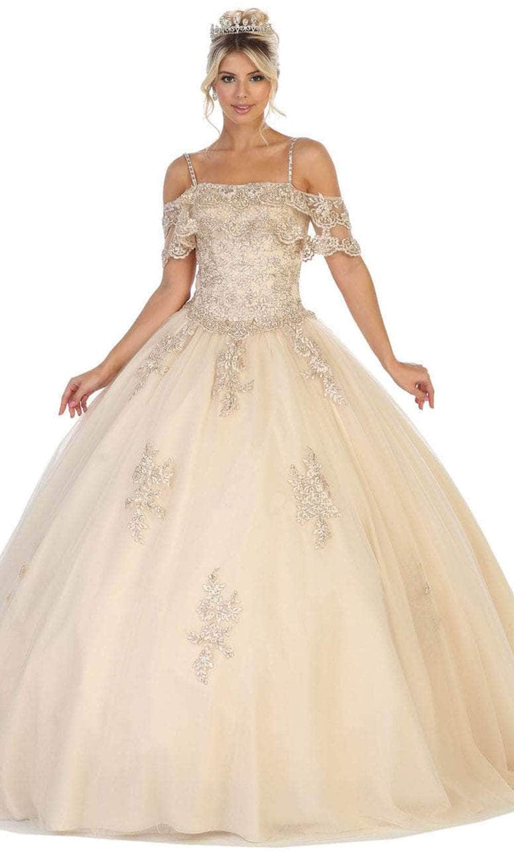 Showcase your brilliant esprit in this Bellissima by May Queen LK113. Show off your sweet side in this creation. The bodice is detailed with floral appliques, perfectly matched with the off-shoulder sleeves that make it even more appealing with a touch of a fitted bodice that is held together with thin straps and ending with an elegant back lace-up tie closure. The skirt parades dramatically in a ballgown silhouette. This May Queen creation is undeniably a sure winner! Models are wearing Blush, Champagne, Ivory and Sky blue colors.