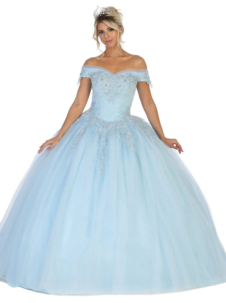Enchant everyone with your regal bearing when you don this May Queen LK119 creation. Crusted with floral appliques and stunning beadwork, this ensemble flaunts an off shoulder neckline with a v-notch and ornate arm straps. Defined with a mid-open back and cinching corset details, the ballgown reveals trailing floral elements as it cascades into a sumptuous silhouette. Let everyone be dazzled at your immaculate appeal in this May Queen masterpiece. Models are wearing the Baby Blue and Burgundy colors.