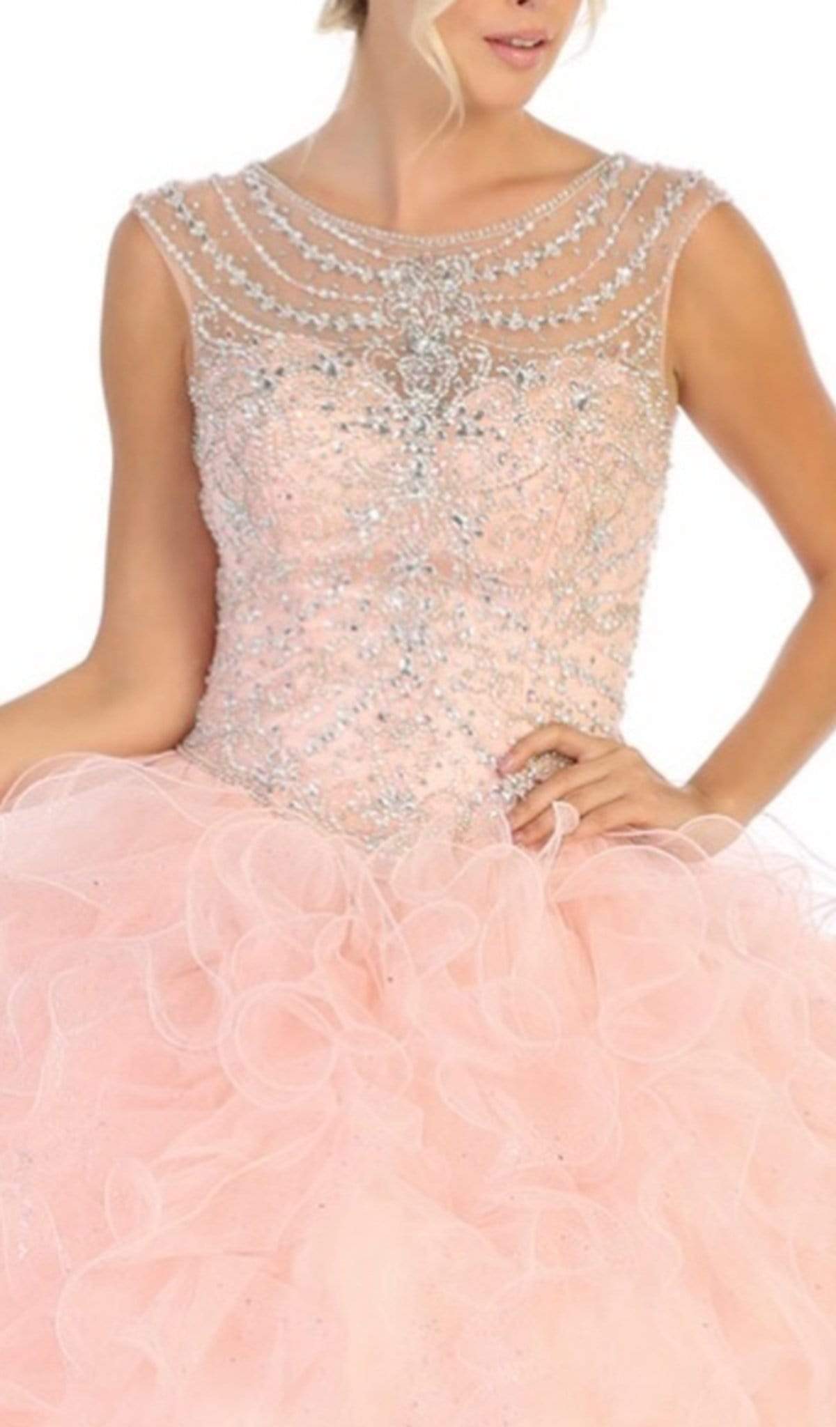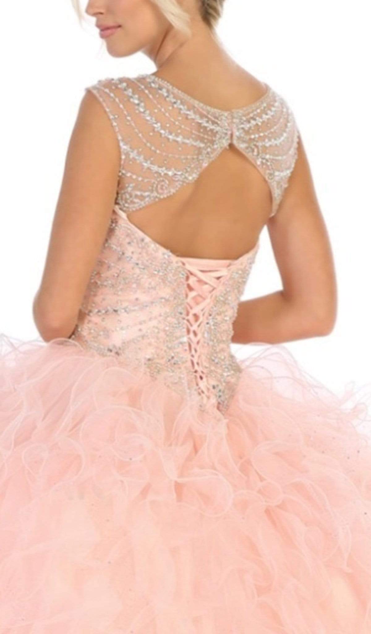 Entice everyone to bestow you with appreciative stares in this May Queen LK124 creation. Ornamented with shimmering jewels garlanding the sheer cap sleeves and the fitted bodice, this beauty shows off an illusion bateau over a sweetheart neckline. Detailed with an ornate illusion cutout back, a corset detail perfectly cinches this opulent ensemble. The ballgown skirt cascades in sumptuous ruffles as it touches the floor with a gossamer train. Let everyone be dazzled at your immaculate appeal in this May Queen masterpiece. Models are wearing the Blush and Burgundy colors.