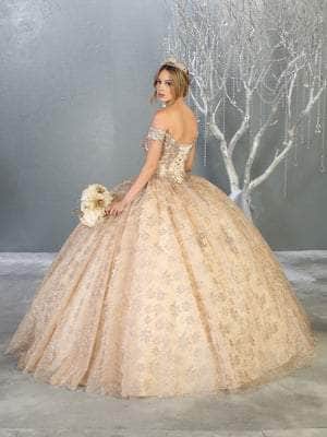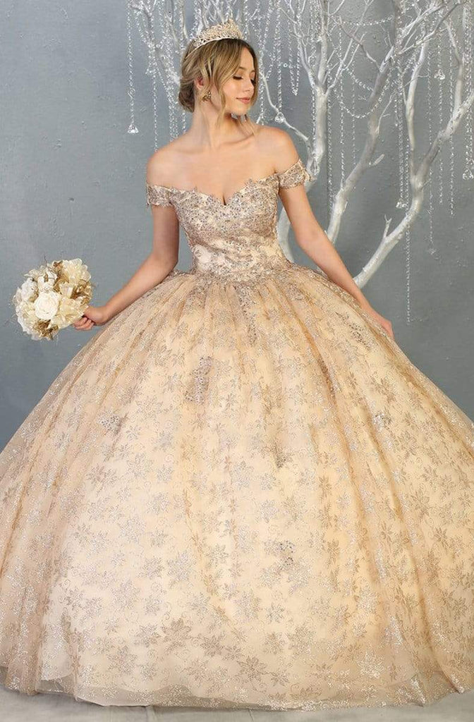 Make a statement with this gown by May Queen LK152. This embellished gown charms in an off-shoulder neckline with fitted bodice styled with a lace up back. The skirt opens in a voluminous ballgown silhouette. Make your grand entrance in May Queen. Models are wearing the Champagne, and Rose Gold variants.Â