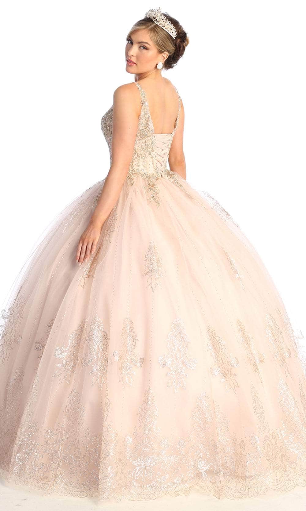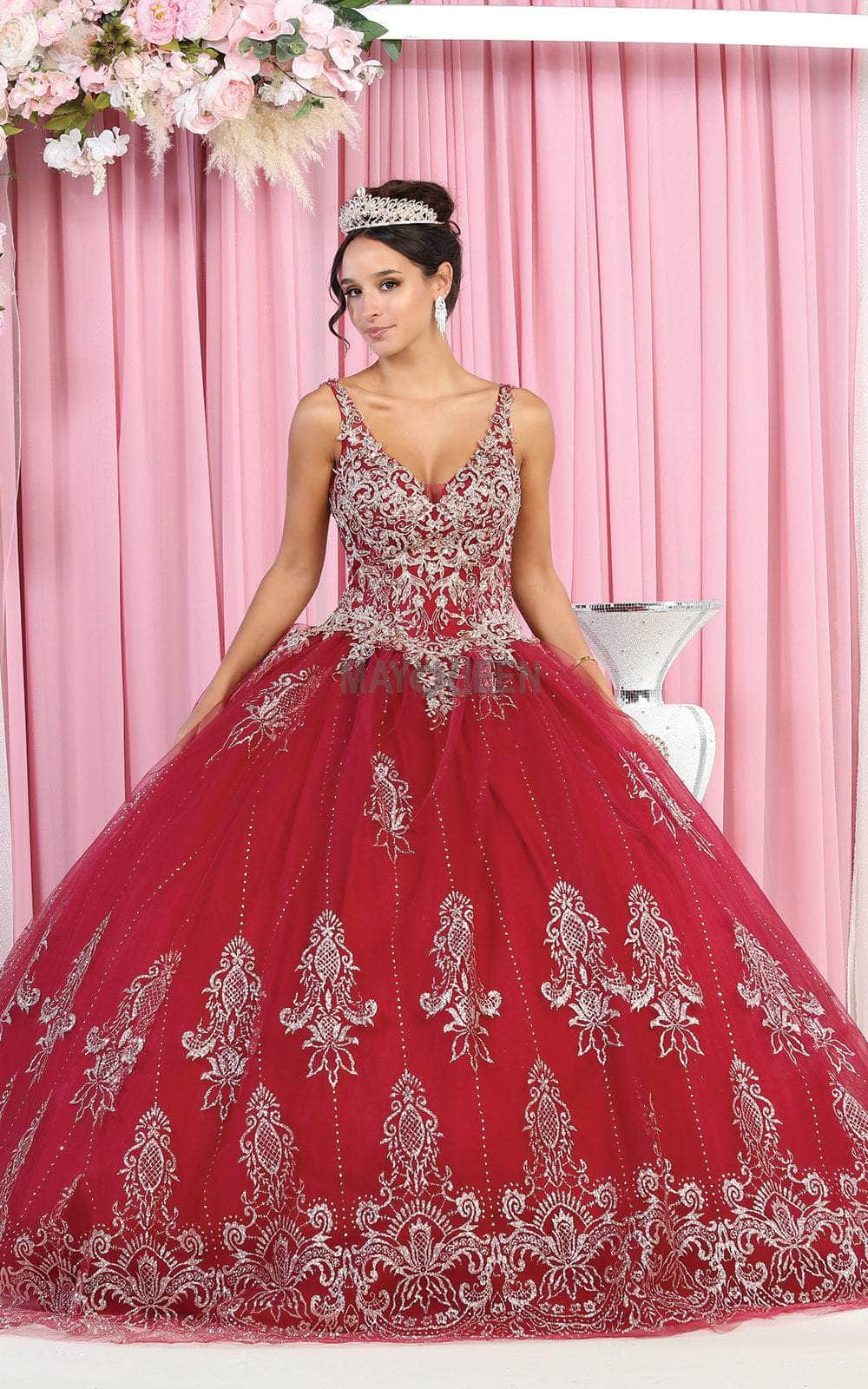 Flatter your figure with this eccentric design by May Queen LK173 masterpiece. This stunning piece features a sleeveless bodice with a V-neckline and a sheer insert in its fully embellished bodice. The full-length skirt ends in a voluminous ball gown silhouette making you stand out as you enter your special party! You will surely be the life of the party when you wear this dazzling May Queen LK173 masterpiece. Models are wearing the Blush/Gold, and Burg/Gold variants.. Find more Sweet 16 Dresses.
