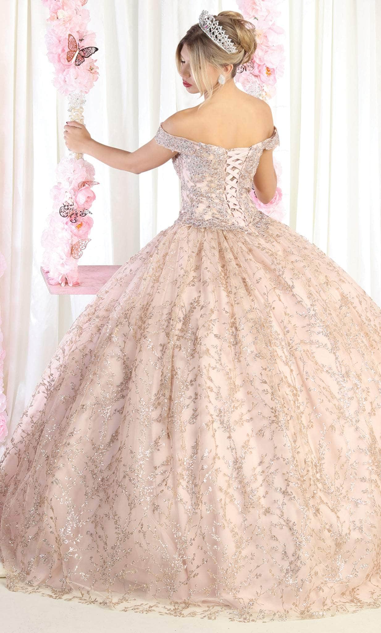 Glow on the red carpet like a dream in this inspired May Queen LK183 creation. Styled with a spectacle of rosette lace appliques and glittering embellishments on the figure flattering bodice, this gown parades an off shoulder neckline with a sweetheart notch. Designed with a lace up back, the glitter ornate skirt forms a lush ballgown silhouette that ends in a floor grazing hemline. Flourish a style befitting a goddess in this fascinatingly made May Queen masterpiece. Models are wearing the Fuchsia, Hunter Green, Lilac and Rose Gold colors.