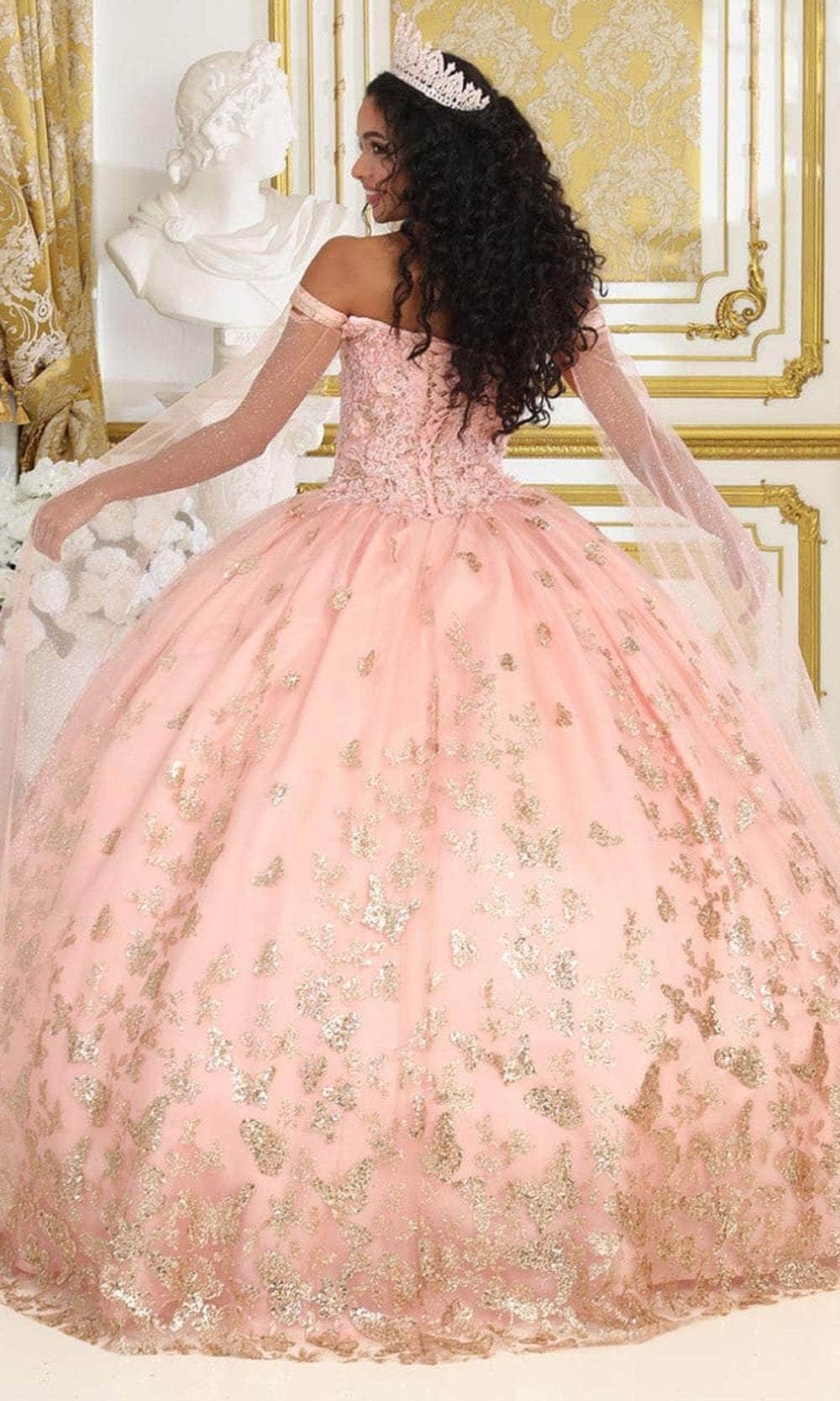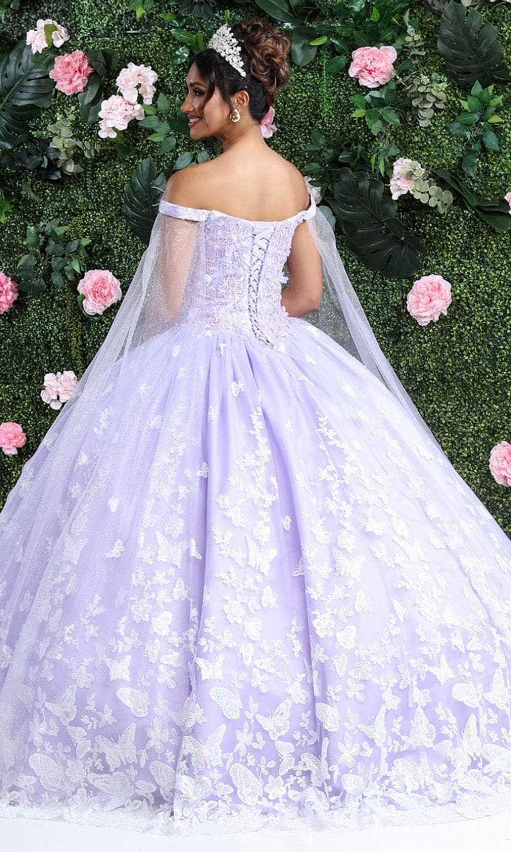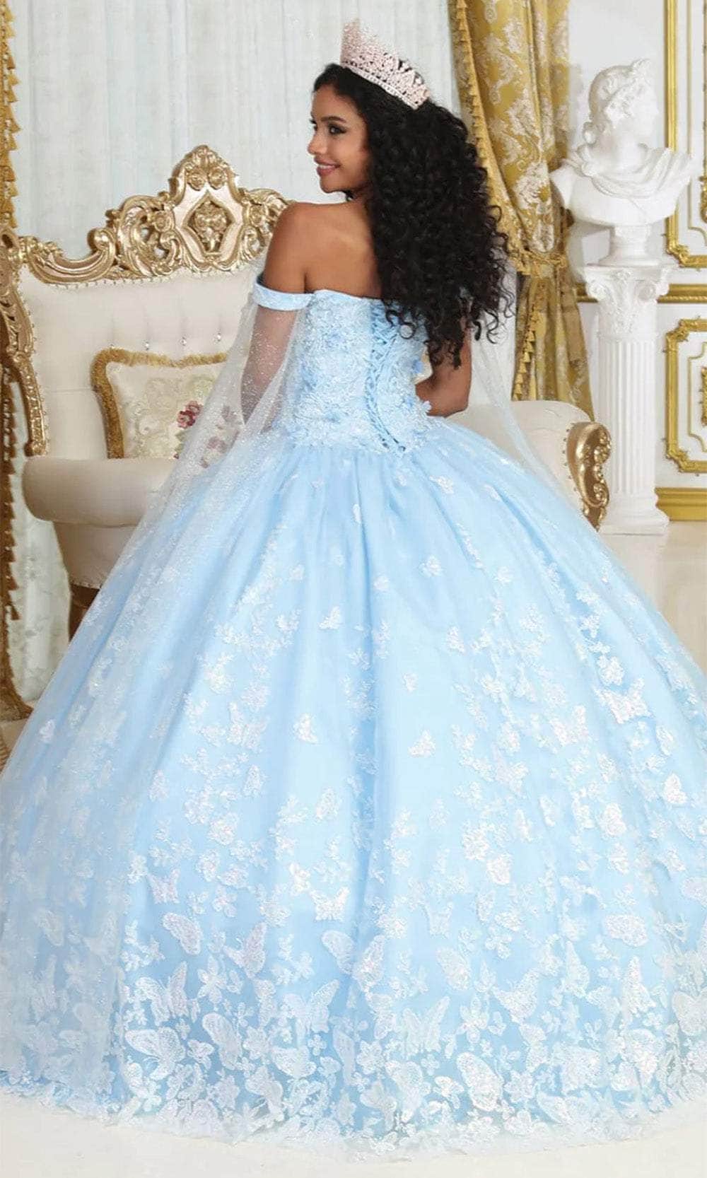 Immerse yourself in the pure charm and allure of this May Queen LK197 creation. Intricate designs intricately highlight the enchanting contours of this embellished figure. Decorated with feather trimmings, trailing floral and butterfly lace accents, and embellishments, the gown is structured with corset boning and an off-shoulder neckline that complements the top beautifully. This exceptional beauty showcases a corset cinched back with detachable sheer cape sleeves. The flowing skirt elegantly descends into a floor-length hem, enhanced with butterfly embellishments. Make a statement on the red carpet with this May Queen LK197 masterpiece. Models are wearing the Baby Blue, Lilac, and Blush colors.