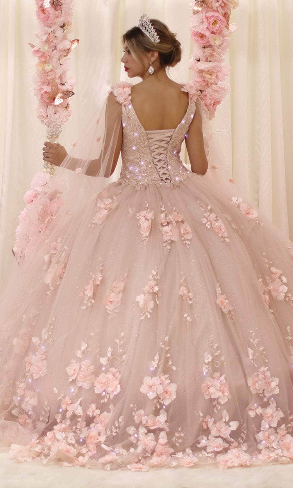 | Details: | Shoulder mesh cape, 3D floral applique, Embellishments, Glitters, Floor length, Quinceanera |