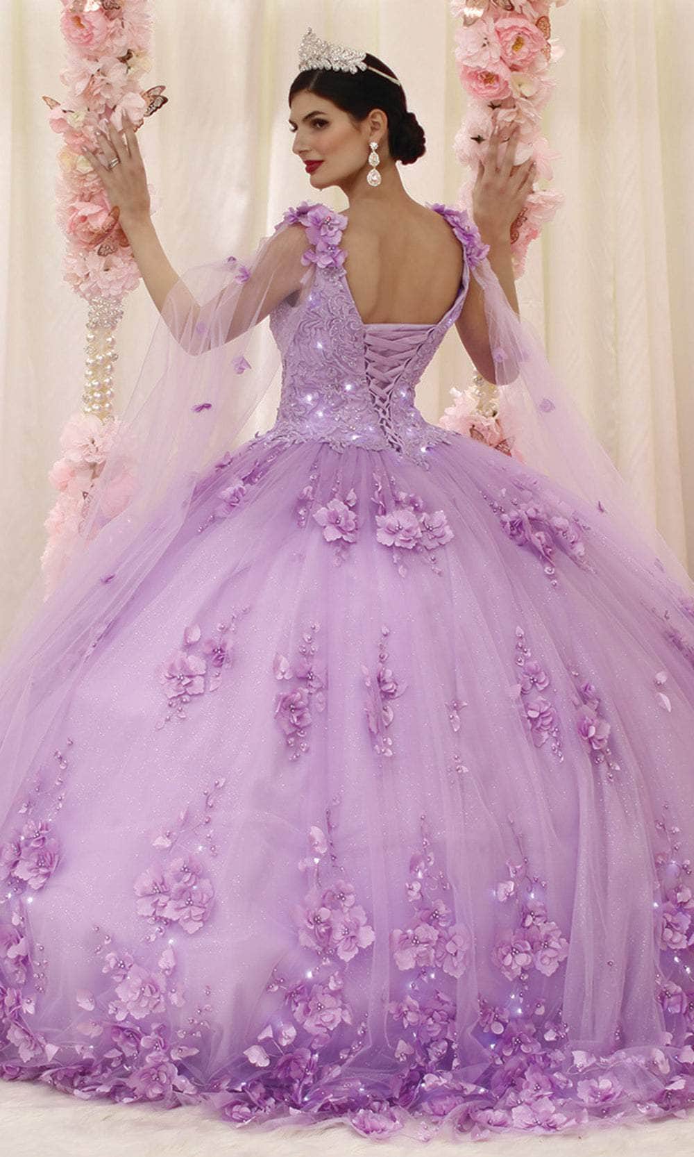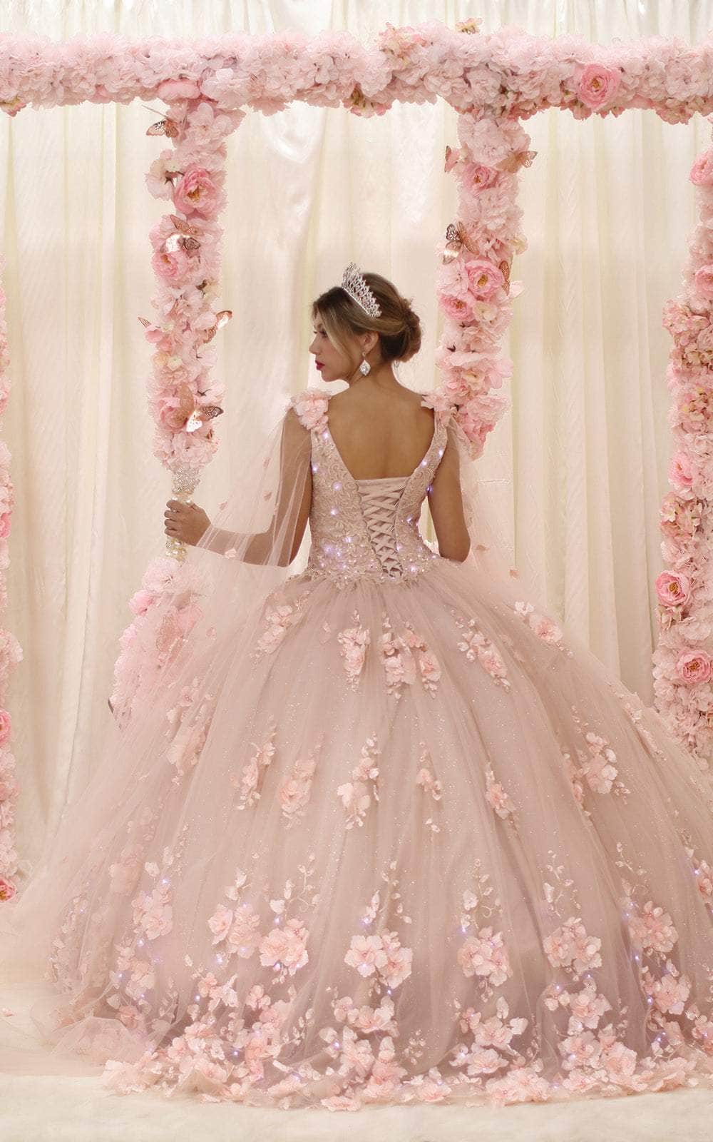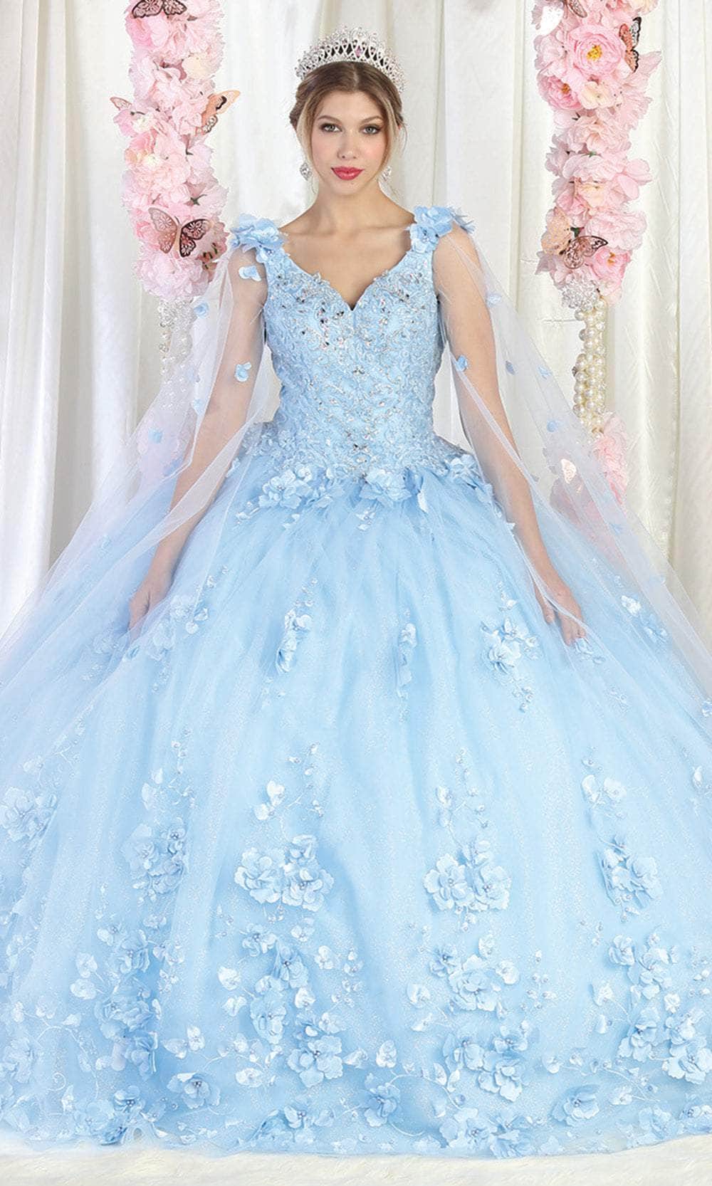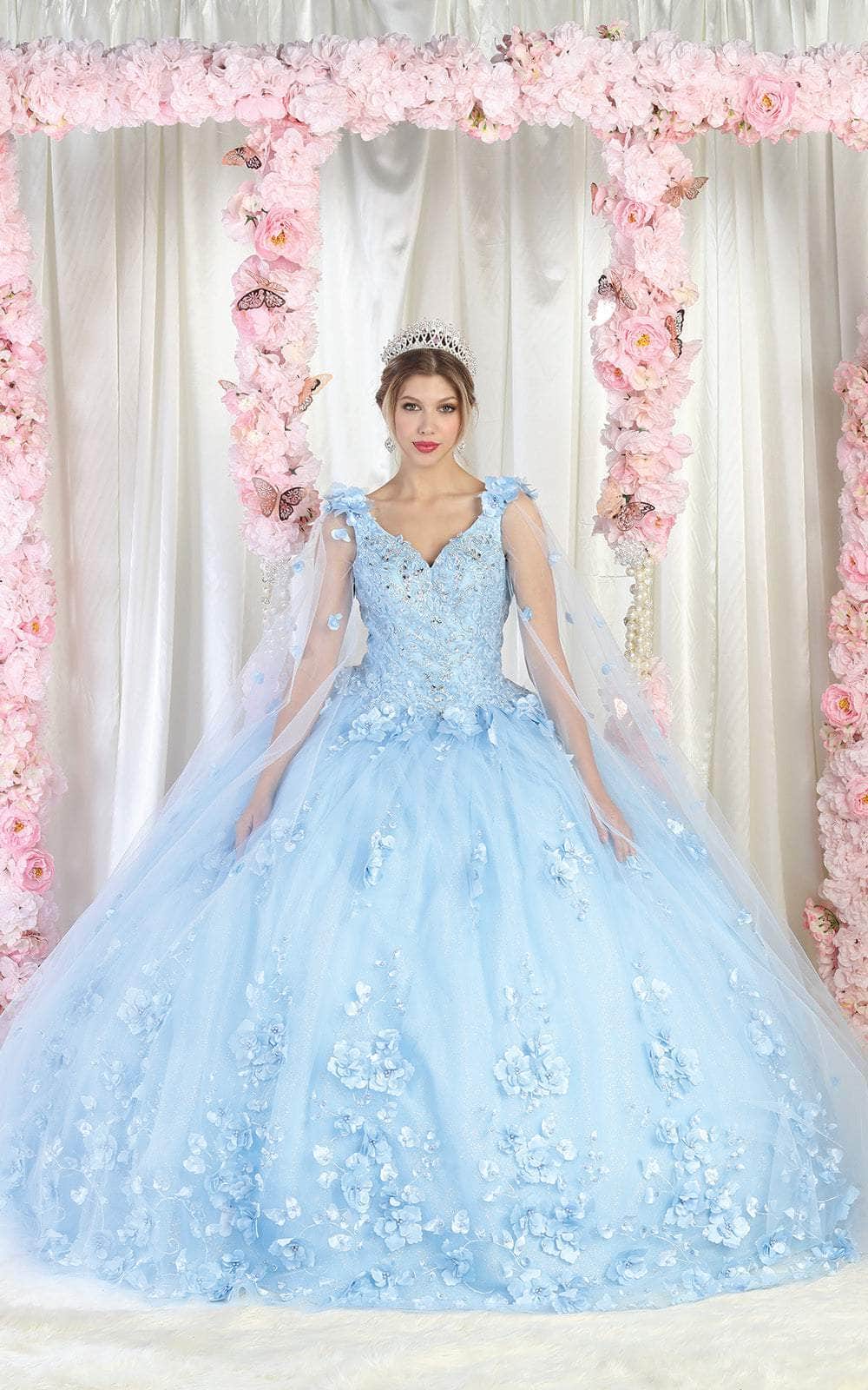 Prepare to captivate all onlookers with the breathtaking May Queen LK199 gown. The intricately beaded bodice boasts a charming V neckline, accentuated by delicate straps adorned with stunning 3D floral embellishments. Adding to its allure are the sheer cape sleeves, gracefully cascading down to the floor. The ball skirt is adorned with exquisitely appliqued beads and embossed flowers, completing the look of this unparalleled garment. Donning this exquisite creation from May Queen LK199, you are sure to be the object of envy at any event. Models are wearing Babyblue, Blush and Lilac colors.