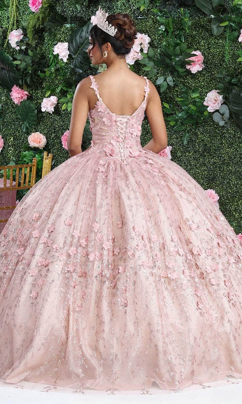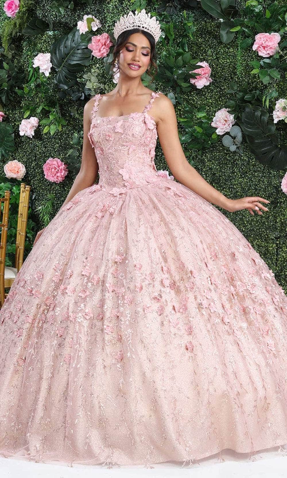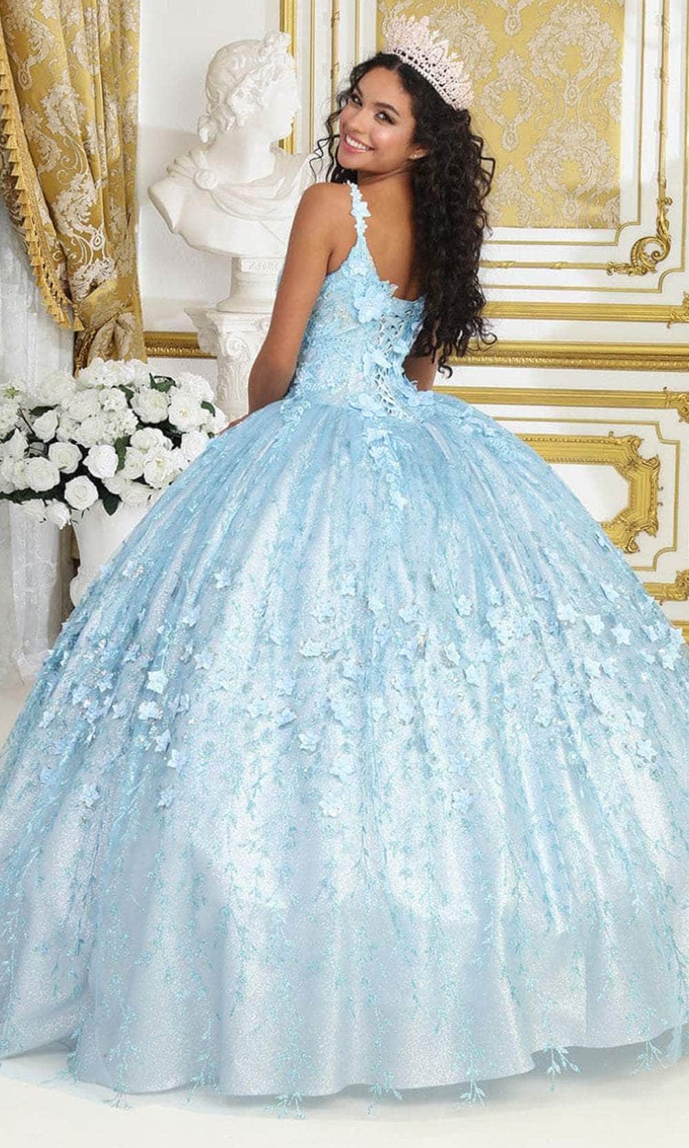 Make a glamorous entrance on the red carpet with the ethereal May Queen LK208 gown. Delicately adorned with rhinestones and lace overlays on the bodice, this dress showcases a straight-across neckline complemented by applique spaghetti straps. Embellished with 3D floral details and butterfly appliques, the back features a midrise design and a corset for a perfect fit. Tiers of fabric cascade elegantly, creating a breathtaking ballgown silhouette with a floor-grazing hem. Embrace sophisticated elegance at your exquisite event with this May Queen LK208 masterpiece. Models are wearing the Baby Blue and Rose Gold colors.