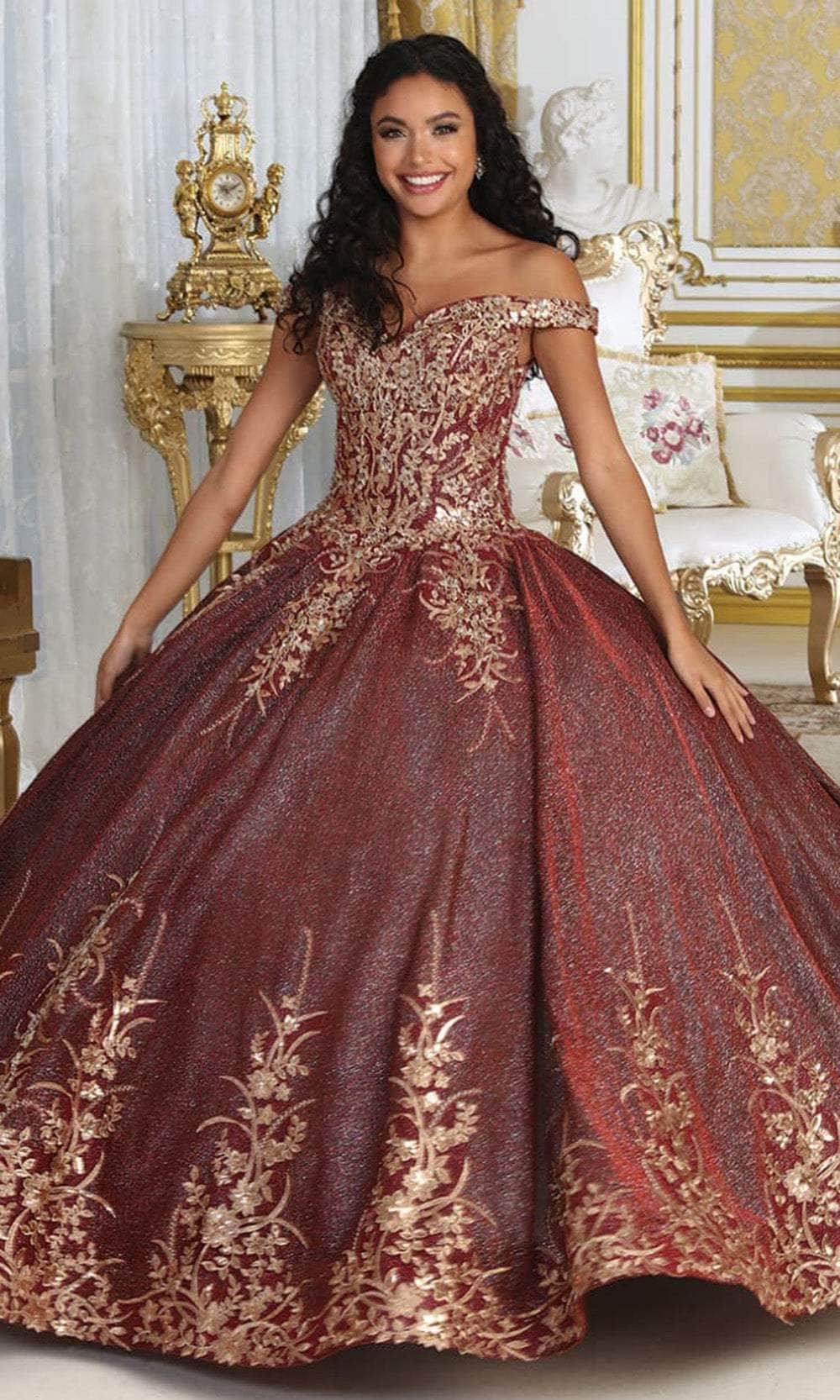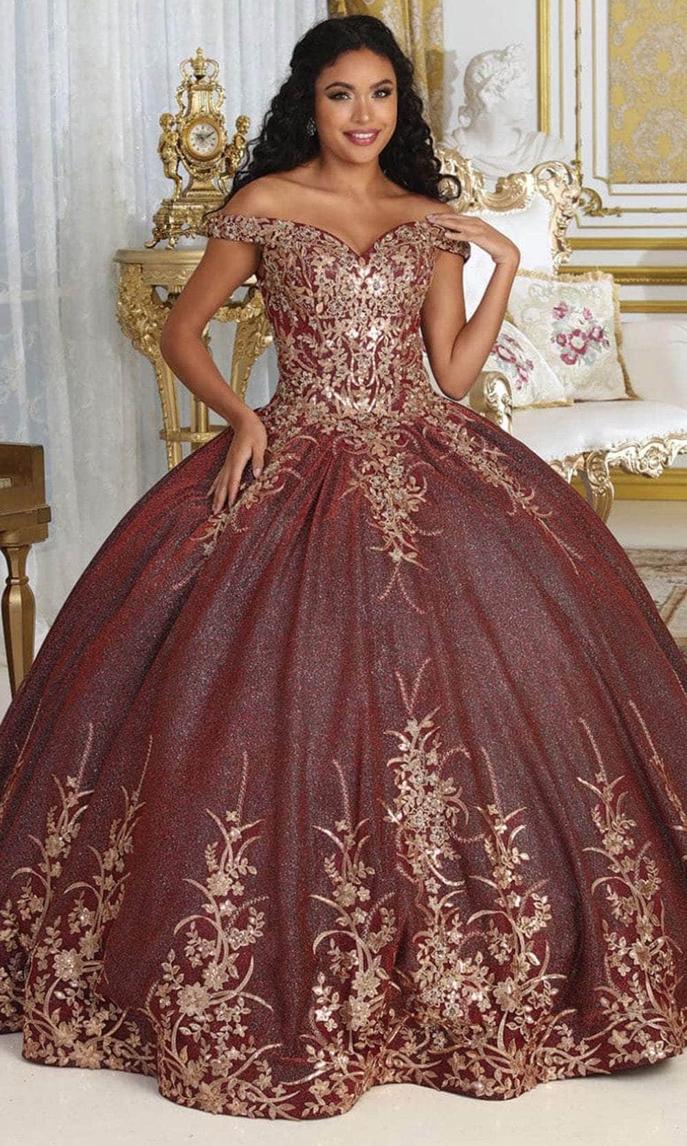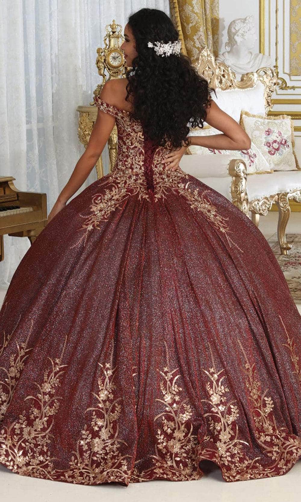 Embrace elegance with our exquisite Quinceanera May Queen LK220 design, perfect for gracefully twirling through the night. Painstakingly crafted with metallic lace appliques, this gown elegantly accentuates the captivating curves of its rhinestone-embellished silhouette. Enriched with intricate shimmering layers, the gown features a corset bodice paired with an off-shoulder neckline. With a corset cinched back design, the voluminous skirt unveils a ballgown silhouette adorned with lace appliques and a sweeping train. Create a lasting impression and shine under the spotlight with our remarkable Quinceanera May Queen LK220 masterpiece. Models are wearing the Burgundy, Hunter Green, and Rose Gold colors.