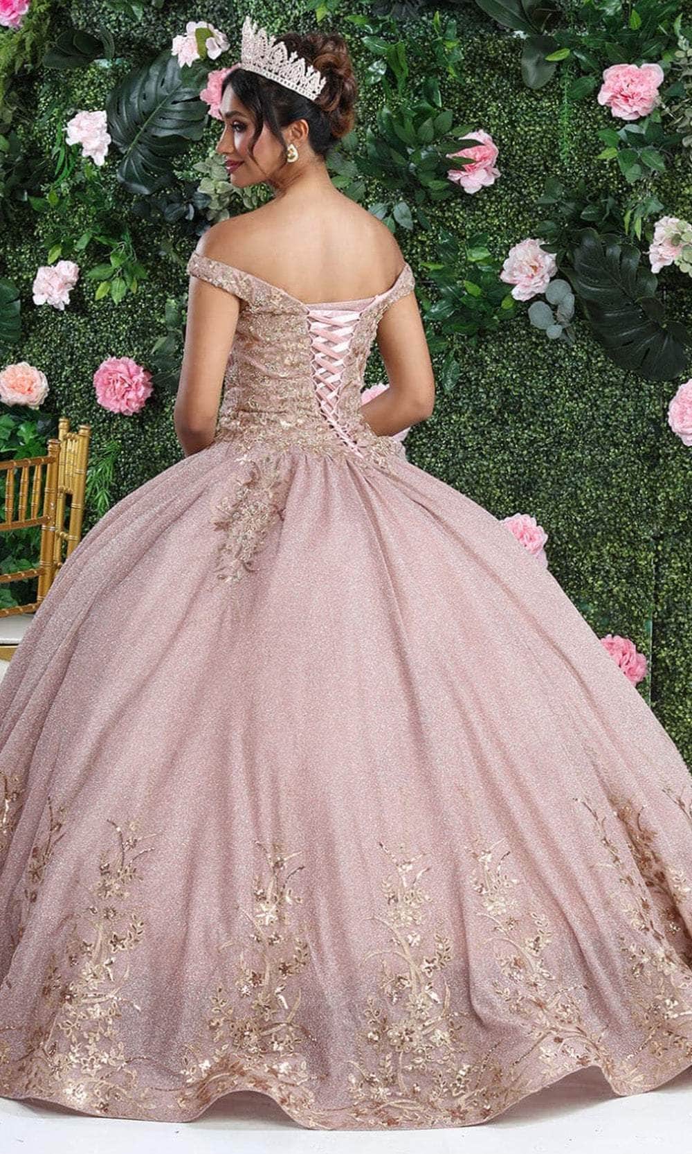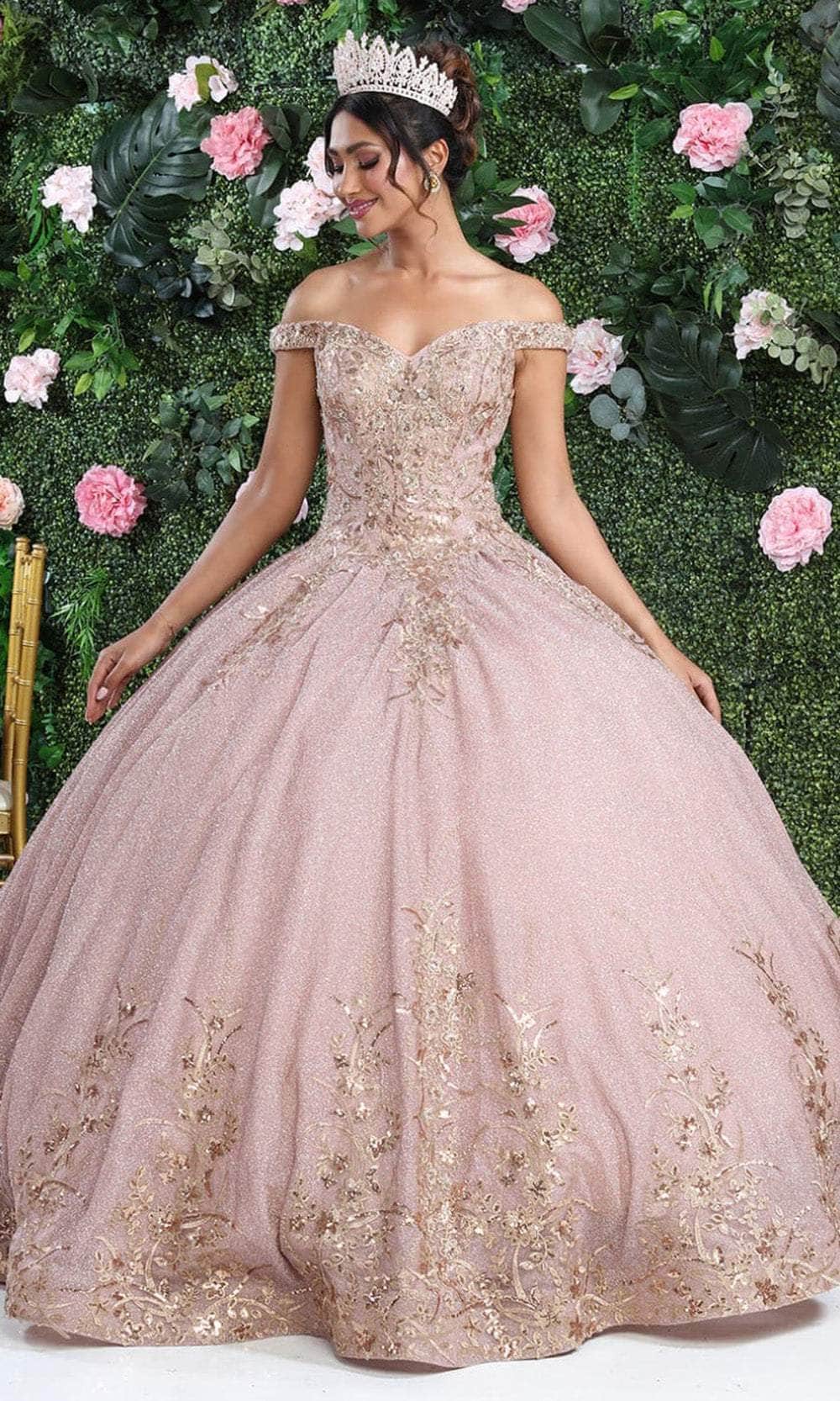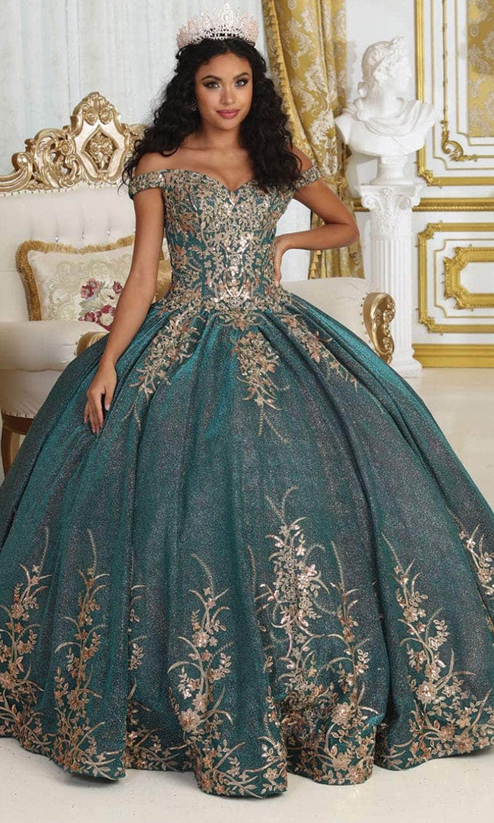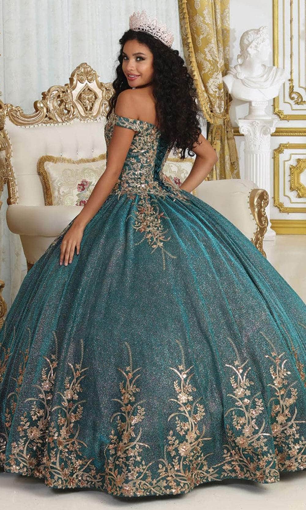 Embrace elegance with our exquisite Quinceanera May Queen LK220 design, perfect for gracefully twirling through the night. Painstakingly crafted with metallic lace appliques, this gown elegantly accentuates the captivating curves of its rhinestone-embellished silhouette. Enriched with intricate shimmering layers, the gown features a corset bodice paired with an off-shoulder neckline. With a corset cinched back design, the voluminous skirt unveils a ballgown silhouette adorned with lace appliques and a sweeping train. Create a lasting impression and shine under the spotlight with our remarkable Quinceanera May Queen LK220 masterpiece. Models are wearing the Burgundy, Hunter Green, and Rose Gold colors.