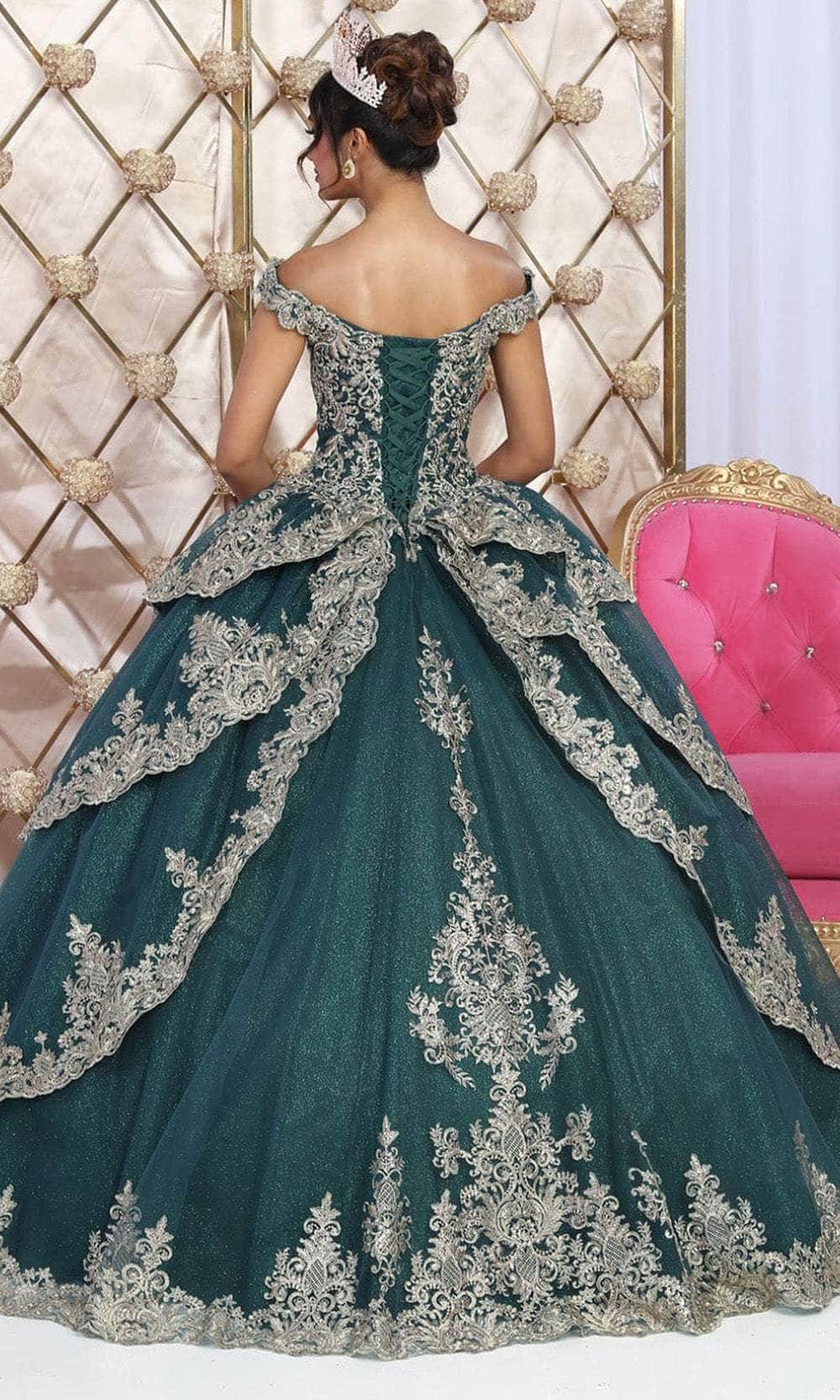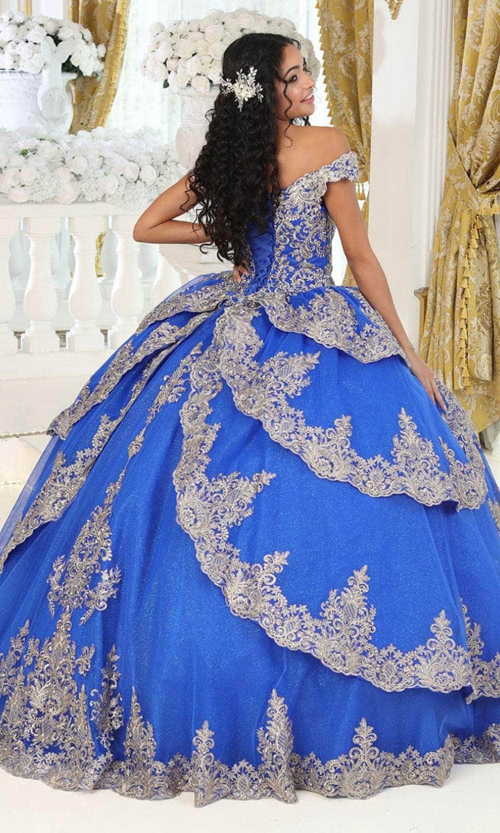 Enter into an atmosphere of sophistication and allure with our breathtaking Quinceanera May Queen LK234 ballgown. Finely embellished with shimmering accents and lustrous metallic lace motifs throughout, this gown showcases an off-the-shoulder neckline accented with scalloped trims. Embellished with trailing metallic accents and detailed with rhinestones, the back features a corset ensuring a flawless fit. Layers of fabric flow gracefully, sculpting an enchanting ballgown silhouette with a floor-length hem and luxurious side tiers. Mesmerize all who encounter you in our glamorous Quinceanera May Queen LK234 masterpiece. Models are wearing the Royal/Gold and Hunter/Gold colors.