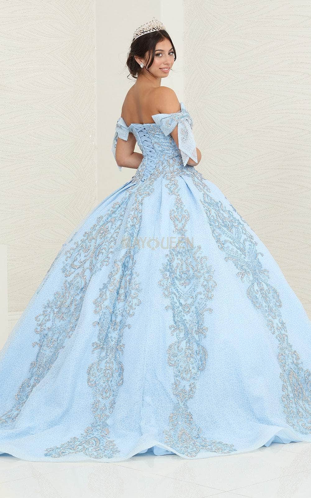 Stand out in the spotlight with the May Queen LK241 ensemble. This exceptional gown features a sweetheart bodice decorated with off-shoulder straps adorned with bow accents, paired with a corset-inspired design that elegantly sculpts the figure with sophistication. Embellished with intricate glitter details and delicate beadwork, the bodice reveals a sheer mid-rise back fastened with a lace-up detail. The skirt boasts a luxuriously layered design, showcasing a ballgown silhouette that cascades into a sweeping train, completing the ensemble with grace and allure. Elevate your charisma and allure with this captivating masterpiece from May Queen LK241. Models are wearing the Baby Blue and Blush colors.