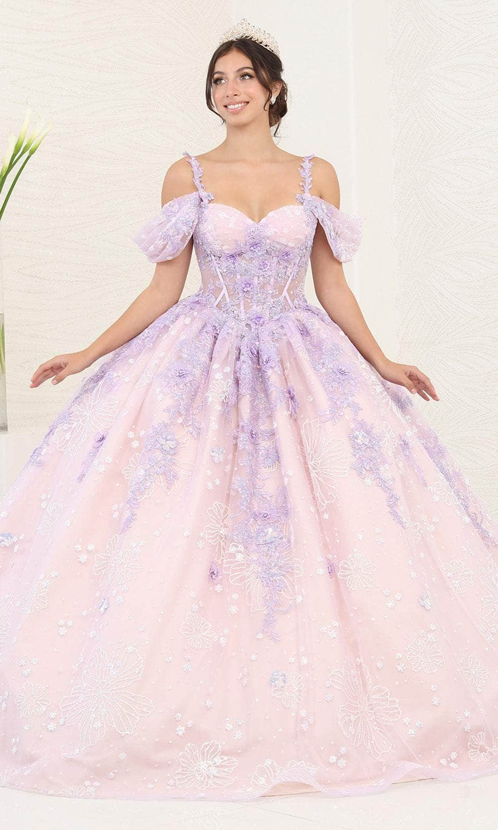 Exude youthful charm and wonder wearing this May Queen LK257 Quinceanera ballgown. Expert tailoring sculpts the silhouette, creating a foundation for the captivating off-the-shoulder neckline and delicate applique straps. Sheer draped sleeves add a touch of ethereal romance, while sequins delicately sprinkled on floral and butterfly lace appliques adorn the corset-boned bodice, creating a shimmering dreamscape. The lace-up back ensures a perfect fit and a touch of drama, leading into a two-tone ballgown skirt that cascades into a majestic court train. This May Queen LK257 creation guarantees you'll feel like royalty and leave a lasting impression on your special day. Model is wearing the Lilac/Blush color.