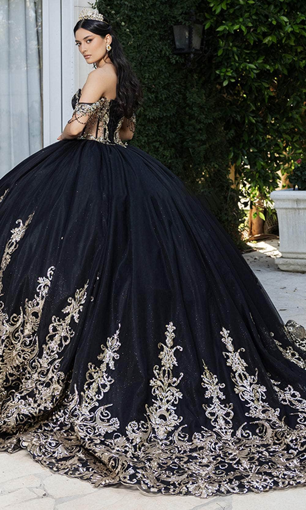 Take their breath away with this enchanting May Queen LK267 ballgown. This gown exhibits a captivating off-shoulder neckline on an illusion bodice, also featuring boning details for added structure. The back is mid-open and is secured with lace, while the glittery skirt reveals a mesmerizing cathedral train. Making this dress look extra appealing are its sequin and bead designs, allowing you to look luxurious from any angles. This enchanting May Queen LK267 masterpiece is sure to make you the center of everyones attention. Model is wearing Black/Gold color.