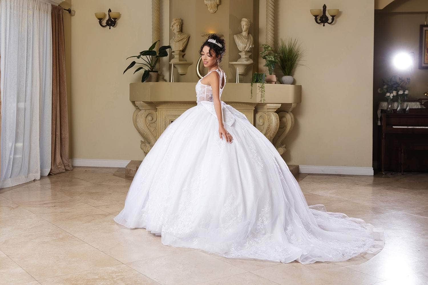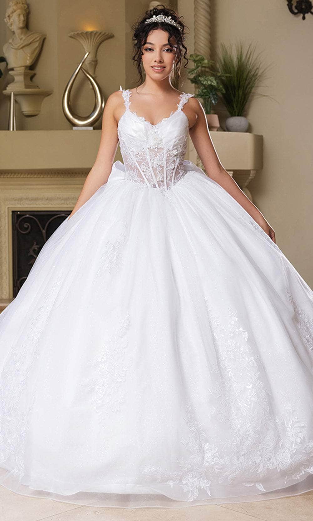 | Details: | Lace, Illusion, Boning, Pleat, Floral Applique, Sleeveless, Glitter, Mid-Open Back, Lace Up, Back Bow, Cathedral Train |