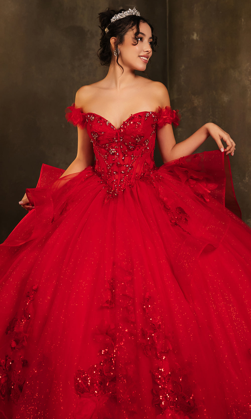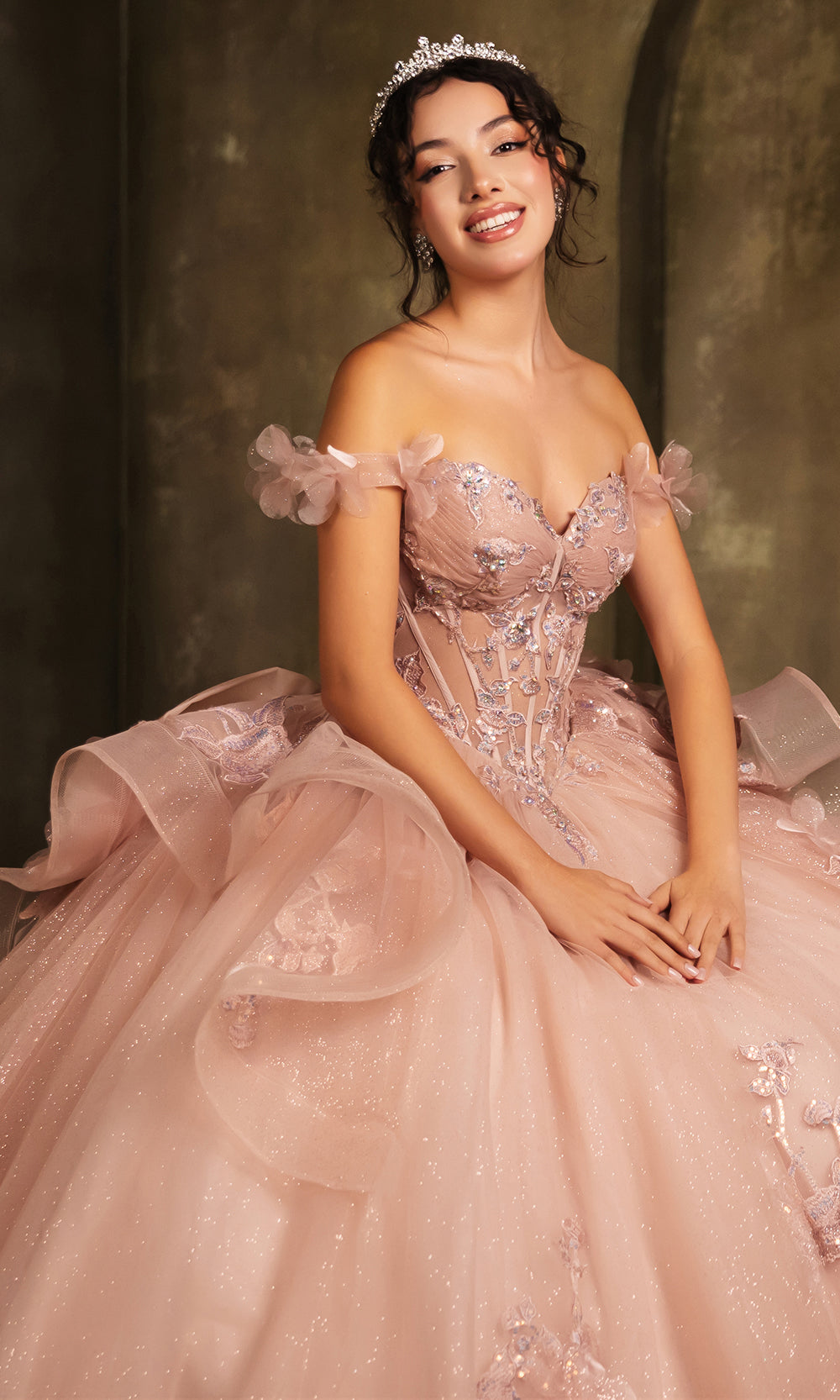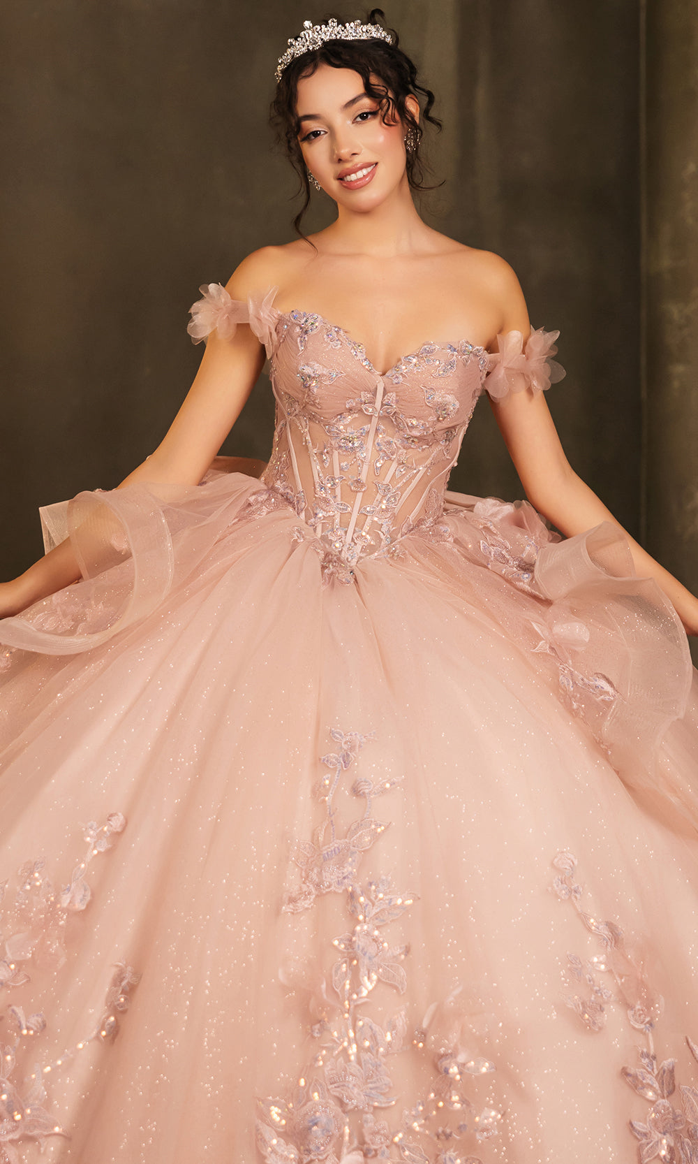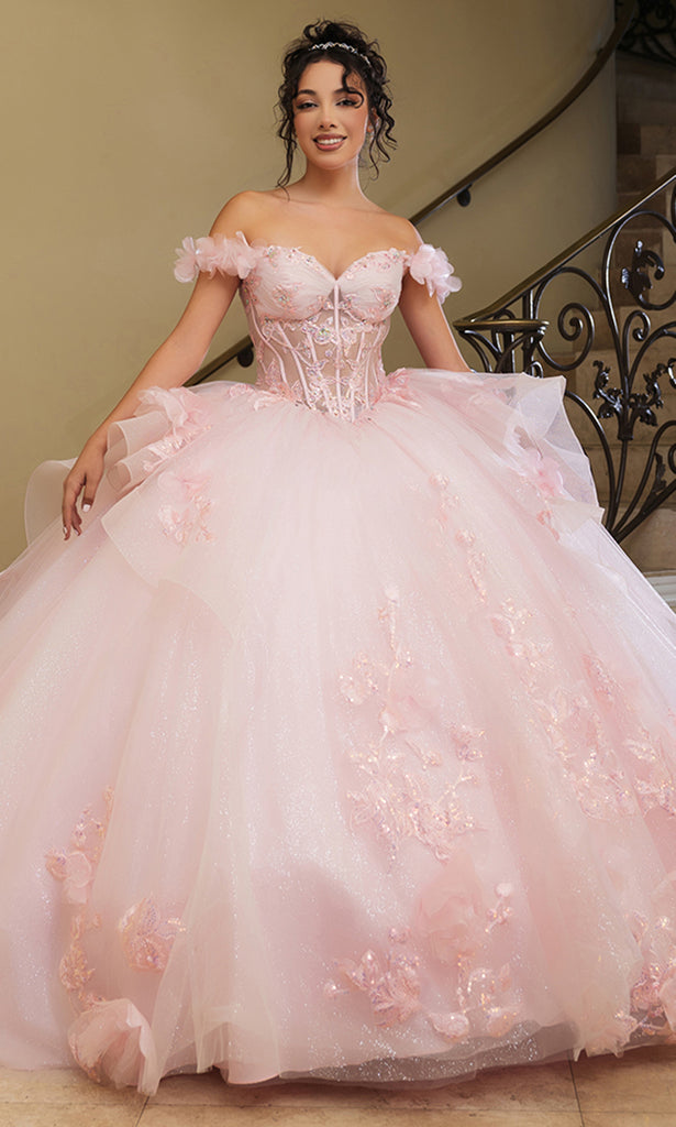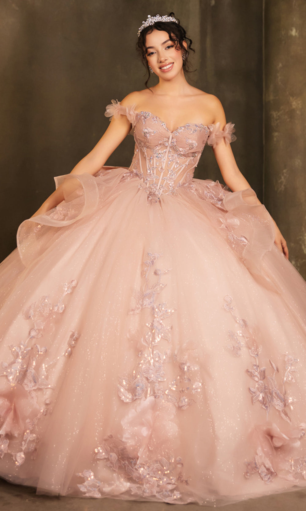 For a fairytale moment, May Queen LK270 is a ballgown that captivates with every detail. With an enchanting sweetheart neckline and off-shoulder sleeves, this gown is beautifully adorned with floral embroidery, shimmering beads, and ethereal 3D flowers for a truly romantic look. Its illusion corset bodice provides structure and shape, enhancing the waist before cascading into a voluminous ballgown skirt. Glitter embellishments throughout the gown add a touch of sparkle, making this gown ideal for quinceaneras, sweet sixteens, or grand galas. Make a dreamy impression with May Queen LK270. Models are wearing Pink, Rosegold, and Red colors.