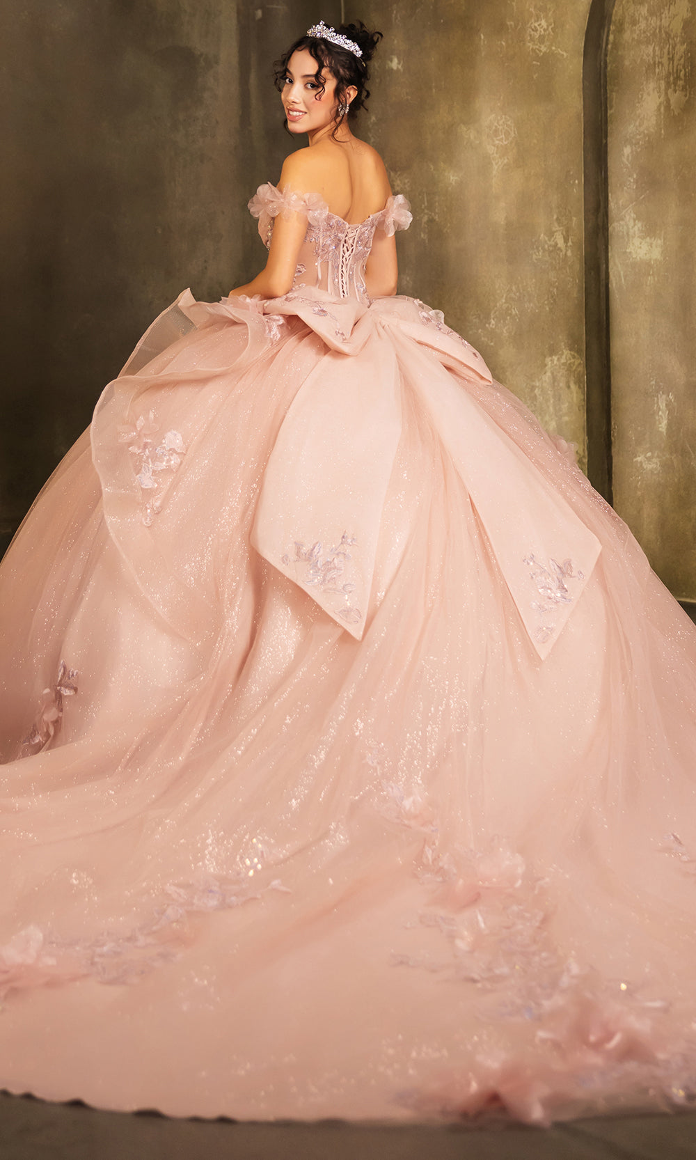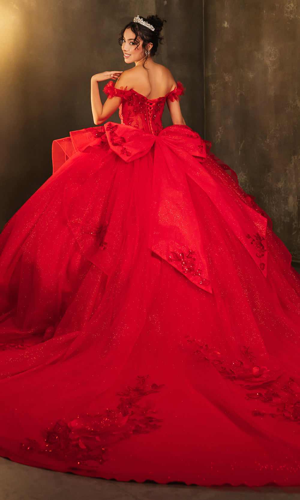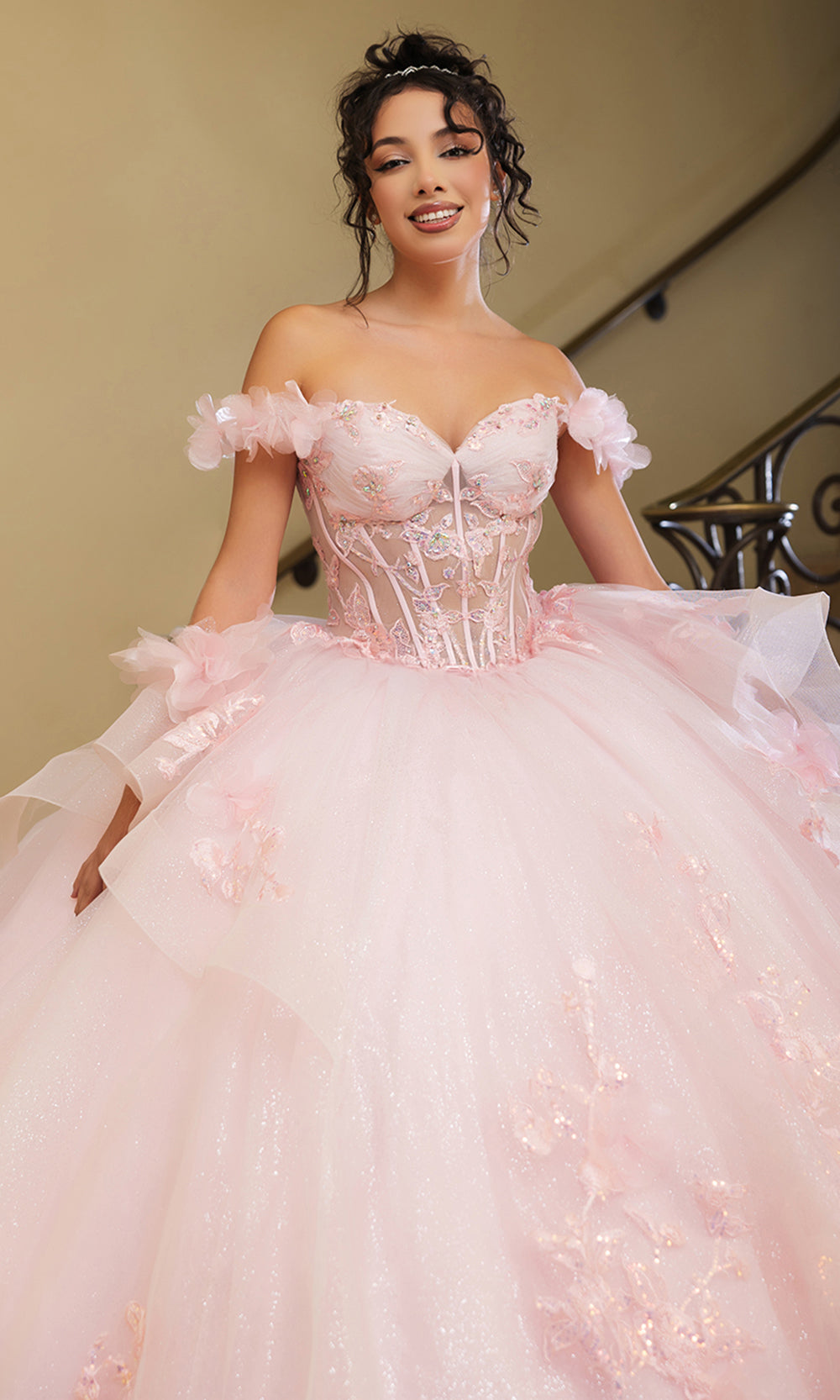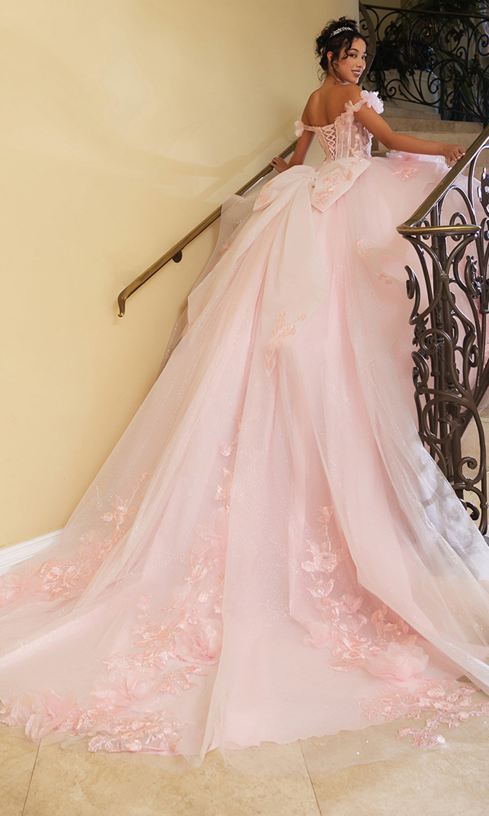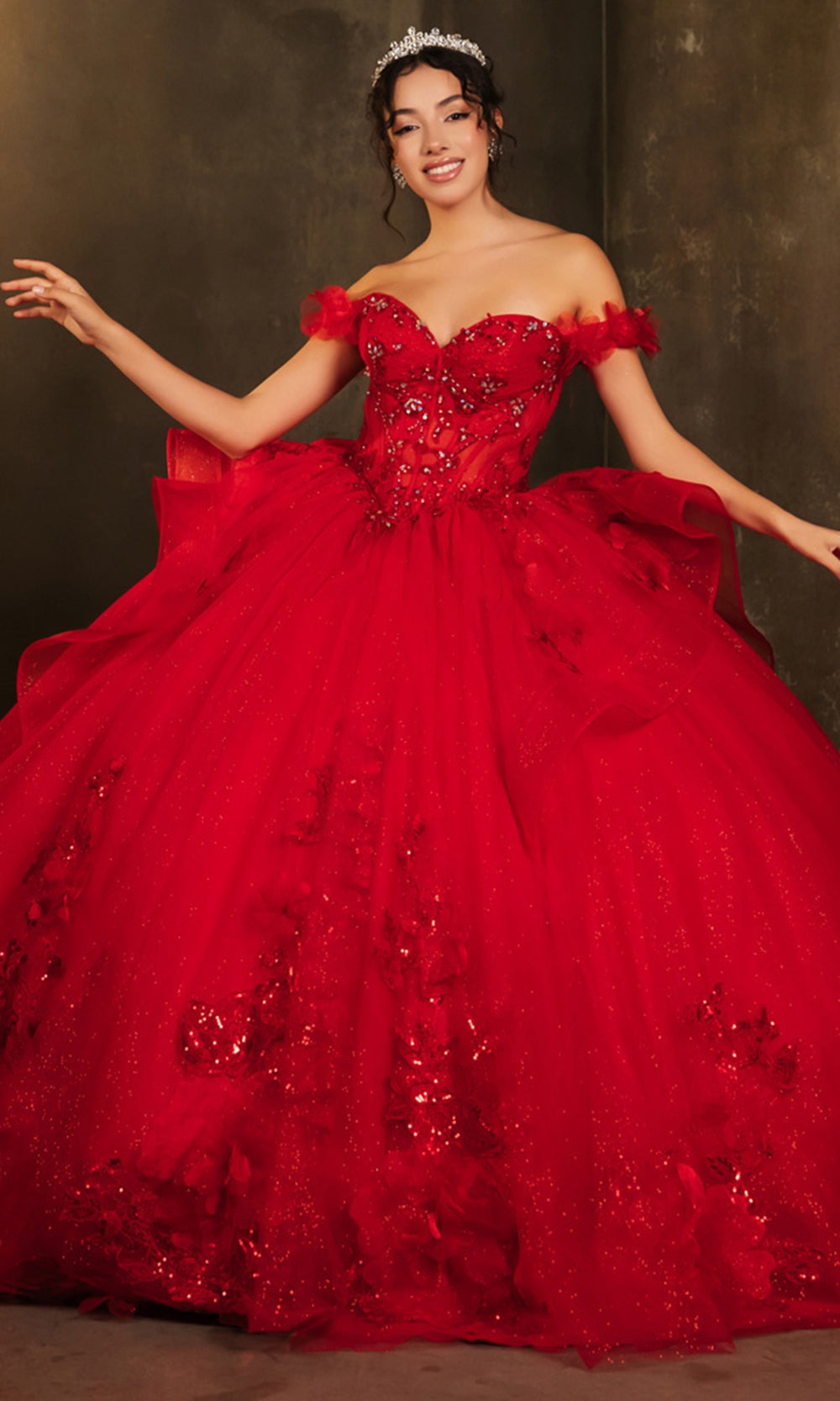 For a fairytale moment, May Queen LK270 is a ballgown that captivates with every detail. With an enchanting sweetheart neckline and off-shoulder sleeves, this gown is beautifully adorned with floral embroidery, shimmering beads, and ethereal 3D flowers for a truly romantic look. Its illusion corset bodice provides structure and shape, enhancing the waist before cascading into a voluminous ballgown skirt. Glitter embellishments throughout the gown add a touch of sparkle, making this gown ideal for quinceaneras, sweet sixteens, or grand galas. Make a dreamy impression with May Queen LK270. Models are wearing Pink, Rosegold, and Red colors.
