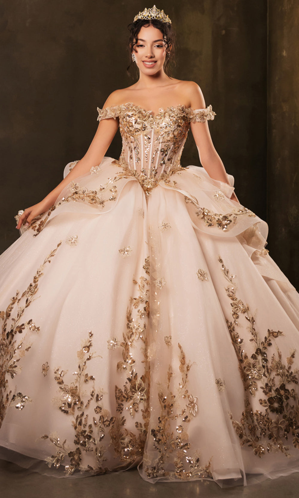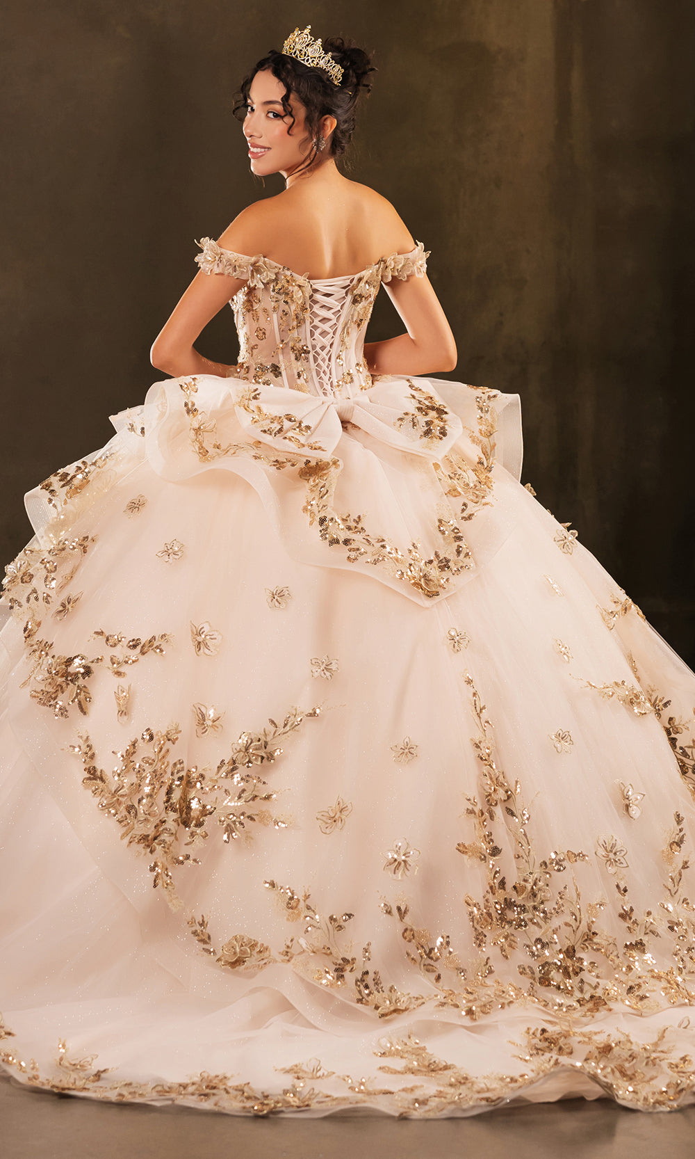 The May Queen LK271 is a regal creation designed to bring a fairy-tale vision to life. Featuring an illusion corset-style bodice decorated with 3D floral appliques and shimmering sequin embroidery, this ballgown ensures you feel like royalty. The voluminous layered skirt, paired with a lace-up back and a statement oversized bow, exudes grandeur and timeless elegance. Whether for a quinceanera or a grand gala, the May Queen LK271 transforms any occasion into a magical moment where elegance reigns supreme. Model is wearing Blush/Gold color.