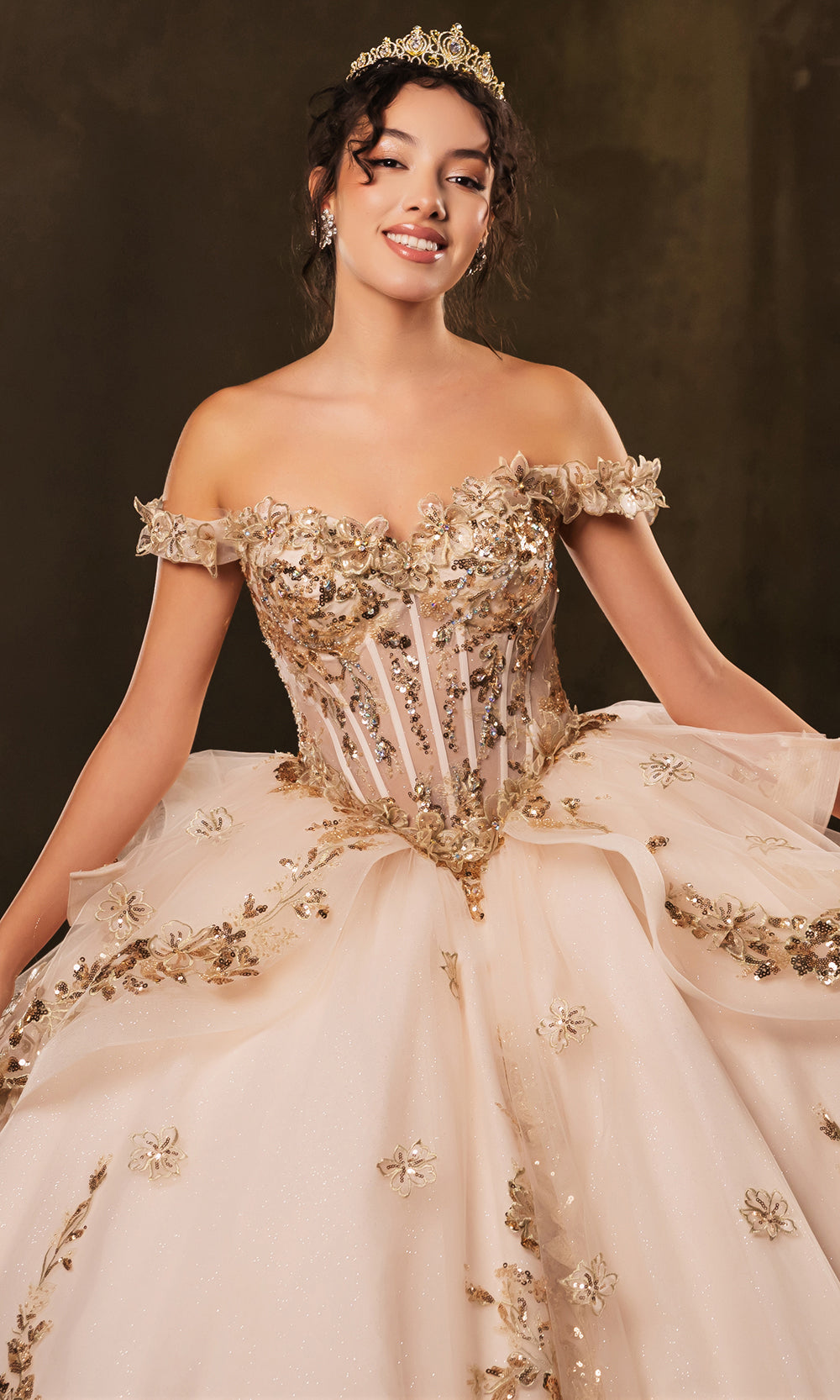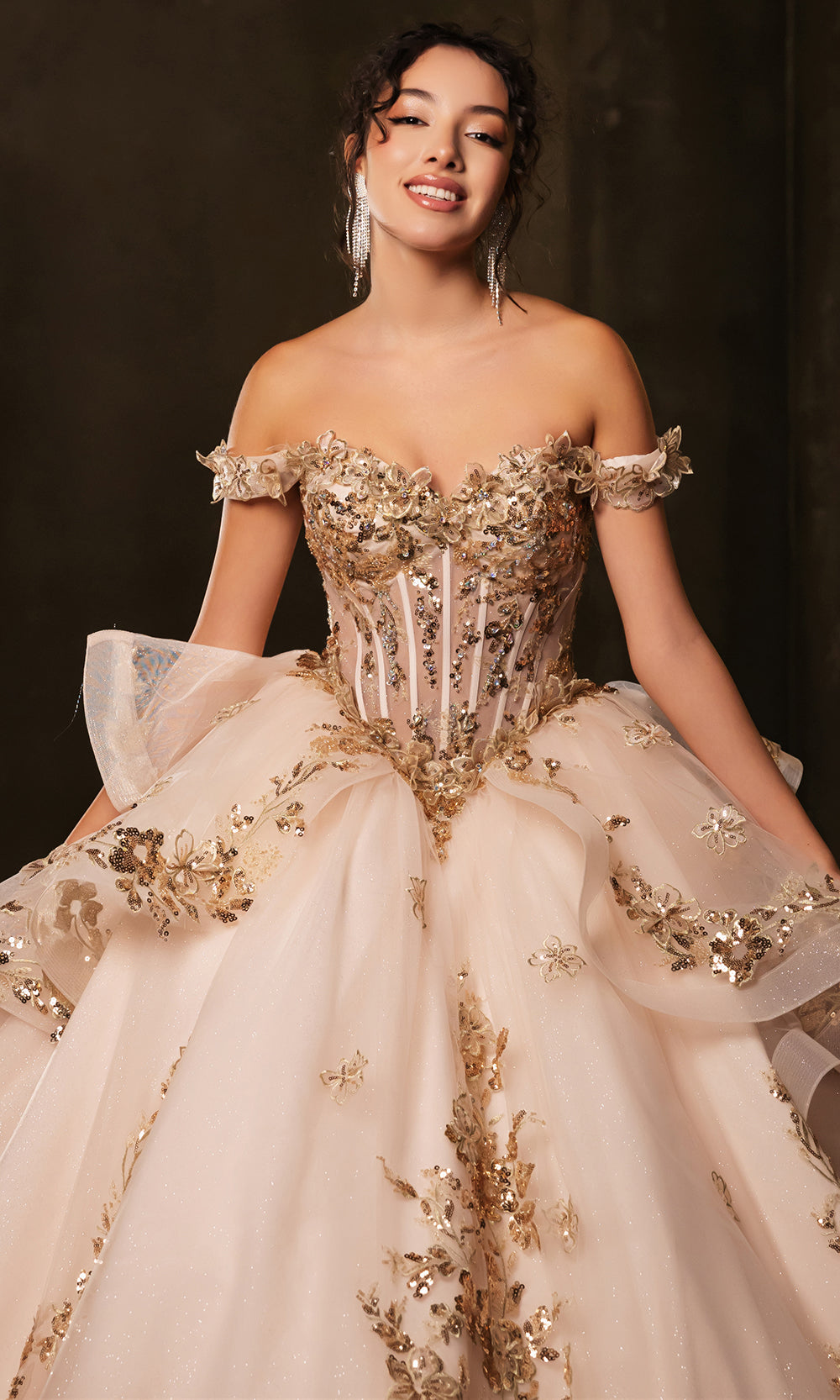 | Details: | Illusion Corset Bodice, 3D Floral Appliques, Sequin Details, Lace-Up Back, Layered Skirt, Bow Accent |