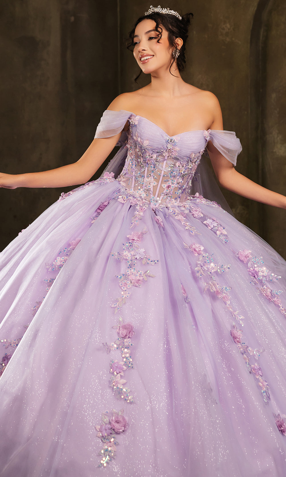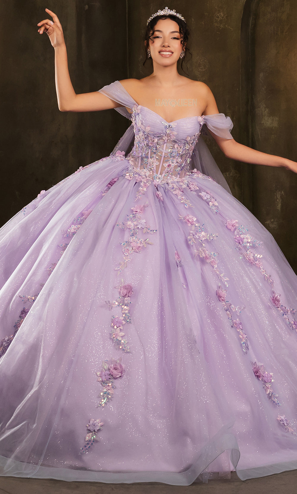 Step into a whimsical dream with the May Queen LK276, a gown crafted for fairytale moments. A dreamy sweetheart neckline, graceful off-shoulder sleeves, and a sheer attached cape enhance the regal charm of this ballgown. The mesmerizing combination of embroidery, beaded embellishments, and 3D floral appliques creates a show-stopping look. The sheer corset bodice highlights your silhouette, while the floral embellishments add a touch of nature beauty. Ideal for making a magical entrance, the May Queen LK276 is an enchanting choice for your next unforgettable celebration. Model is wearing Lilac/Multi color.