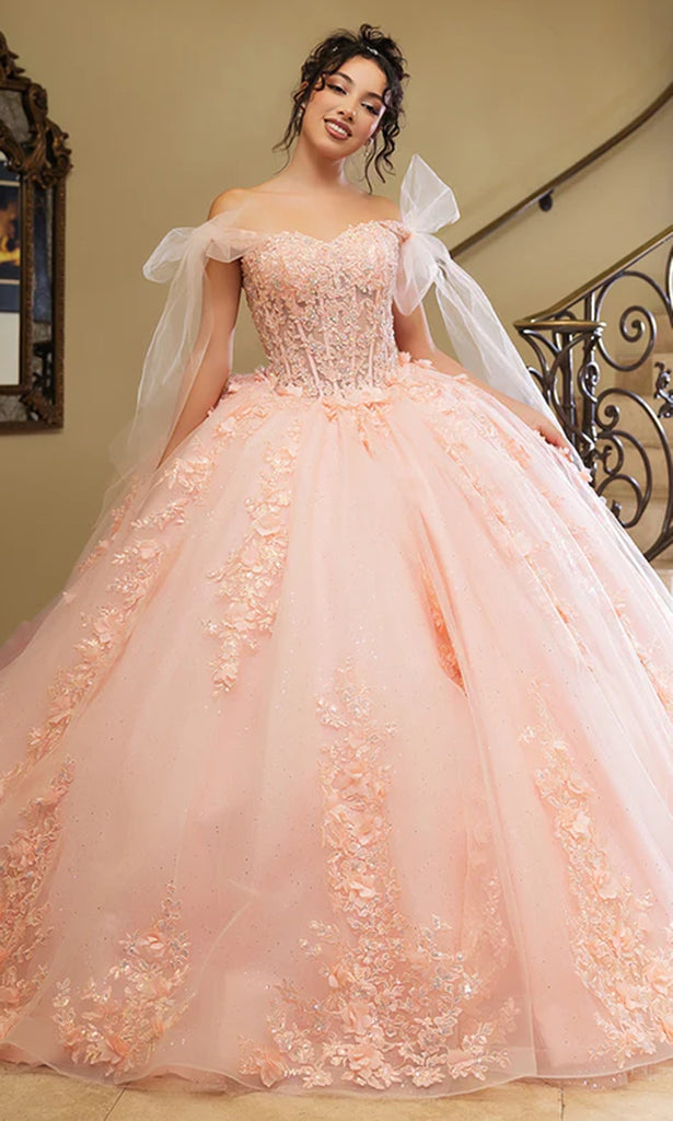 Capture every gaze with the dramatic beauty of this May Queen LK280 masterpiece. The ballgown captivates with softly tied off shoulder sleeves and a sweetheart neckline that highlights elegance. The fitted bodice features sheer elements and sparkling beaded embellishments, flowing into a voluminous skirt adorned with 3D floral details that captivates with every step. A lace up back allows a personalized fit while the sweeping train enhances grandeur. The May Queen LK280 ensures a breathtaking entrance that reflects beauty and sophistication for an unforgettable celebration. Models are wearing Blush, and Champagne/Gold colors.