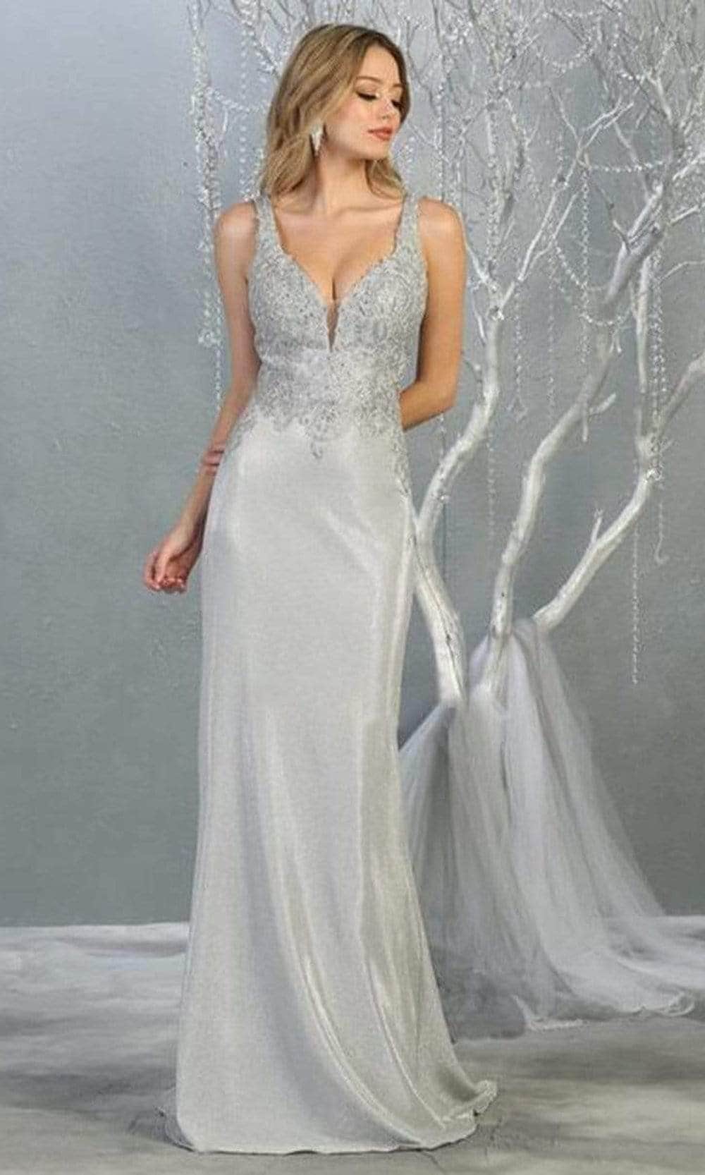 This long dress features a sleeveless, deep V-neckline with fitted bodice ornate with embellishments. The dress fashions a flattering trumpet skirt and runs at full length hem. Models are wearing the Gold and Silver colors.